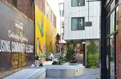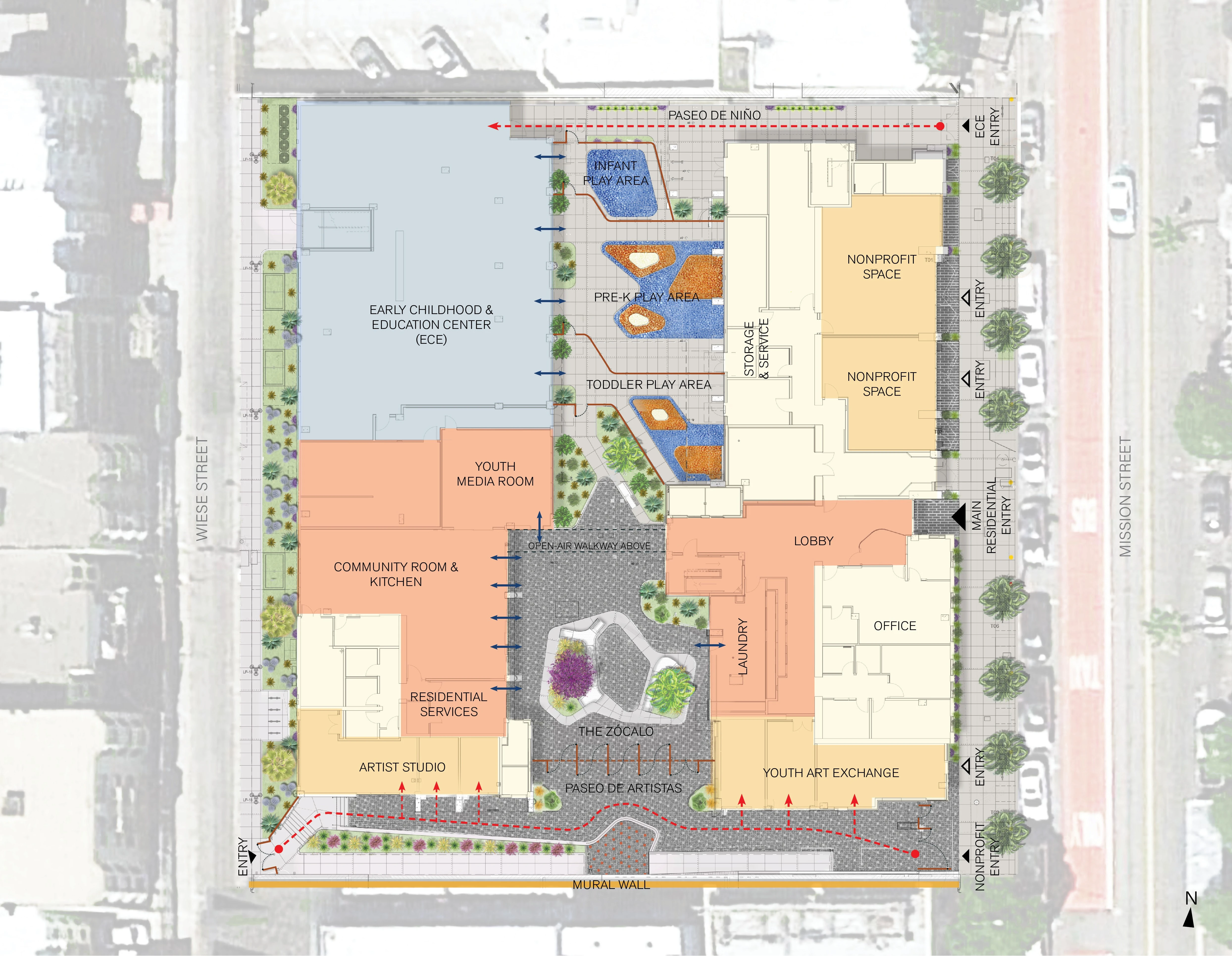 The Zócalo, or central courtyard, links shared amenities such as the community room, kitchen, laundry room, and youth media lab. It’s also an extended living room for residents to connect and socialize. It opens to the Paseo de Artistas, a new mid-block passage lined with low-cost artist studios and space for the Youth Art Exchange. The Paseo functions as an outdoor workshop and gallery featuring a three-story mural by local artists, and continues the network of plazas and alleyways that characterize the Mission District. The connected Zócalo and Paseo de Artistas host social events, performance art classes, and festivals.