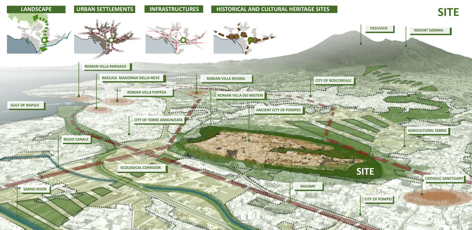 The project site is located in the municipality of Pompeii, in the province of Naples and is surrounded by many infrastructures: the Naples-Pompeii-Salerno highway, the Naples-Salerno railway and the two lines of the Circumvesuviana railway. The site, located in the plain of the Sarno river, within the territorial system of the Vesuvian coast, is characterized by historical, landscape and environmental singularities of great value. The "Somma-Vesuvius" mountain system is located in the “Vesuvius National Park” and is characterized by the current volcano, the Vesuvius, and the Monte Somma, the remains of the ancient volcano after the eruption.