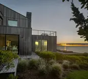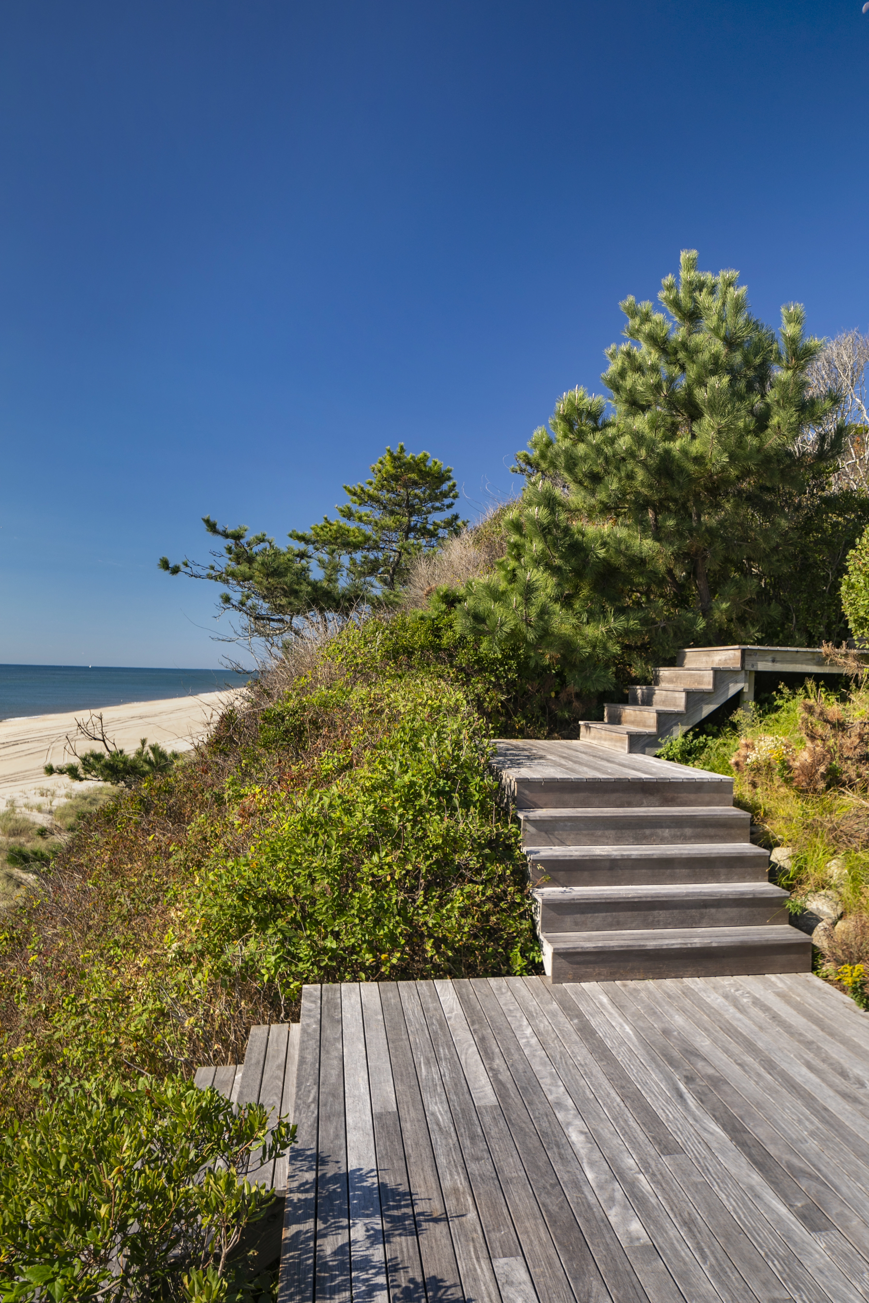 The boardwalks were designed with natural, untreated wood left to weather, echoing the silver hues of the adjacent salty, windblown landscape. Circulation of the property is limited to these elevated walks, preserving the sensitive bluff from disruption. The deck board spacing allows water infiltration and vegetation to grow underneath further promoting slope and soil stabilization.