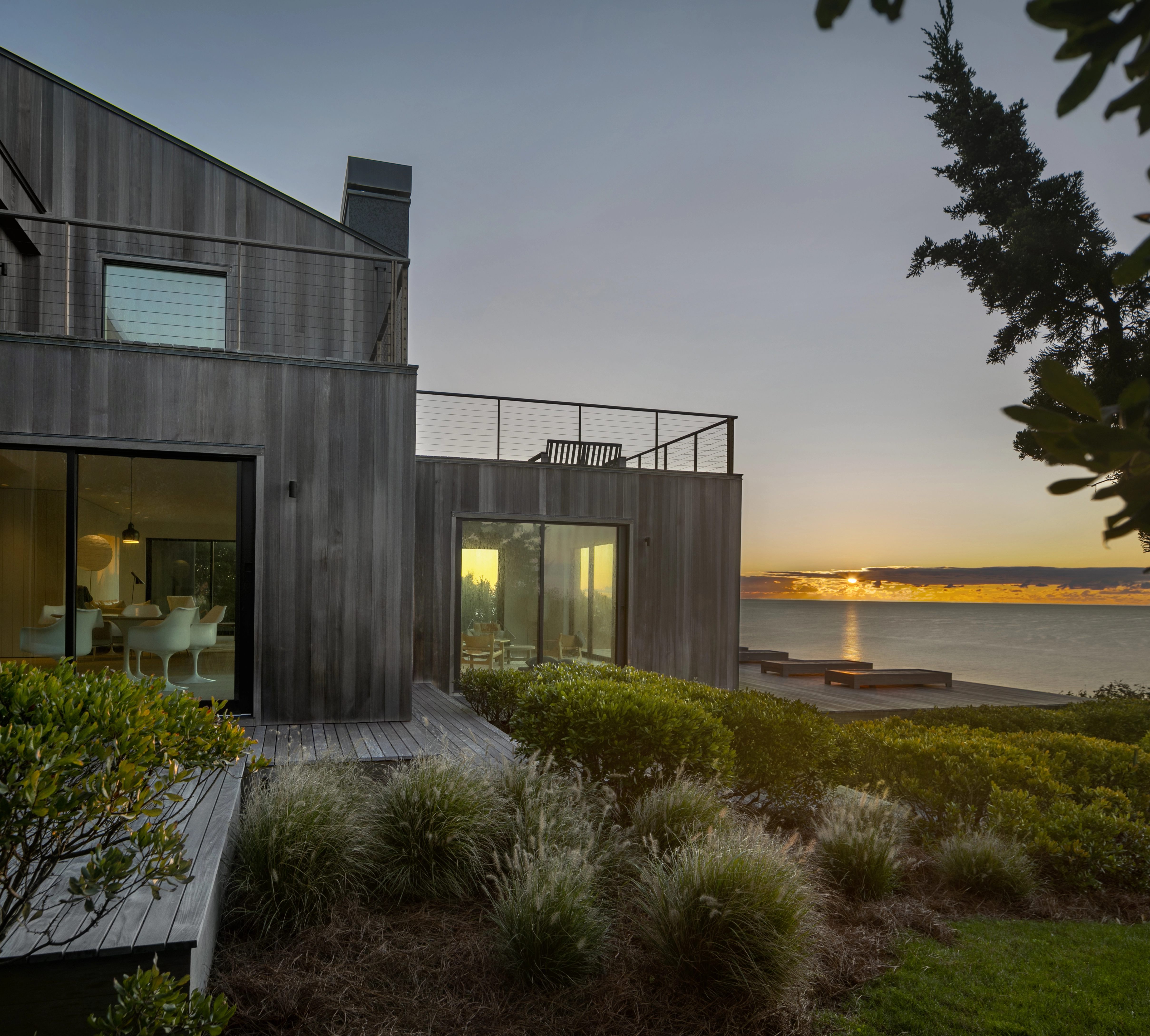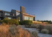 A green roof, overtop the garage and entry way, helps disguise and integrate the architecture into the landscape. The green roof plantings utilize native grasses including, Little Bluestem and Pennsylvania sedge. These self-sustaining plants, native to the Montauk Bluffs, are in keeping with the projects goal of reducing maintenance and upkeep.