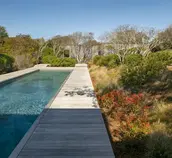 The house renovation included a facade of glass overlooking the swimming pool, which was designed with sculptural intent to reflect its lush native surroundings. A planting palette of Shad trees, Bayberry, Winter Berry, Inkberry, and massing’s of Switch Grass, Little Bluestem and Dwarf Fountain Grasses were used to enhance and stabilize the bluff. These all work together to additionally provide not only a pleasing aesthetic, but also offers habitat and forage for the migrating bird population.