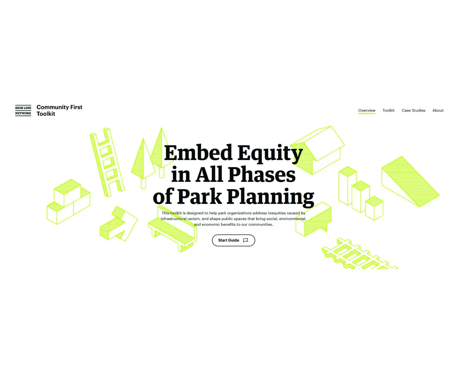 Landscapes sit at the intersection of some of today’s most critical issues: 1) uneven access to quality public spaces, often along lines of race, class, and ethnicity; 2) underutilized, disconnected, or abandoned infrastructures from shifting industries and investment patterns; and 3) ever-increasing needs for spaces that support environmental resilience and social connection. The Community First Toolkit (CFT) was developed for the High Line Network, a program of Friends of the High Line that convenes equity-focused landscape organizations. The New York High Line is widely regarded as both an icon of landscape design and a symbol of “green gentrification.” Building on lessons learned, the CFT’s core message is that parks and public spaces are not incidental to broader issues of equity and access - they can be drivers of equitable community development. The Toolkit breaks down why, for whom, and how public realm projects can mitigate the negative impacts of past developments while ensuring positive outcomes for as many people as possible, particularly for those previously harmed.