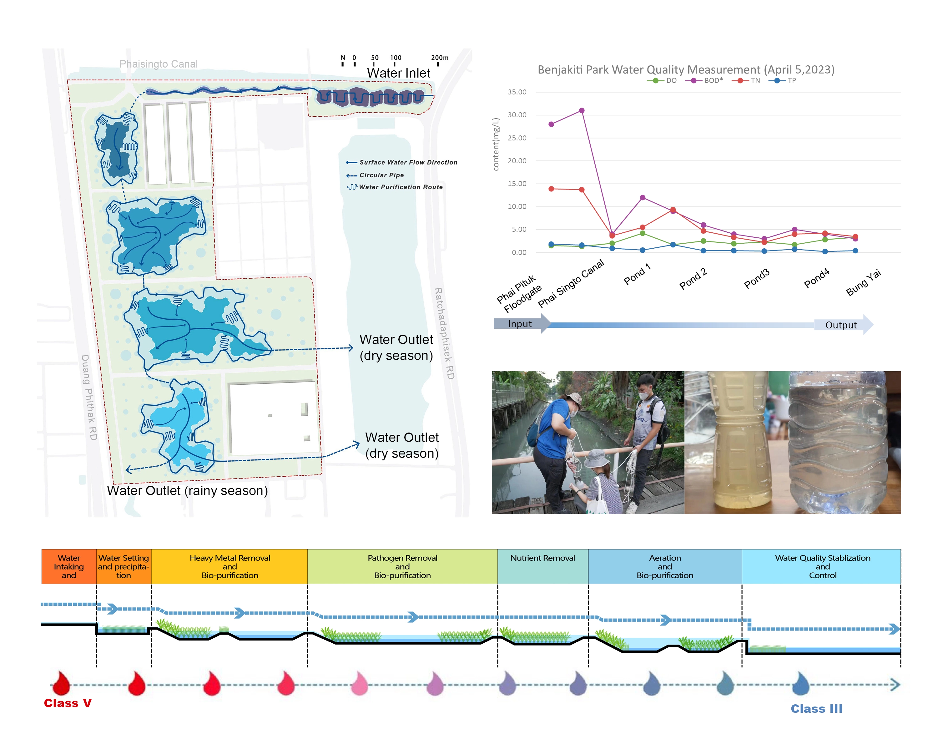Bangkok is a densely populated city. The region experiences a monsoon climate with an average precipitation of about 1500 mm per year. The effects of global warming have resulted in increased flood risk due to Bangkok’s low elevation. The 102-acre site was formerly a tobacco factory. The budget was limited and was overseen by the army and did not have extensive experience or skills in building landscape projects.