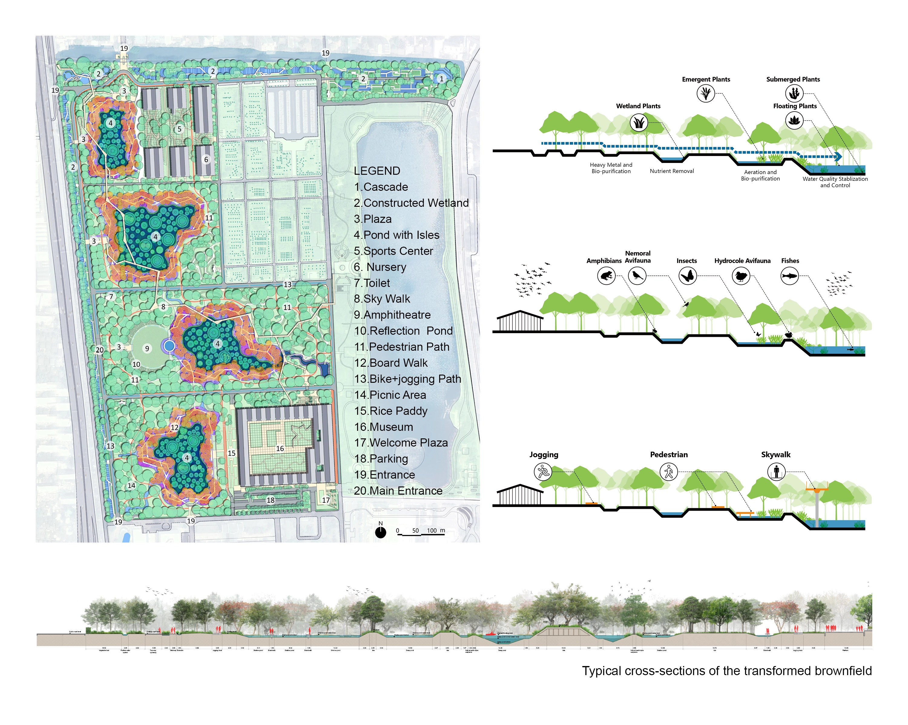 Reuse and recycle: All existing trees on site were preserved and integrated into the park design. Existing factory buildings were repurposed to house the sports center and museum. The demolished concrete materials were recycled for the earthwork foundation and paving.