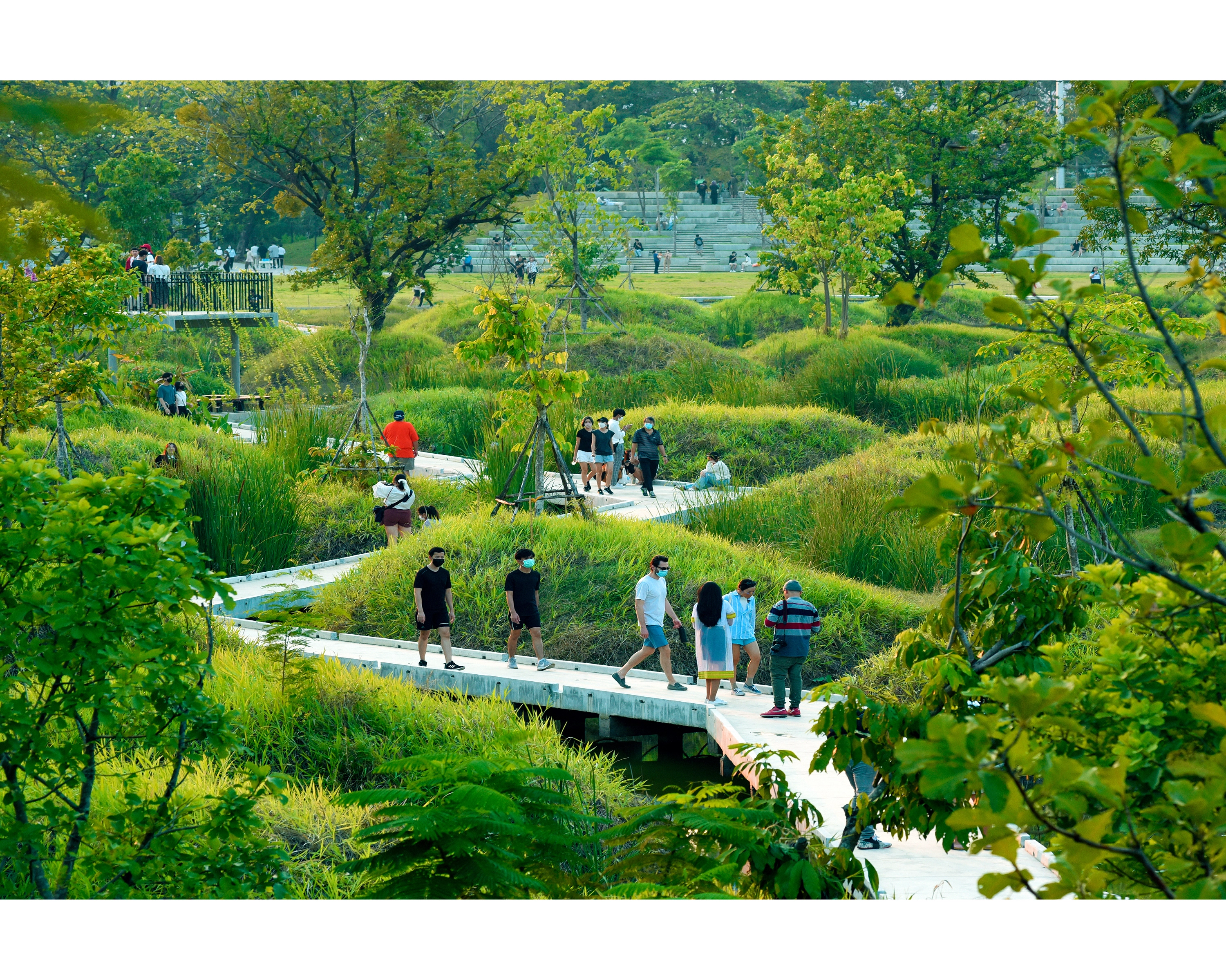 In addressing the multiple challenges of the site, the project was envisioned as a central park capable of providing holistic ecosystem services to the city, including a demonstration of a nature-based solution for urban flood control, as well as providing badly needed public space for daily recreational activities and other cultural services. Three strategies guided our work to meet these objectives: