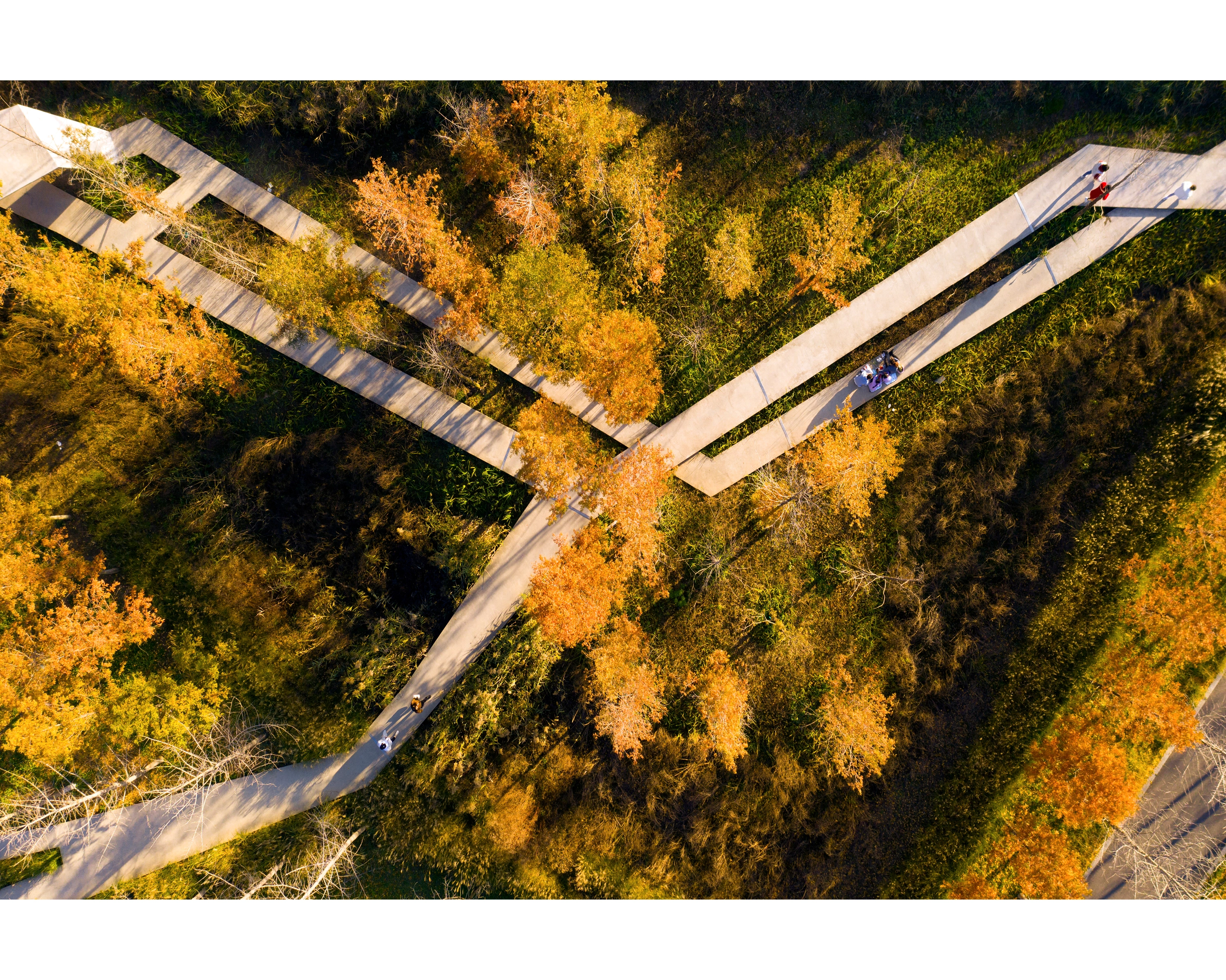 (4) Path Network: An intricate path network, raised above ground and weaving through tall grass, offers a nature-immersive experience. The paths, made of prefabricated concrete slates, are designed for efficient installation and aesthetic variation.