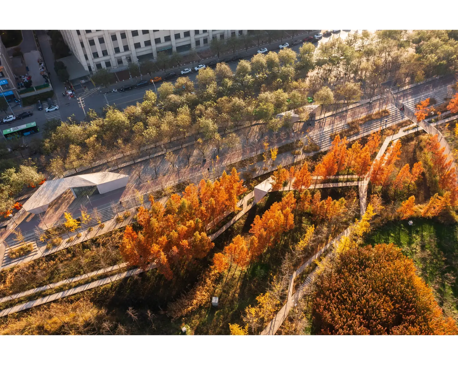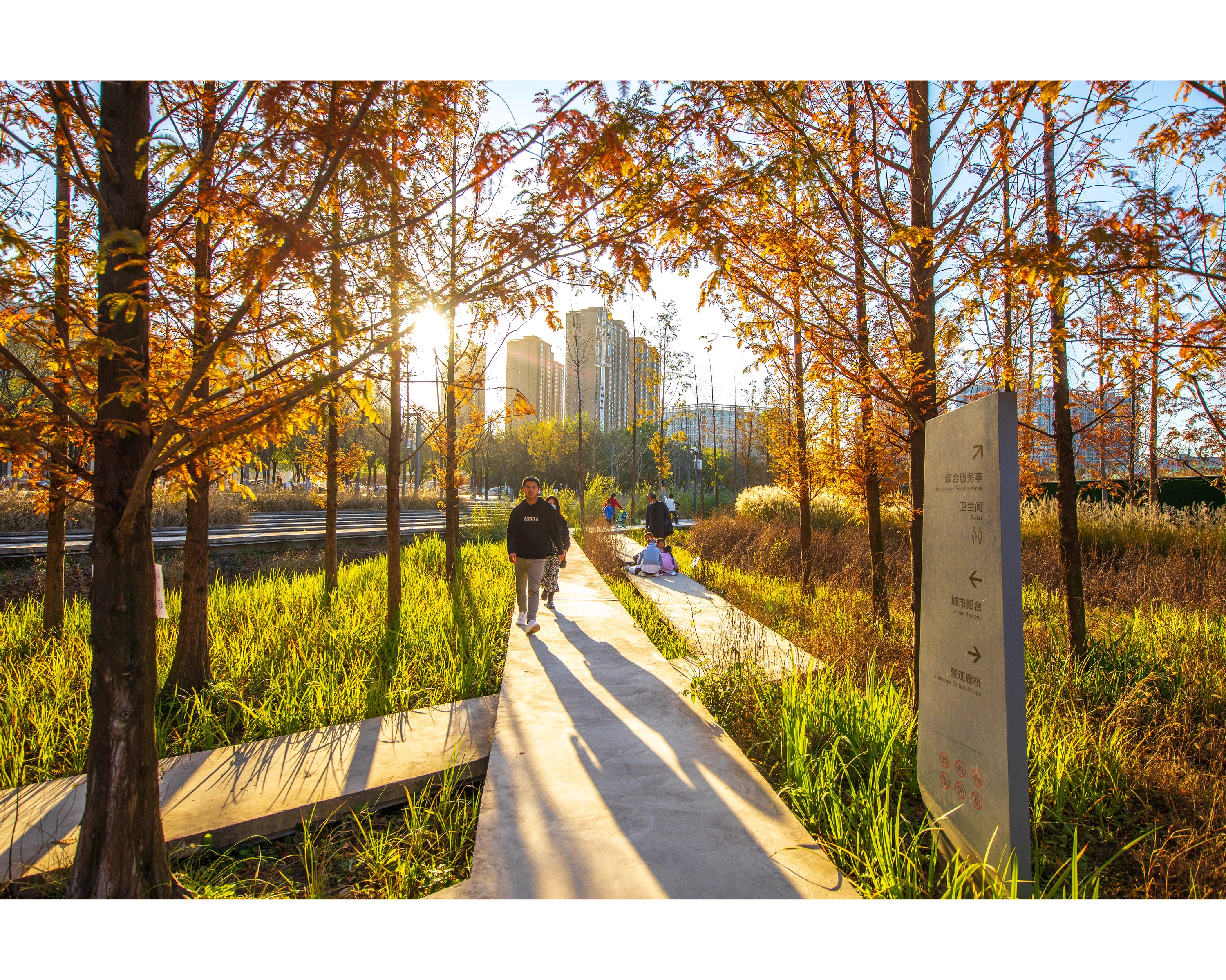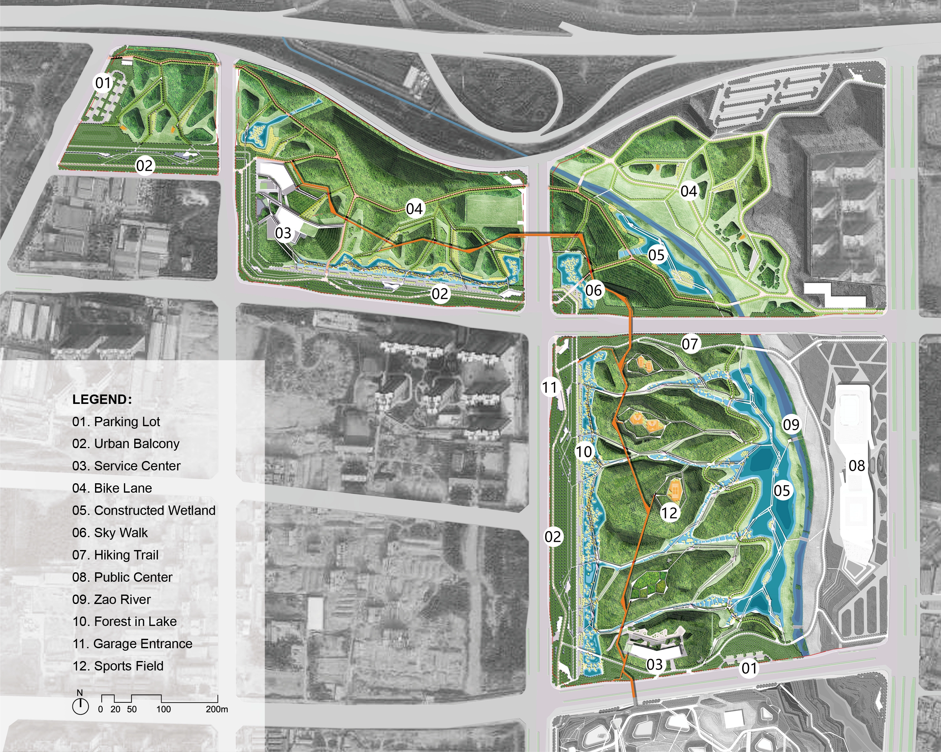 (1) Urban Balcony: A 50-meter-wide balcony stretches over 1500 meters along the western edge, featuring permeable gravel and 20,000 Poga Trees for shade. Amenities include pavilions, playgrounds, and modular, colorful fiberglass seating, encouraging diverse community activities. The balcony serves as a communal living room, hosting a variety of activities from Tai Chi to evening social gatherings.