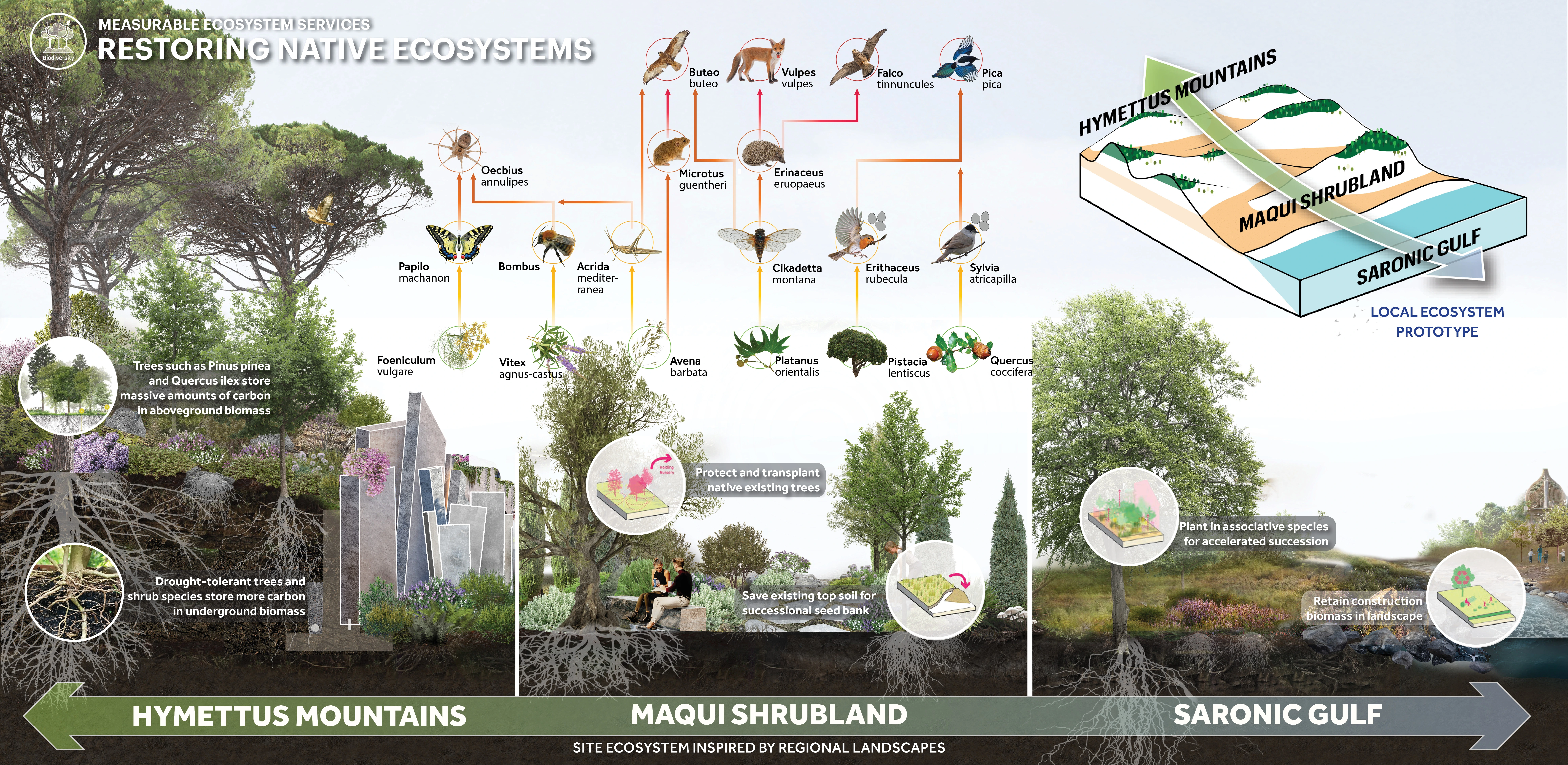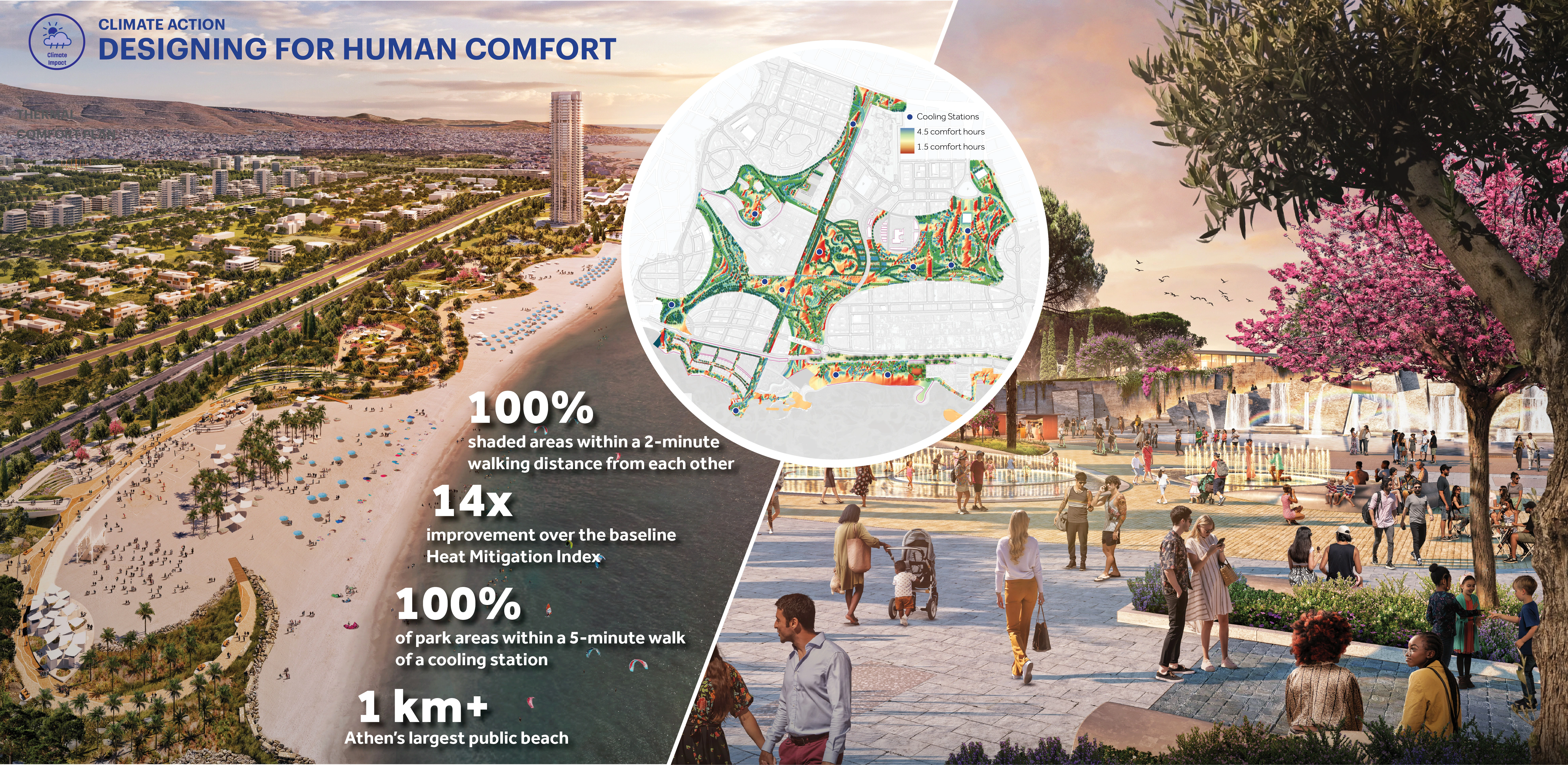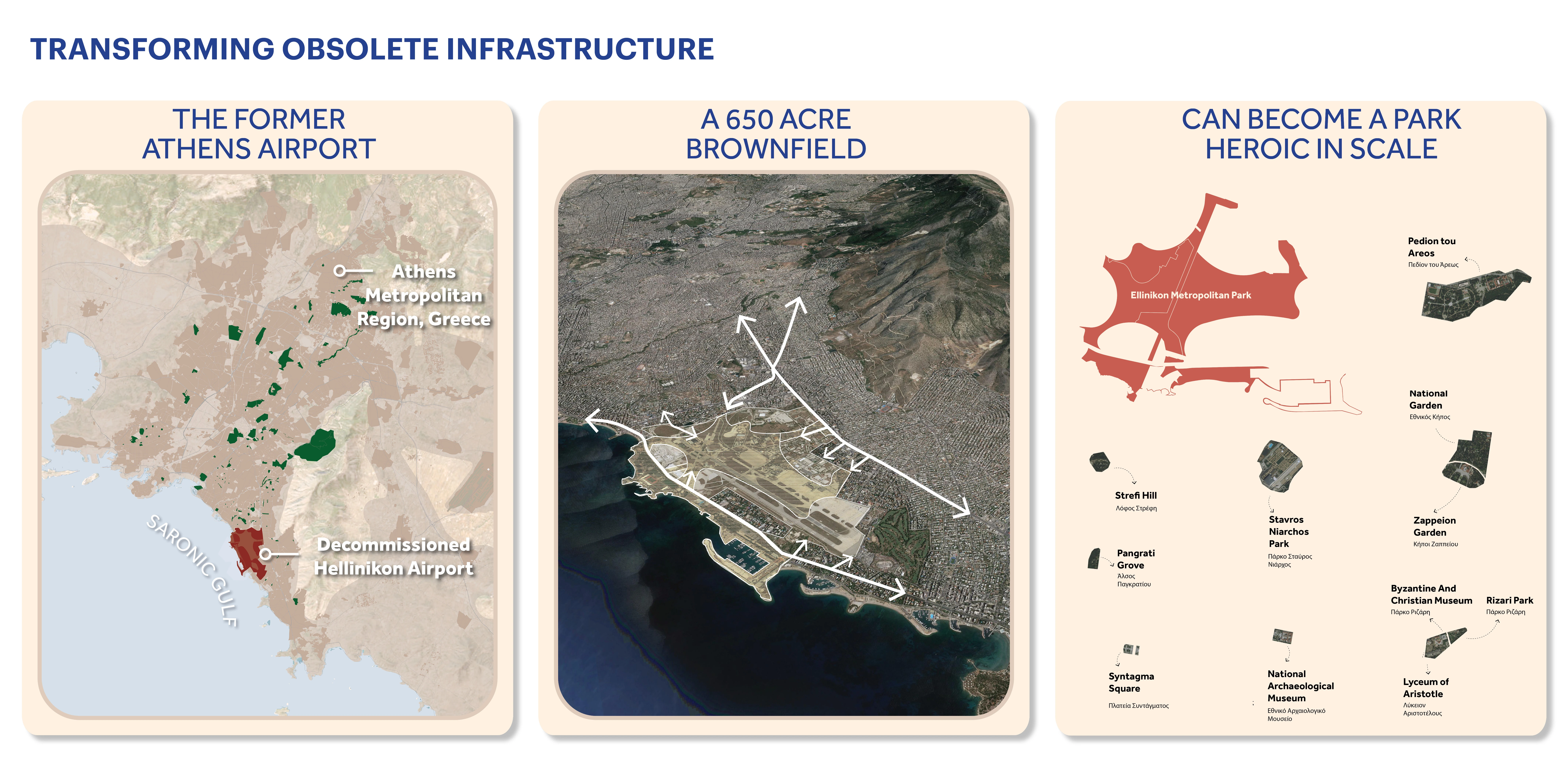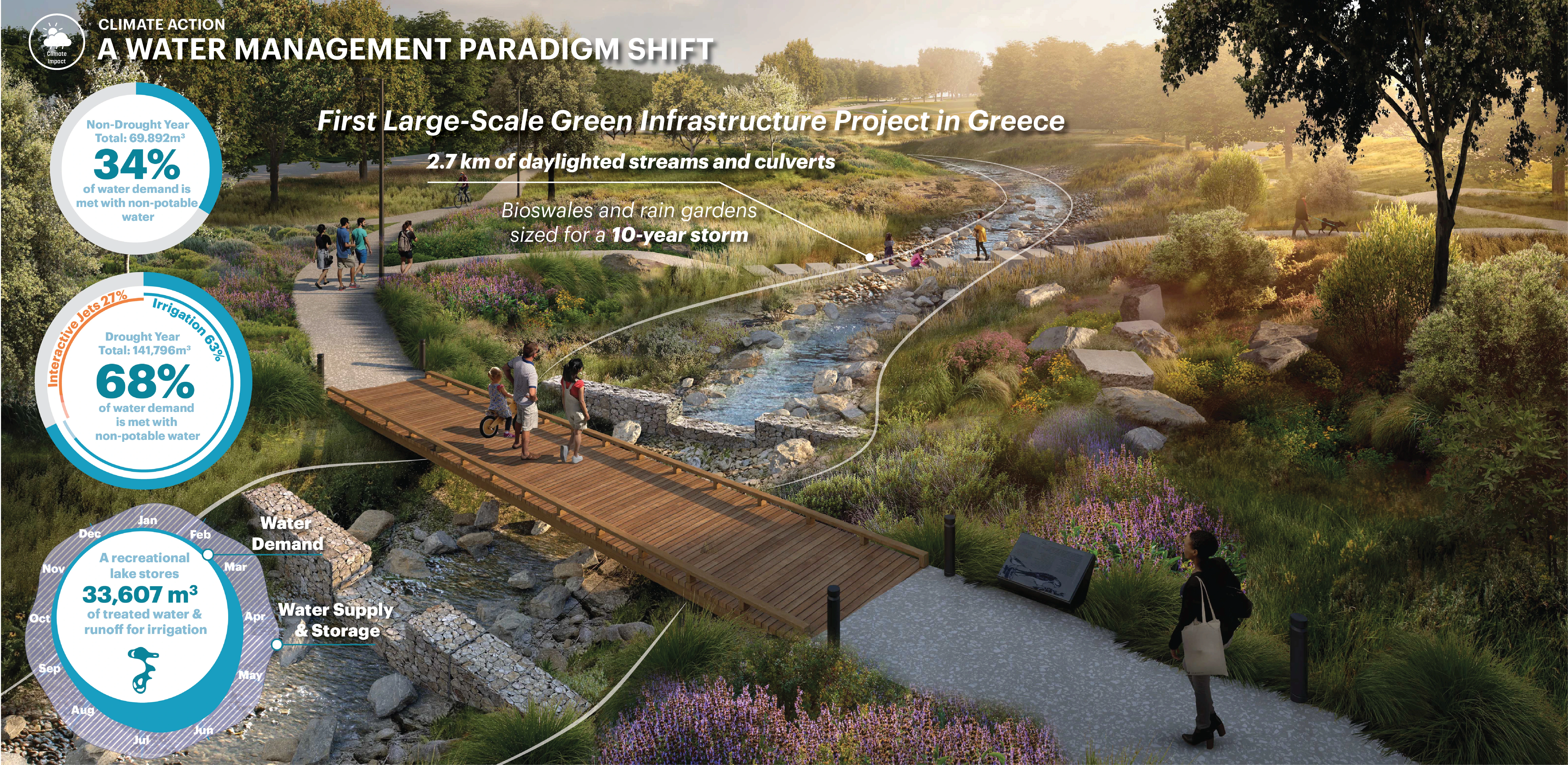 The planning of the 650-acre Ellinikon Park began with a climate action goal-setting exercise and prioritization workshop. Through the use of benchmarking and interactive digital tools, the team convinced the client to pursue ambitious climate action goals, including planning for a carbon-positive, low-water use landscape, and creating an urban heat refuge. This commitment enabled supplemental field investigations, including extensive soil and concrete testing and field surveys of established vegetation across the decommissioned Athens International Airport site. Carbon goals proved particularly challenging at the onset when the design team created datasets with local Mediterranean ecosystem parameters, including a low-carbon sequestration and storage capacity biome, and local material Environmental Product Declarations. Through rounds of design iteration, testing, and advancement from planning to technical design phases, the park was able to achieve a projection of carbon neutrality in 35 years, a 45% decrease in embodied carbon, and an expectation of ~40,000 MTCO2e (metric-tons CO2 equivalent) additional carbon sequestered when the landscape achieves carbon carrying capacity. Key carbon reduction strategies included soil amendments and reuse, material reuse, afforestation, and minimizing new concrete applications. Repurposing of the existing airport runways enabled the reuse of approximately 150,000m3 of existing demolition material. Some materials are refinished in place; some are used in clean fill, crushed road base, or rip-rap; and some are upcycled as paving, benches, and retaining walls as a substitution for precast concrete. The planning process also included a full energy modeling study to size an on-site solar farm to offset operational energy. Maintenance manuals include specifying an all-electric fleet of vehicles and equipment, a commitment to organic horticulture, and integrated pest management practices. Irrigation is provided through reclaimed water sourced from sewage mining, with ~70% of the park dedicated as an ‘establishment-only irrigation zone’ and allowed to naturalize. A large-scale afforestation approach further supports carbon sequestration and urban heat island mitigation goals. The plant list—which includes over 3.3 million trees, shrubs, geophytes, and herbaceous material—was carefully considered based on native status, adaptability to local climatic conditions, and cultural connections and traditions. Given recent heat emergencies in Athens, and the projection for the city to see an average warming of +5.4°C by the end of the century, Ellinikon Park is designed as an urban heat refuge. The design team added strategically placed cooling stations, from water walls to misting stations within a 5-minute walk from anywhere within the park. The park also includes the largest public beach in Athens–a 1-kilometer-long, transit-served coastal front for an urban population that today must drive south or east beyond city limits to access high-quality public beaches. The Ellinikon Park and its waterfront will increase the allocation of open space per Athenian by 44%. This park is historic in ambition and service. It serves as a pivot from years of financial crisis and as an example of the future of Europe’s public spaces by providing an extraordinary public amenity with quality natural areas, play spaces, and recreational programs for an economically diverse and resilient community.