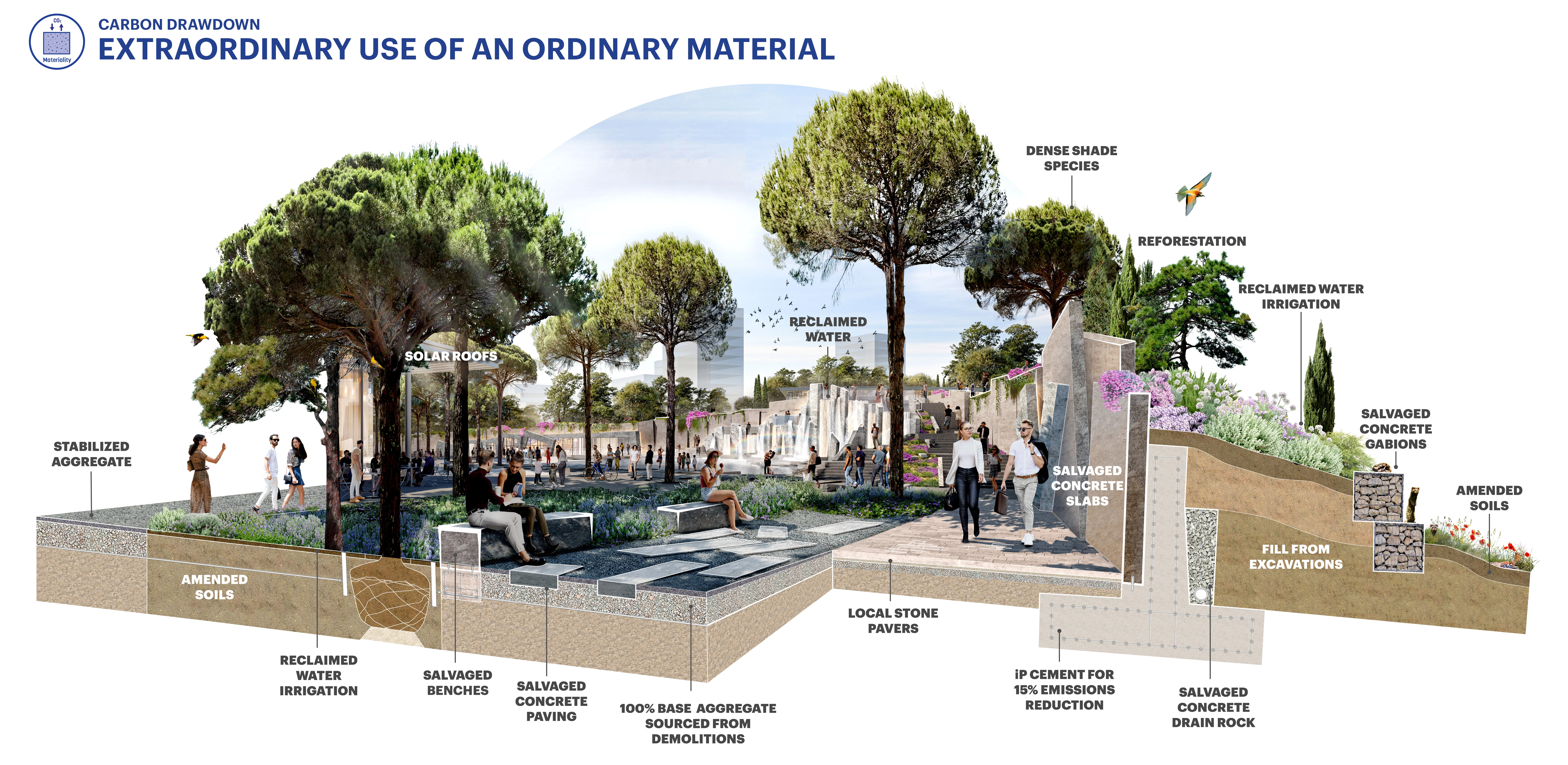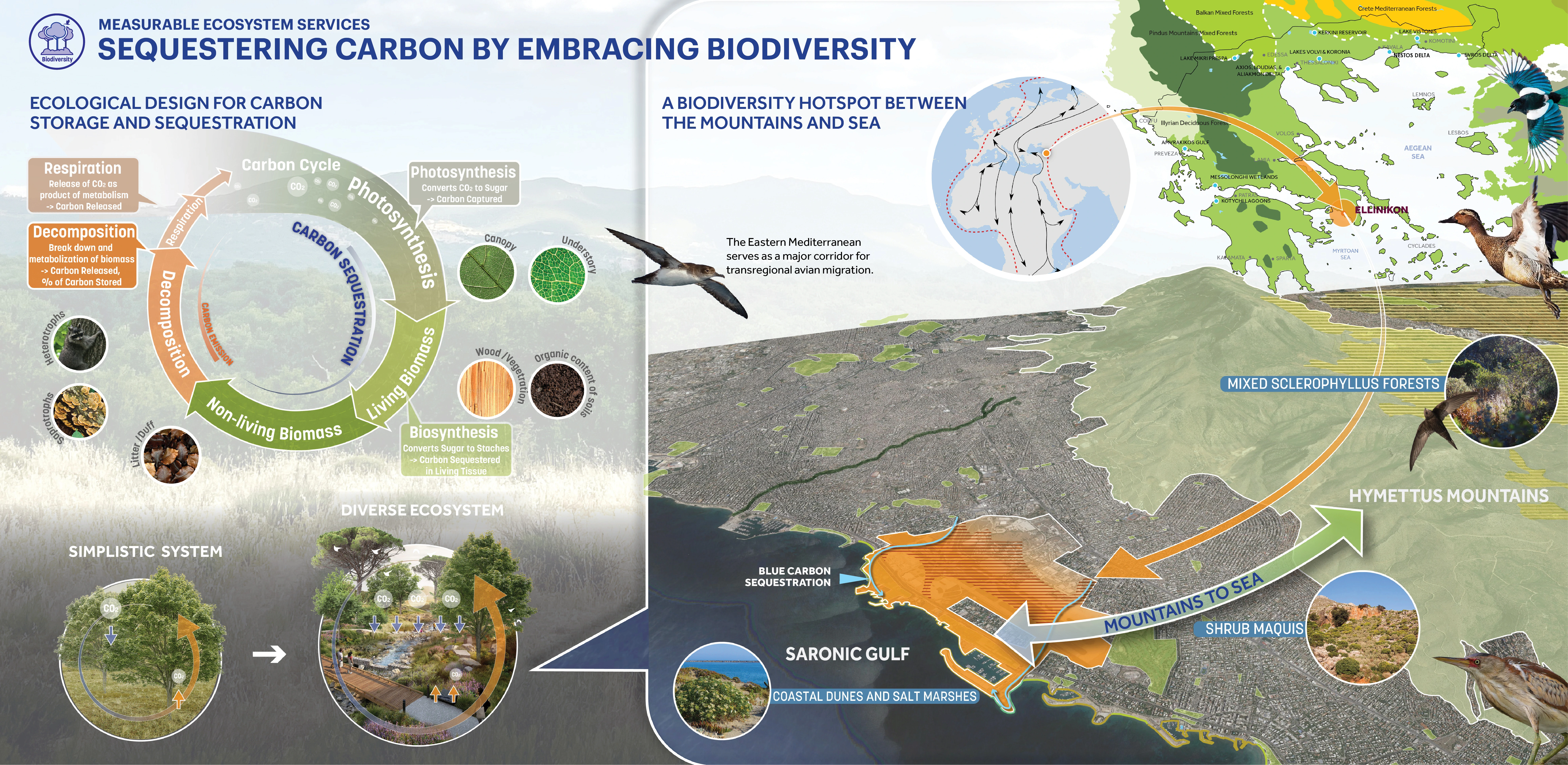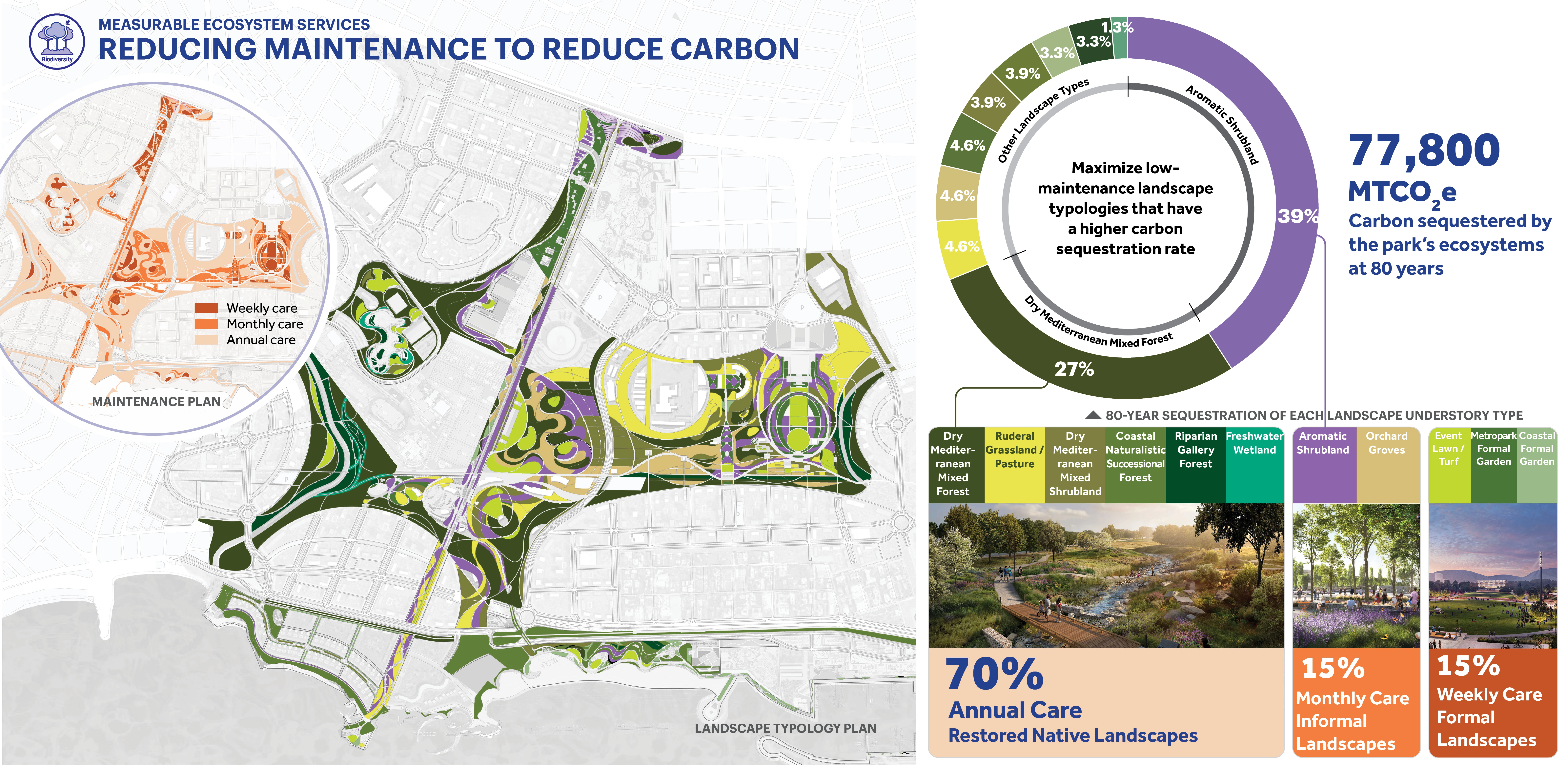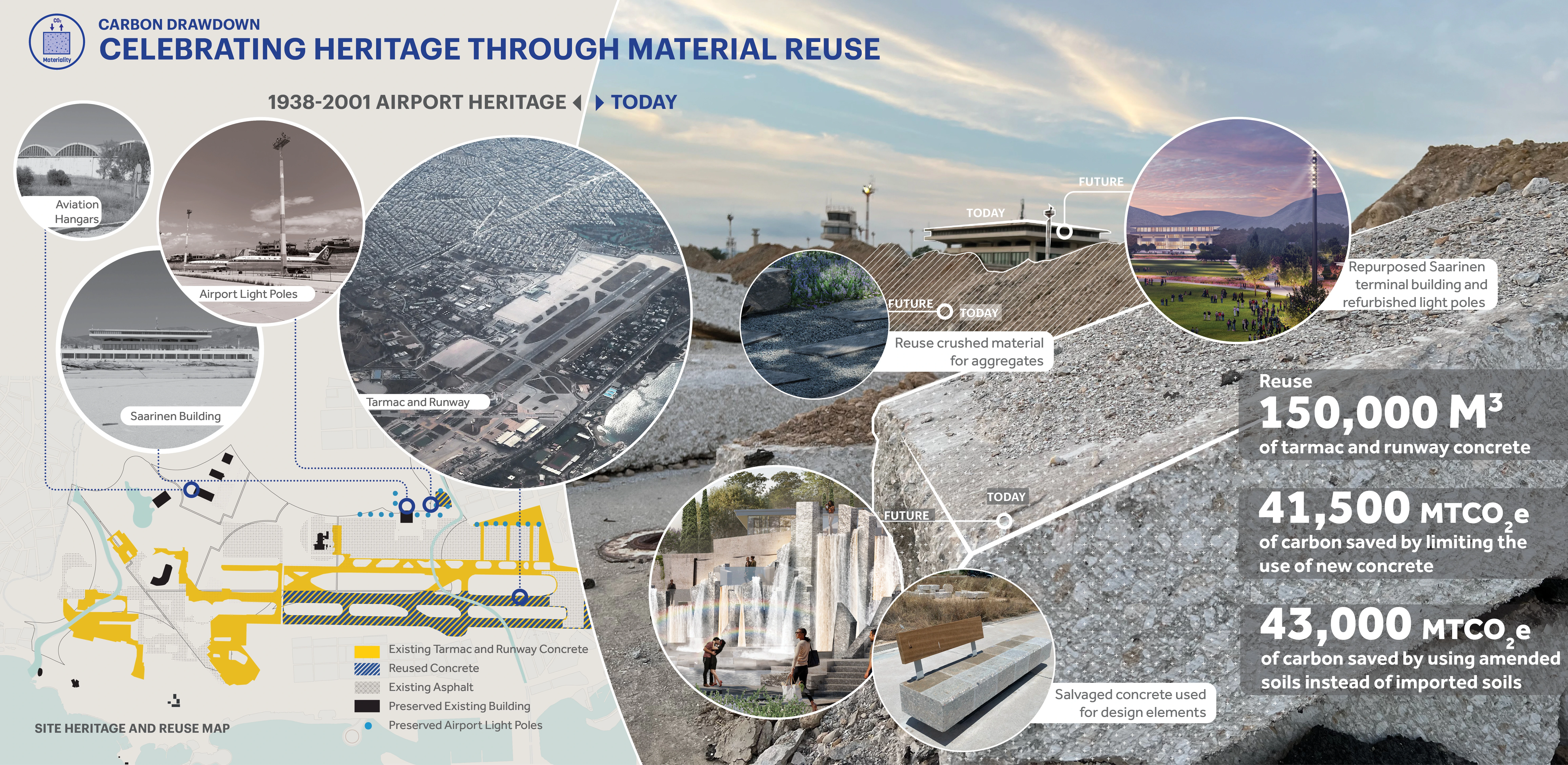 The planning of the 650-acre Ellinikon Park began with a climate action goal-setting exercise and prioritization workshop. Through the use of benchmarking and interactive digital tools, the team convinced the client to pursue ambitious climate action goals, including planning for a carbon-positive, low-water use landscape, and creating an urban heat refuge. This commitment enabled supplemental field investigations, including extensive soil and concrete testing and field surveys of established vegetation across the decommissioned Athens International Airport site. Carbon goals proved particularly challenging at the onset when the design team created datasets with local Mediterranean ecosystem parameters, including a low-carbon sequestration and storage capacity biome, and local material Environmental Product Declarations. Through rounds of design iteration, testing, and advancement from planning to technical design phases, the park was able to achieve a projection of carbon neutrality in 35 years, a 45% decrease in embodied carbon, and an expectation of ~40,000 MTCO2e (metric-tons CO2 equivalent) additional carbon sequestered when the landscape achieves carbon carrying capacity. Key carbon reduction strategies included soil amendments and reuse, material reuse, afforestation, and minimizing new concrete applications. Repurposing of the existing airport runways enabled the reuse of approximately 150,000m3 of existing demolition material. Some materials are refinished in place; some are used in clean fill, crushed road base, or rip-rap; and some are upcycled as paving, benches, and retaining walls as a substitution for precast concrete. The planning process also included a full energy modeling study to size an on-site solar farm to offset operational energy. Maintenance manuals include specifying an all-electric fleet of vehicles and equipment, a commitment to organic horticulture, and integrated pest management practices. Irrigation is provided through reclaimed water sourced from sewage mining, with ~70% of the park dedicated as an ‘establishment-only irrigation zone’ and allowed to naturalize. A large-scale afforestation approach further supports carbon sequestration and urban heat island mitigation goals. The plant list—which includes over 3.3 million trees, shrubs, geophytes, and herbaceous material—was carefully considered based on native status, adaptability to local climatic conditions, and cultural connections and traditions. Given recent heat emergencies in Athens, and the projection for the city to see an average warming of +5.4°C by the end of the century, Ellinikon Park is designed as an urban heat refuge. The design team added strategically placed cooling stations, from water walls to misting stations within a 5-minute walk from anywhere within the park. The park also includes the largest public beach in Athens–a 1-kilometer-long, transit-served coastal front for an urban population that today must drive south or east beyond city limits to access high-quality public beaches. The Ellinikon Park and its waterfront will increase the allocation of open space per Athenian by 44%. This park is historic in ambition and service. It serves as a pivot from years of financial crisis and as an example of the future of Europe’s public spaces by providing an extraordinary public amenity with quality natural areas, play spaces, and recreational programs for an economically diverse and resilient community.