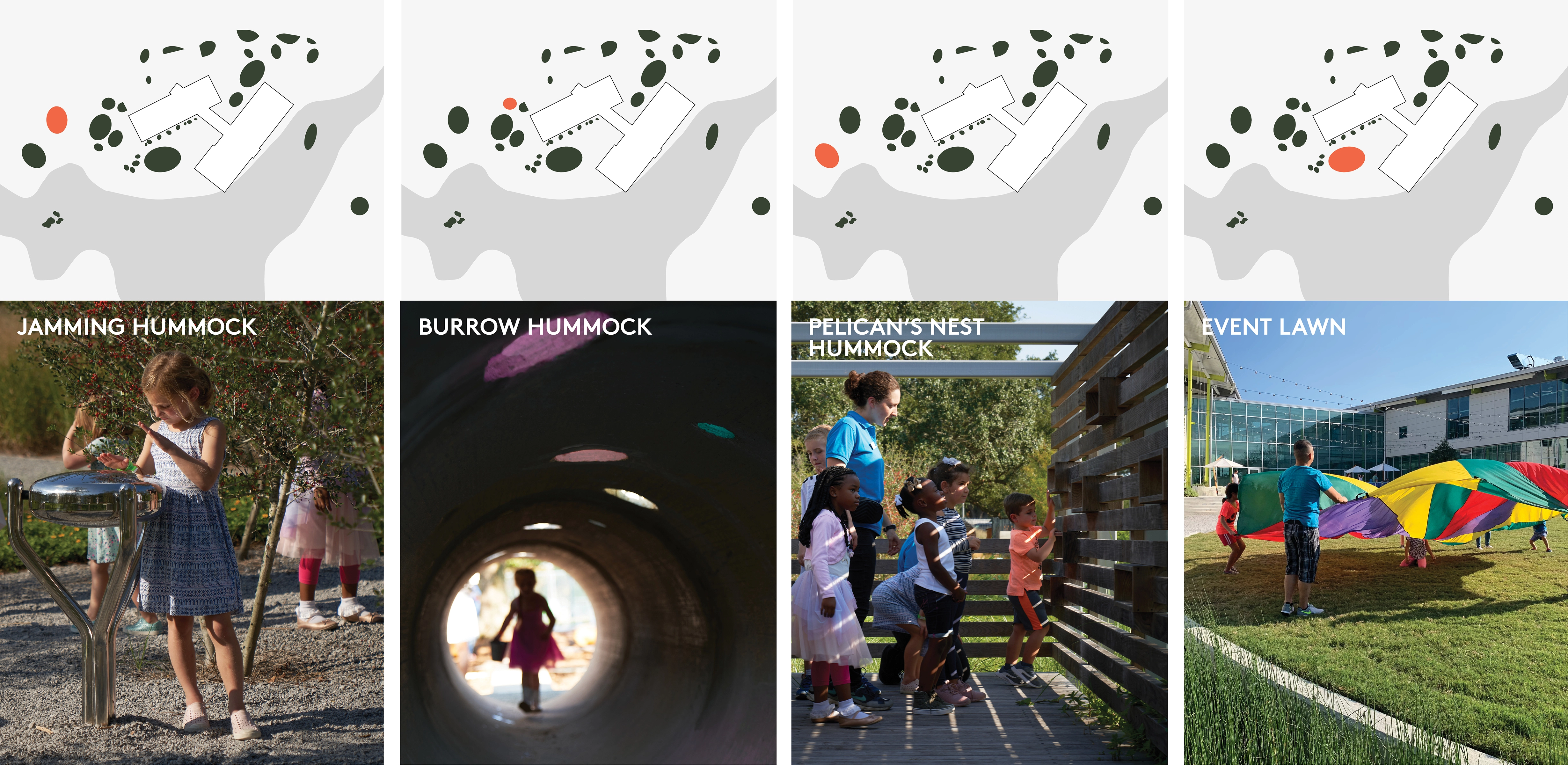 The building and site were designed to accommodate periodic flooding, and mitigate the hot, humid climate. The integrated design optimizes the shade of mature live oak trees, the world’s largest grove of live oaks, and the flow of a freshwater lagoon as a local stormwater receiving area that relieves flooding in downtown neighborhoods. The choreography of the visitor experience connects families with these nature-based systems—moving through groves of live oaks, across water, through immersive exhibits and into a courtyard and sensory gardens.