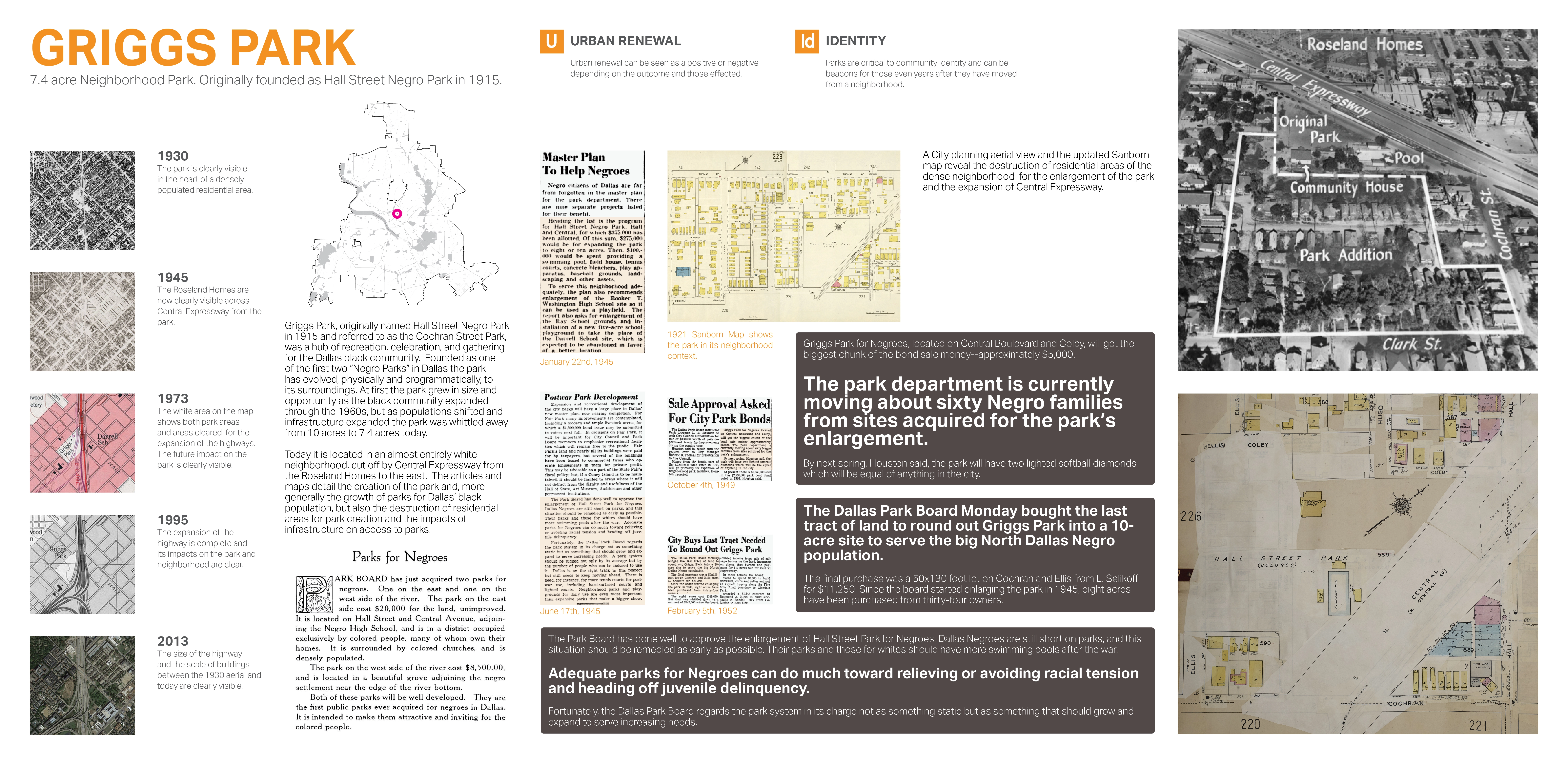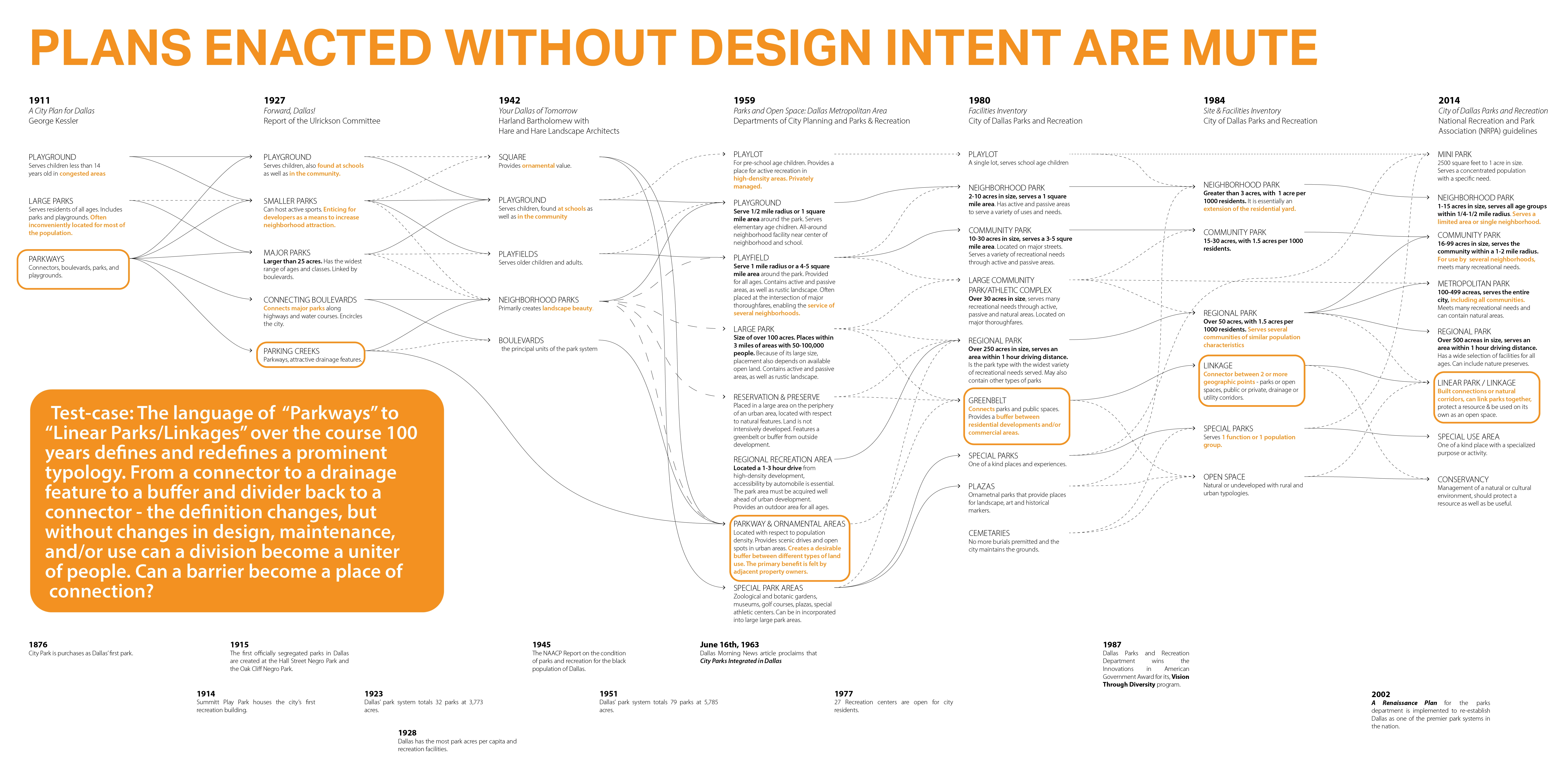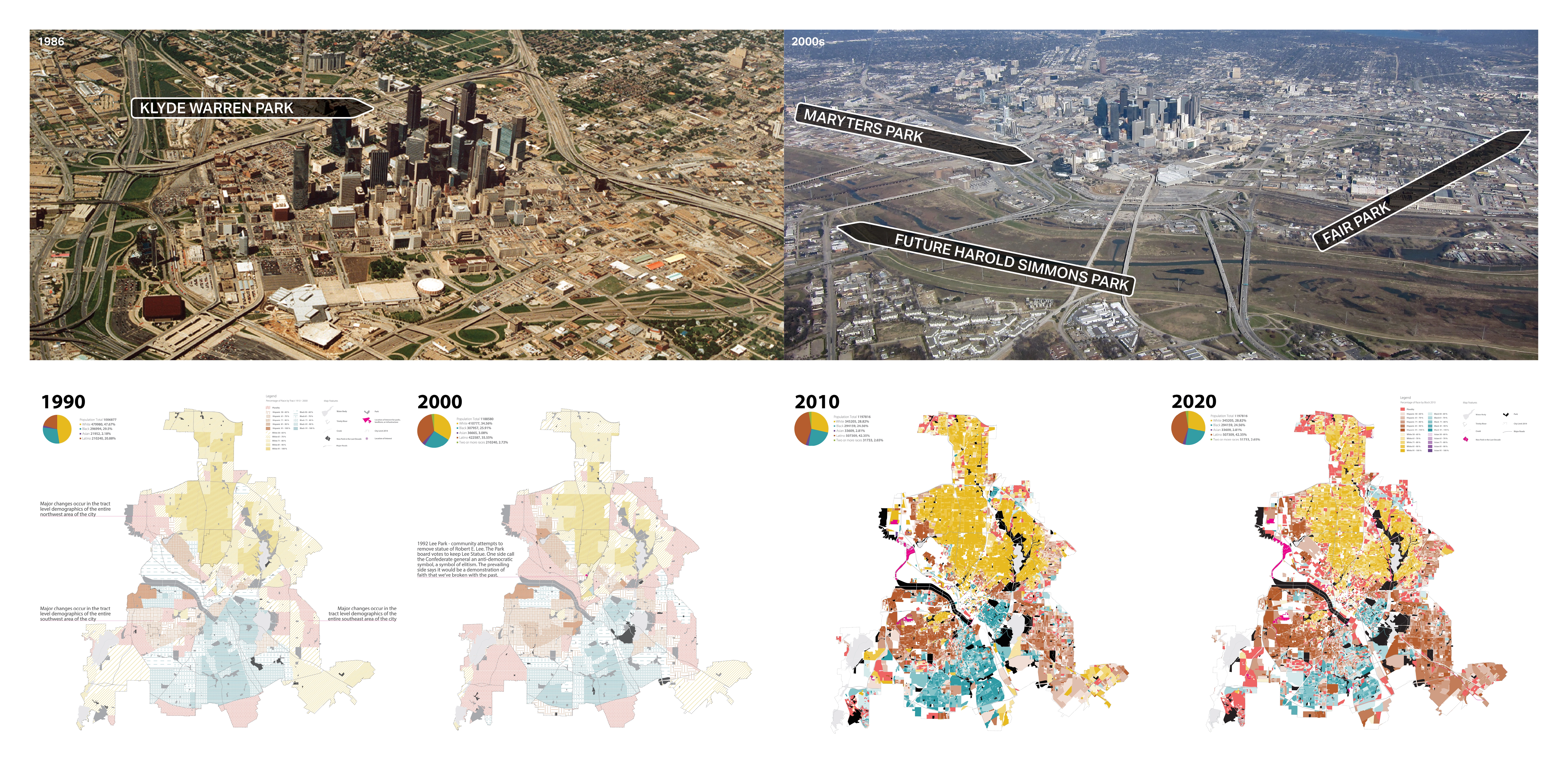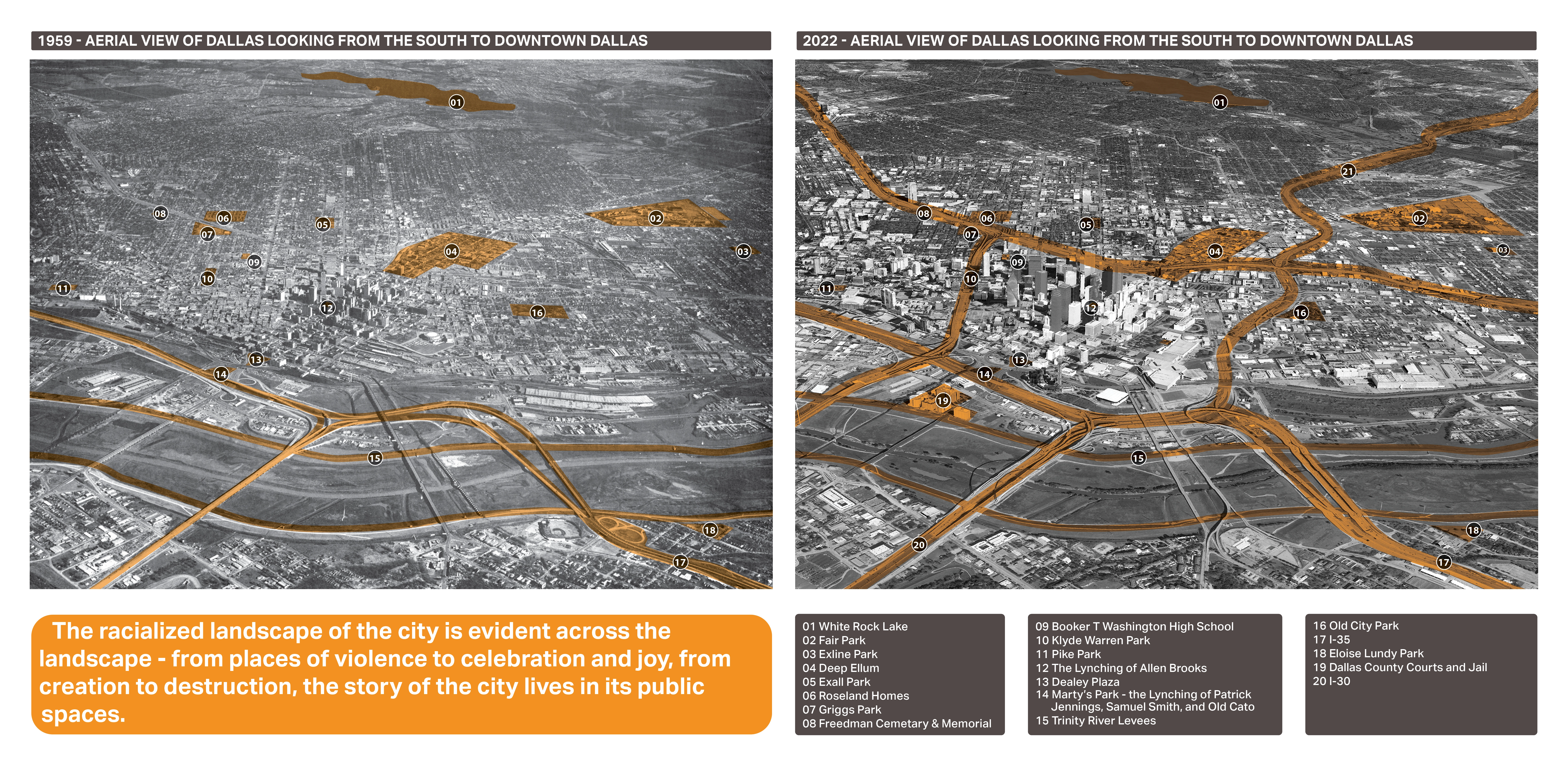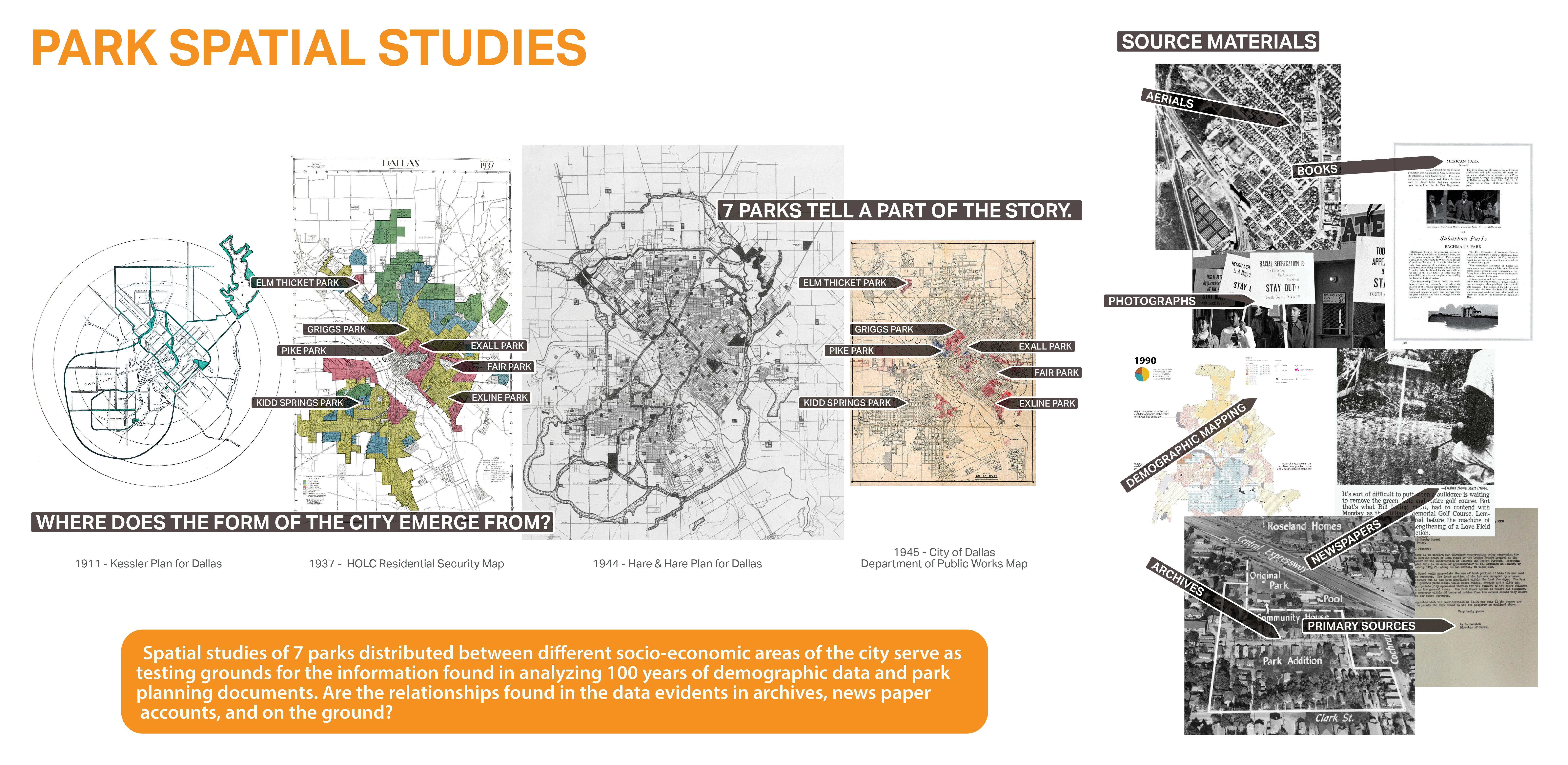 This research uses a century long historical analysis of the public park system in Dallas, Texas, USA to uncover the physical and psychological ways in which public landscapes and the works of landscape architects have segregated urban spaces and how we might fight against these design practices. Through reframing past practice this work seeks to create a method for informing design thought and practices that seek to create a more just built environment. Overlaying the mapping of demographic data with the development of the public park system and incidents of segregation and violence; the research creates a clear link between the social and economic process of racial injustice and the process of park design and urban development.