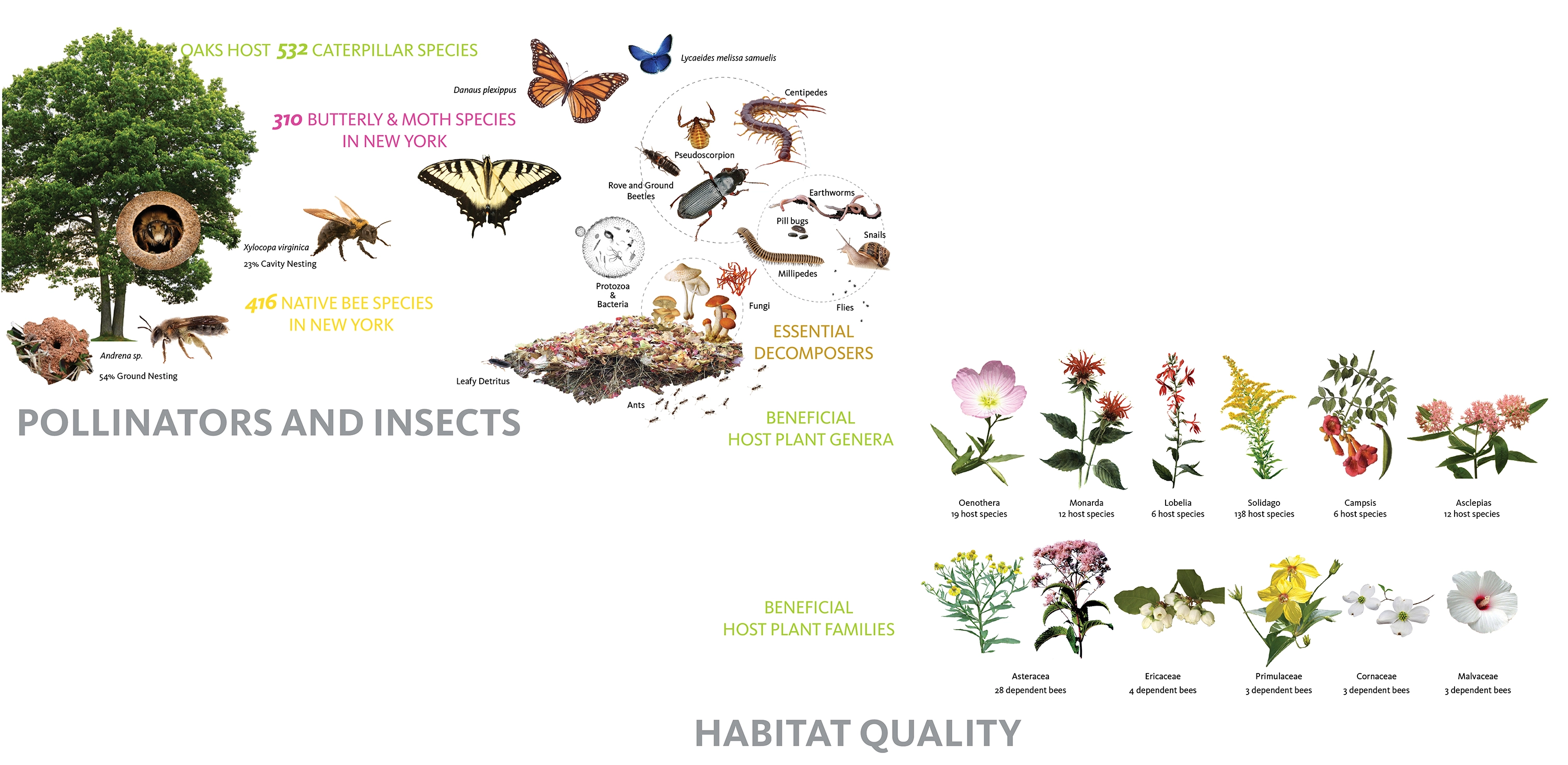 Open to the public, the entry plaza provides an immersive garden experience through lush, resilient understory plantings and groves of native trees. The design draws from natural shoreline forms with planted berms and natural boulders complemented by geometric stone seats and paving regionally sourced from upstate New York. The plaza is designed to retain up to 92,000 gallons of rainwater stored in a below-grade cistern and reused for irrigation sitewide. At the 2nd floor, the existing train tracks and platforms emerge from the face of the building and are planted with native trees, shrubs, and groundcover that appear as though they have spontaneously taken root there. Seven stories of window boxes on the north façade provide an ecological ladder for local birds and insects as they traverse from the plaza up to the 12th-floor terrace. NYC Audubon has documented approximatly 40 bird species using the habitat created at St. John's Terminal--including several species never before documented on a green roof.