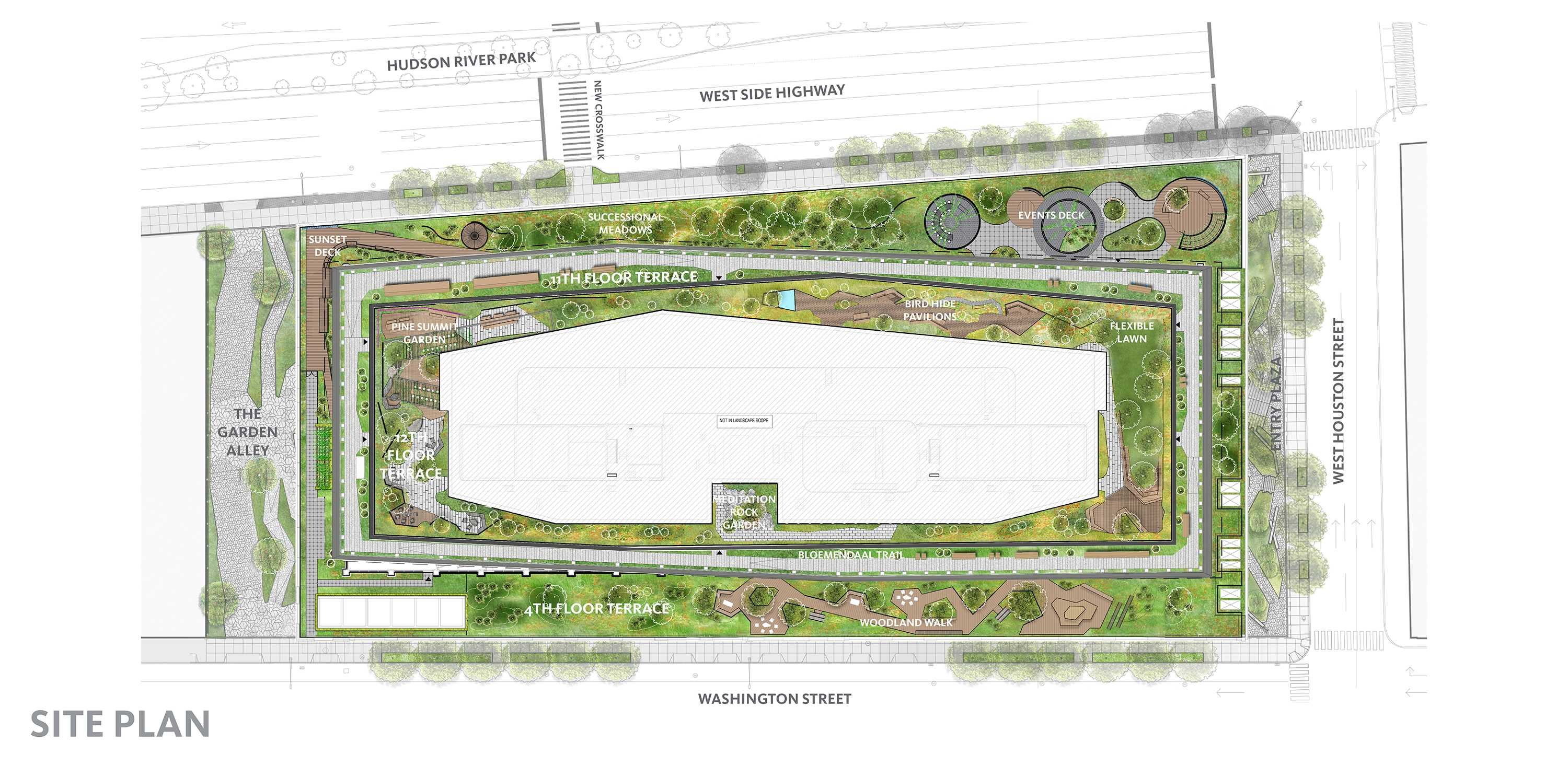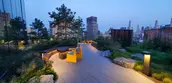 Collectively, the terraces provide a diverse range of work-space environments that inspire collaboration and imagination. The 4th-floor terrace, located on the roof of the existing building, takes cues from its industrial past through distinctive architectural elements, including wind-mitigation screens, pergolas, and seating nooks. The events terrace hosts visitors from the auditorium with a large flexible space, planted islands, fossilized limestone bar counters, and pergolas. The 11th floor is a quarter-mile-long, 360-degree walking path offering a moment of respite, with exceptional views across the water and of the Manhattan skyline. The walking path is framed by plantings inspired by the Dutch term, Bloemendaal – or “Valley of Flowers” – used to characterize the qualities of pre-development Manhattan. The 12th-floor terrace brings employees back to nature with rocky outcroppings and emergent alpine plants at the meditation garden and intimate seating areas nestled in the Pine Grove. A large lawn with rolling topography, a bosque of oak trees, and catenary lights supports flexible use for wellness programming, happy hour events, and lunch hour picnicking.
