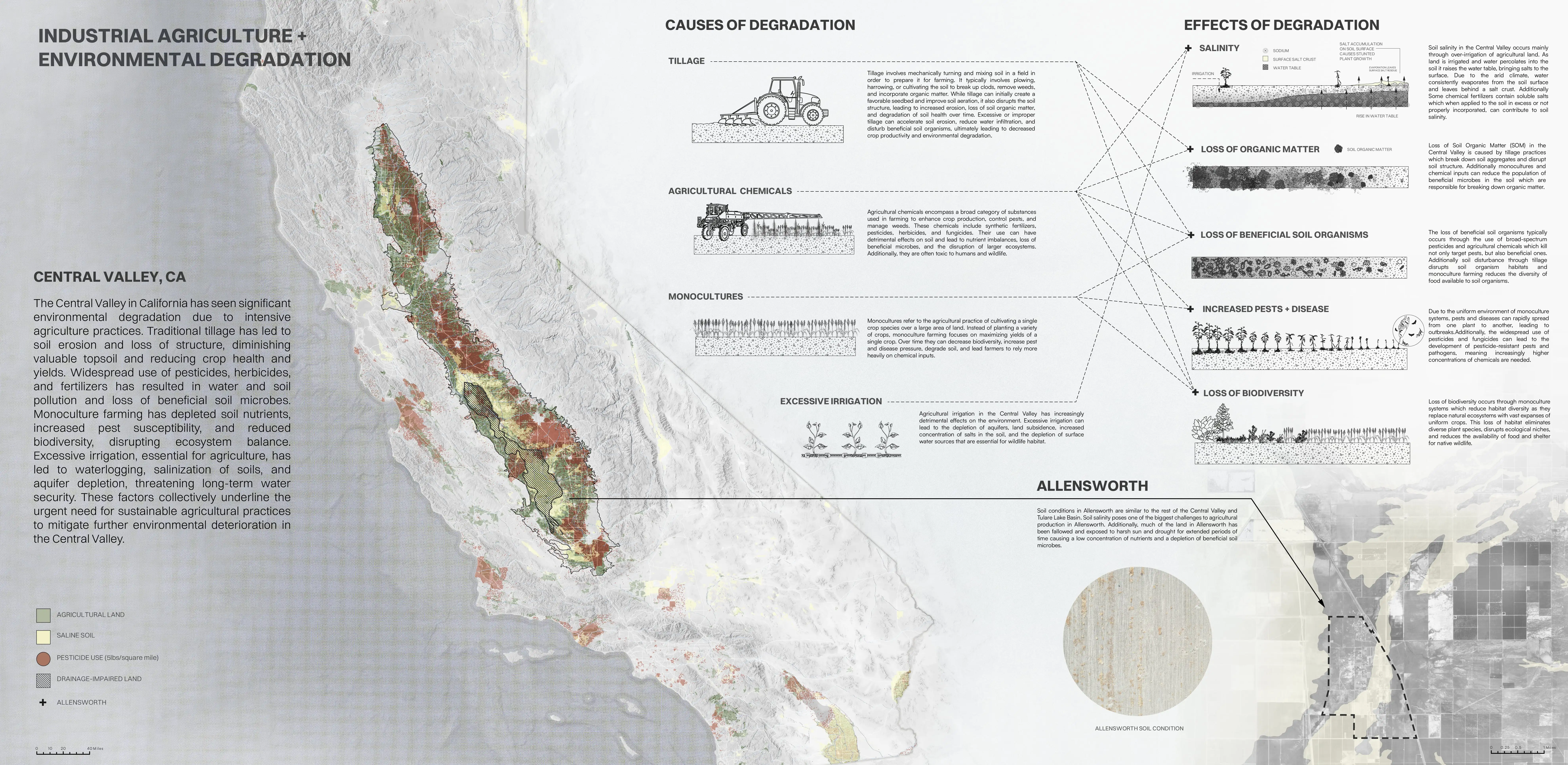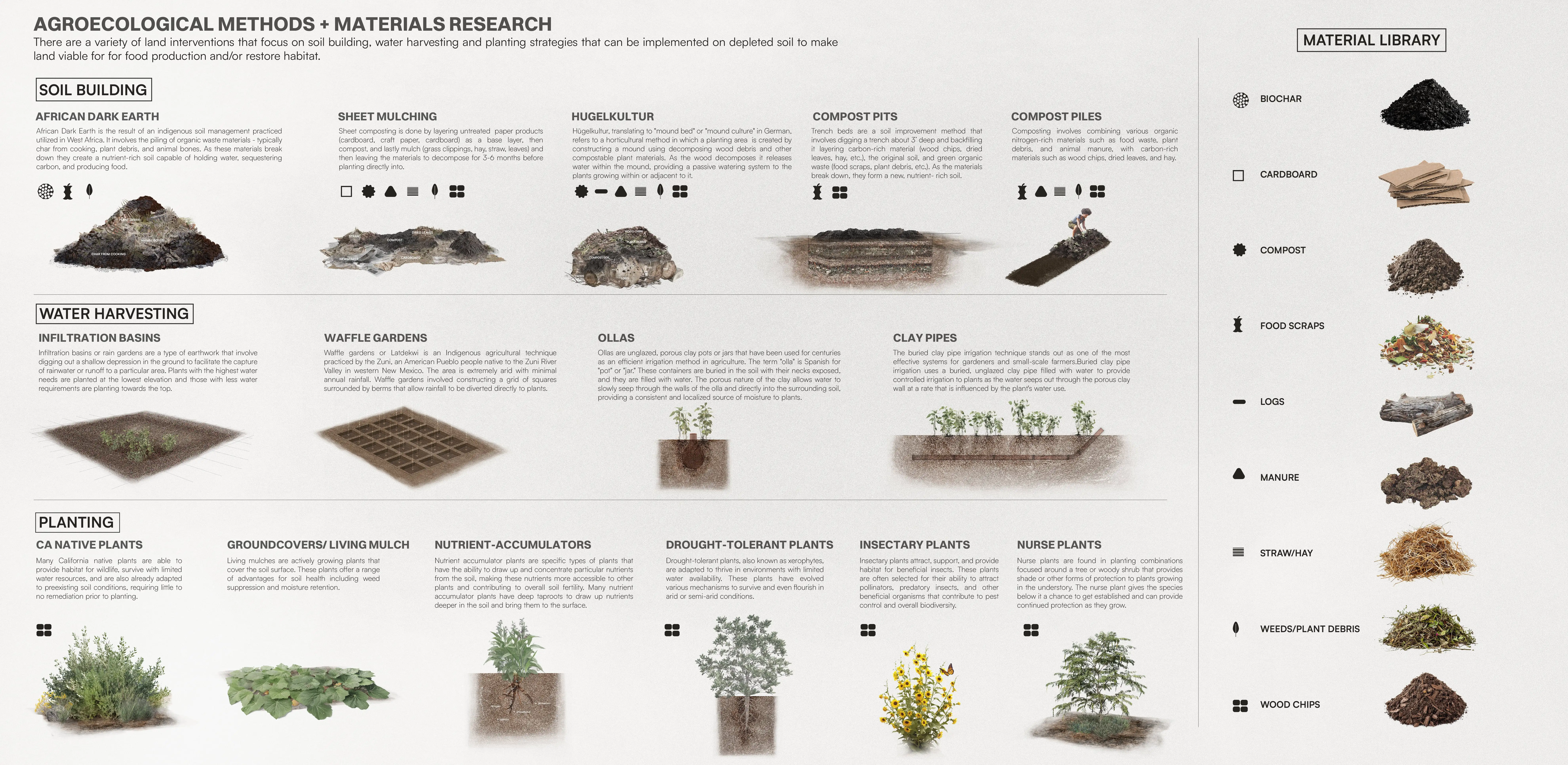 Current agricultural systems in California’s Central Valley cause extreme environmental degradation and contribute to ecological and public health crises. This project engages the Central Valley community of Allensworth in the development of a new place-based framework for regenerative agriculture. The Allensworth Agricultural Experiment Station (AAES) is a 4,000-square-foot site in Allensworth, CA, that investigates holistic and community-based techniques for food-producing landscapes. Its focus is on promoting ecological health, repurposing materials in the organic waste stream, increasing food sovereignty in the community of Allensworth, and reigniting its radical agrarian history.