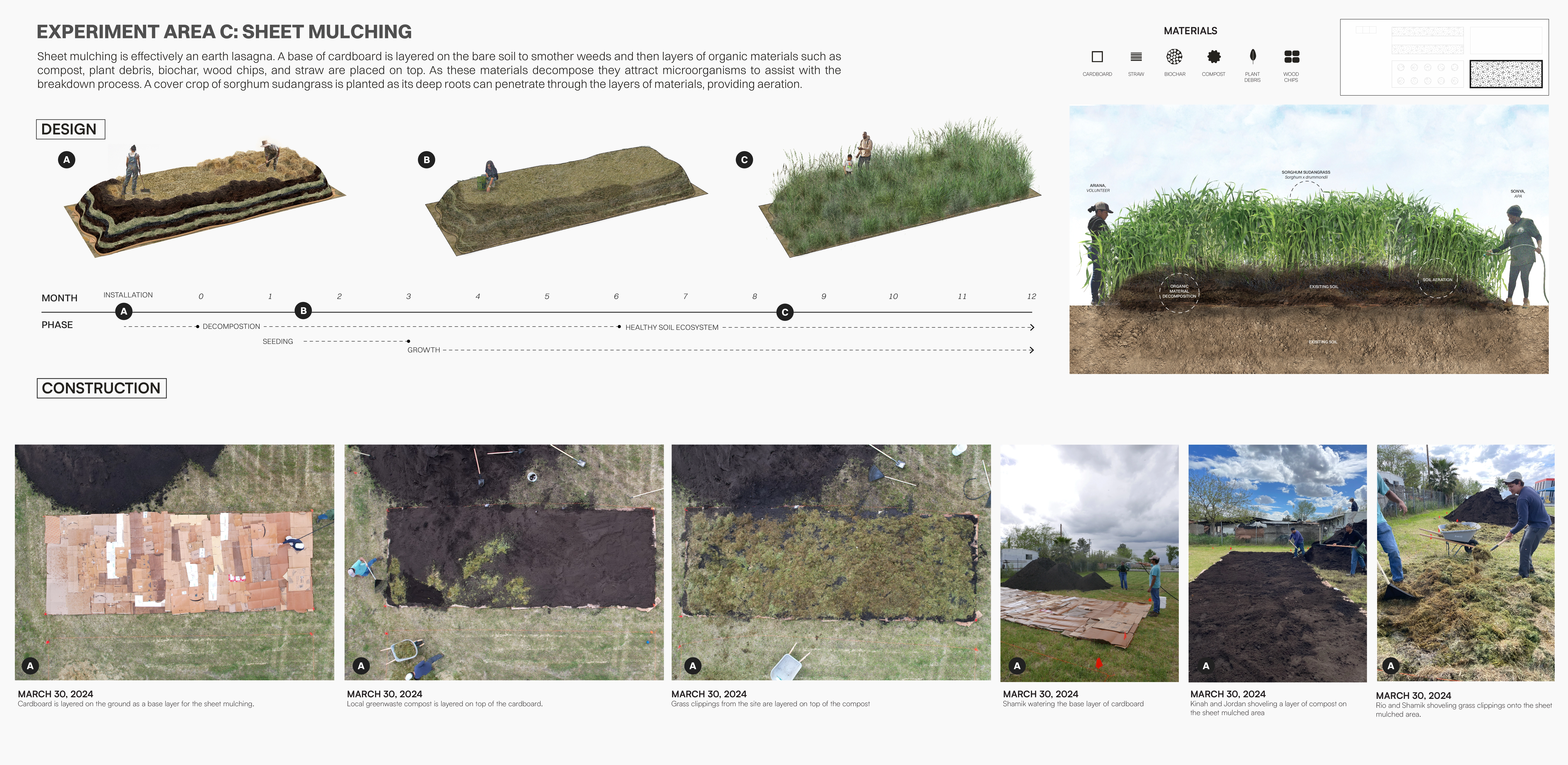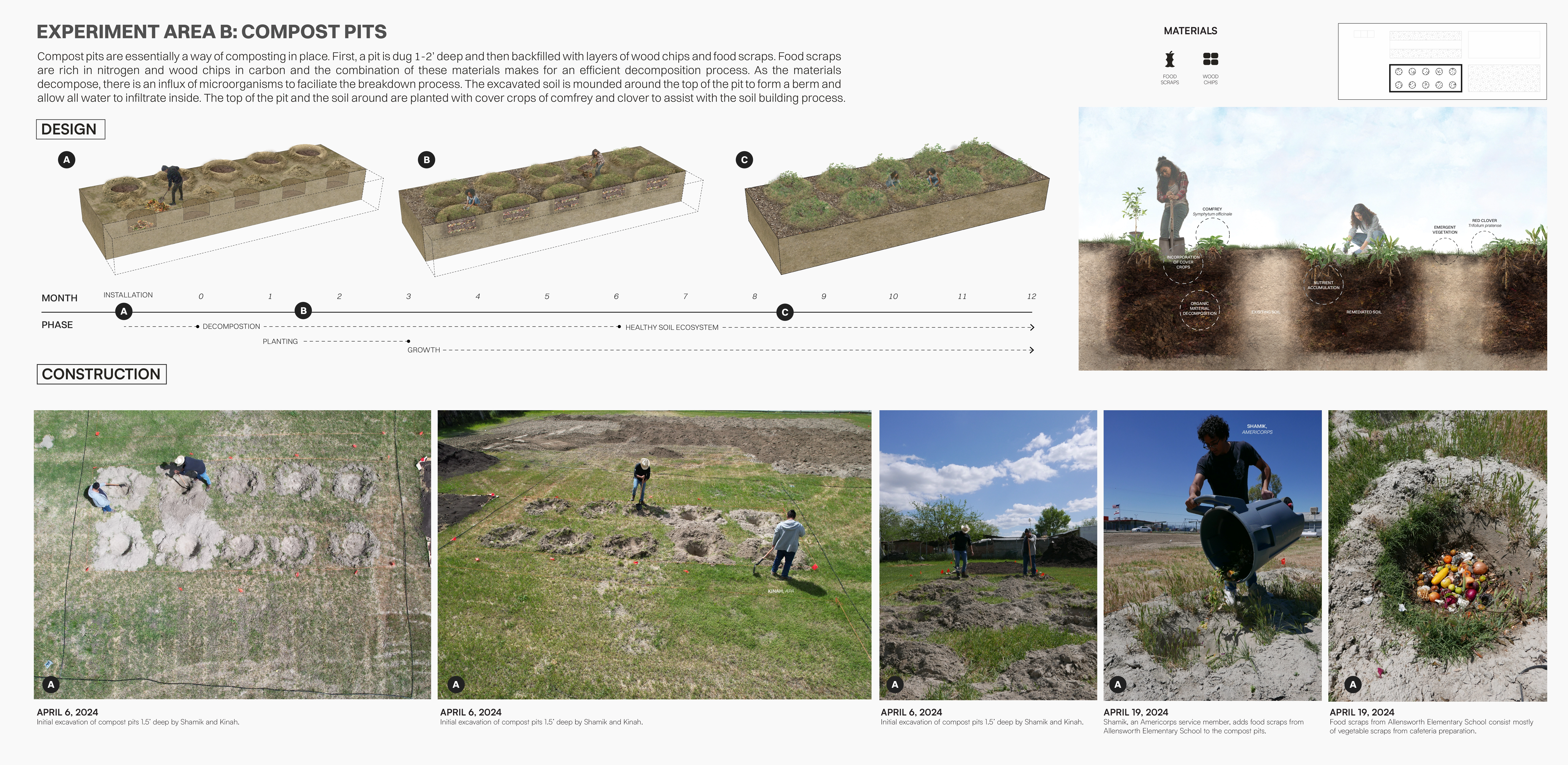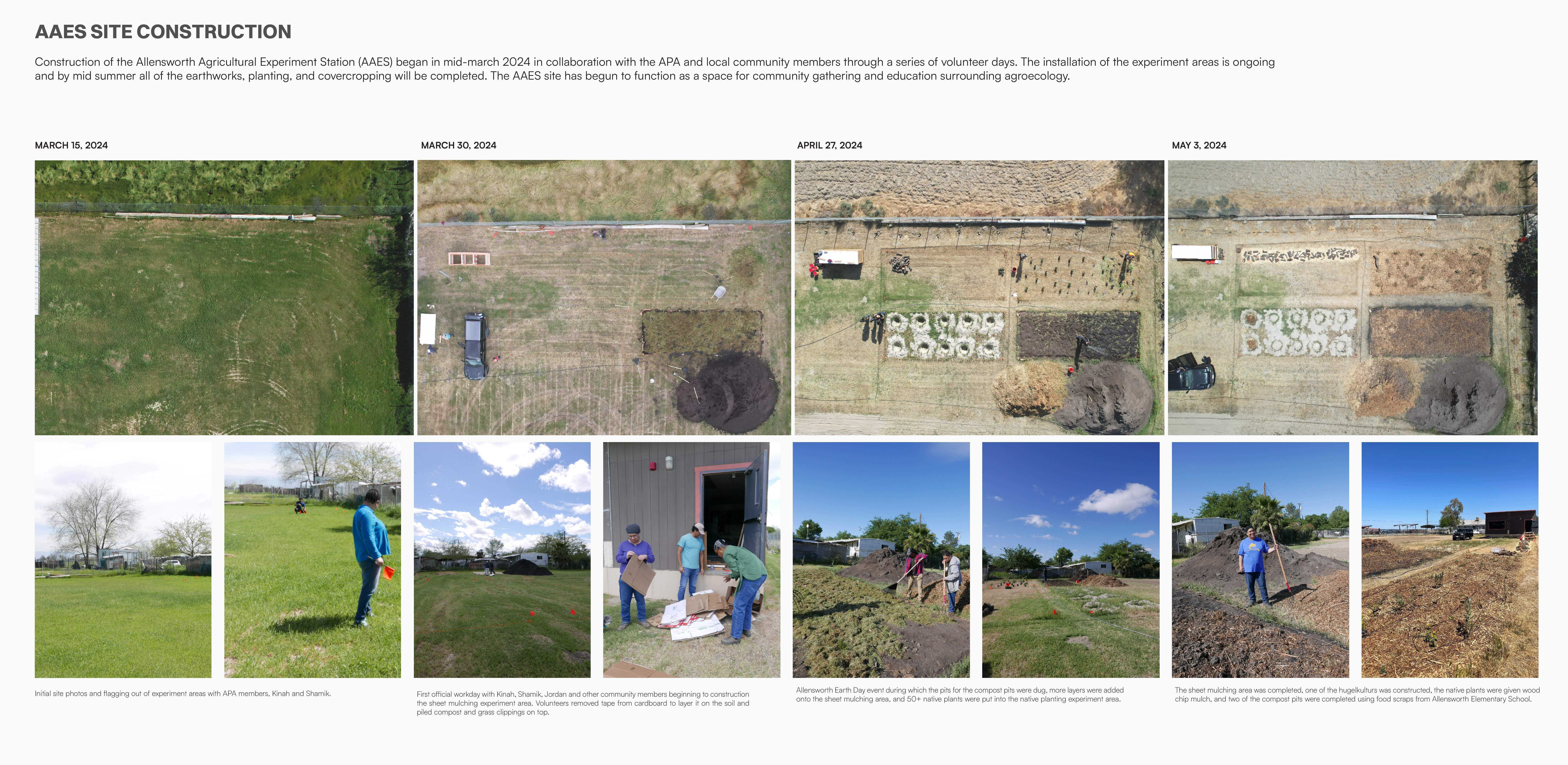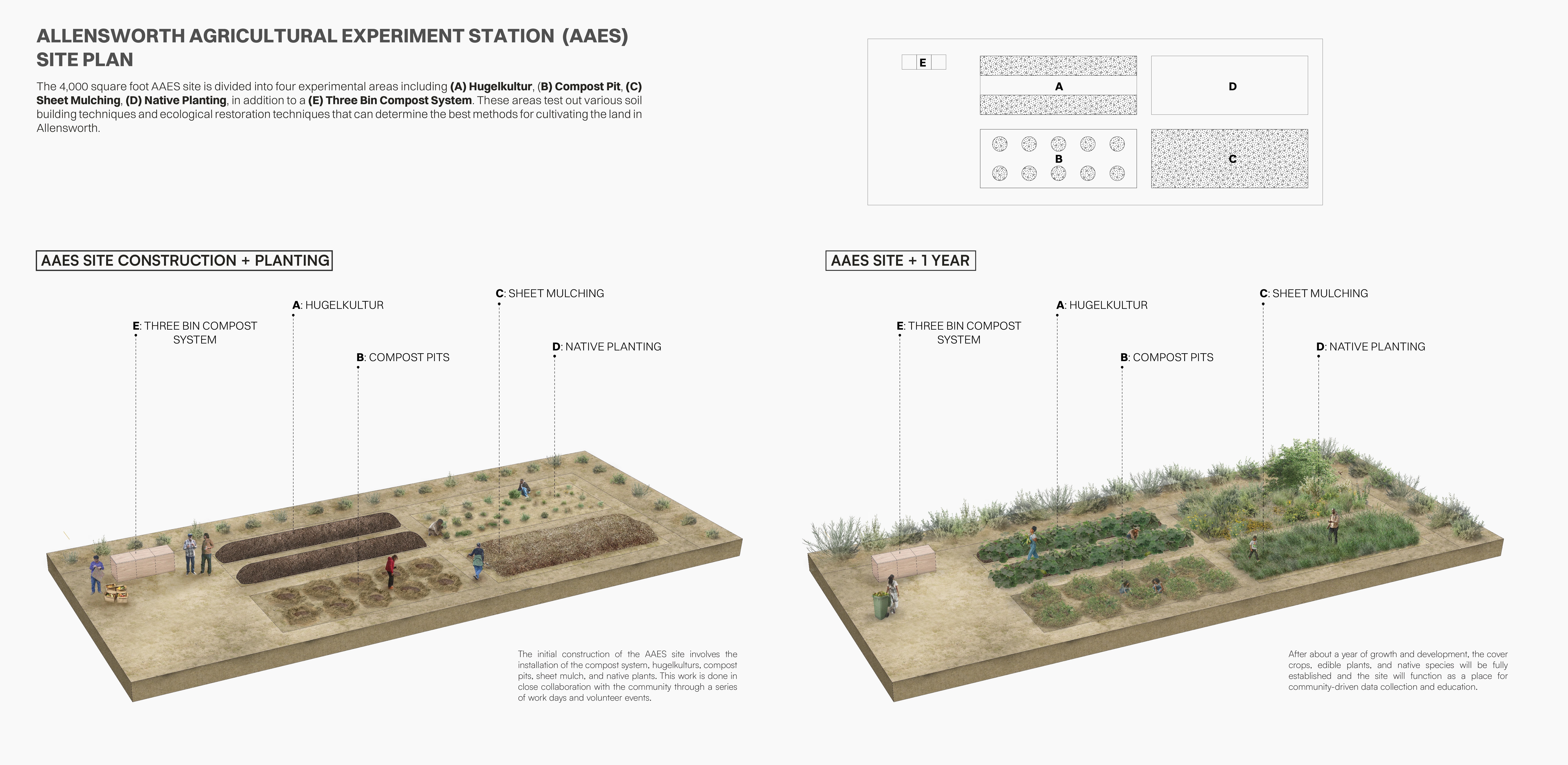 Before construction of the AAES, a deep site analysis was conducted which consisted of soil tests, cataloging of existing plant species, and documentation of existing site resources and amenities (access to water, electricity, etc.) to determine the best ways to remediate the soil and begin to engage the local community.