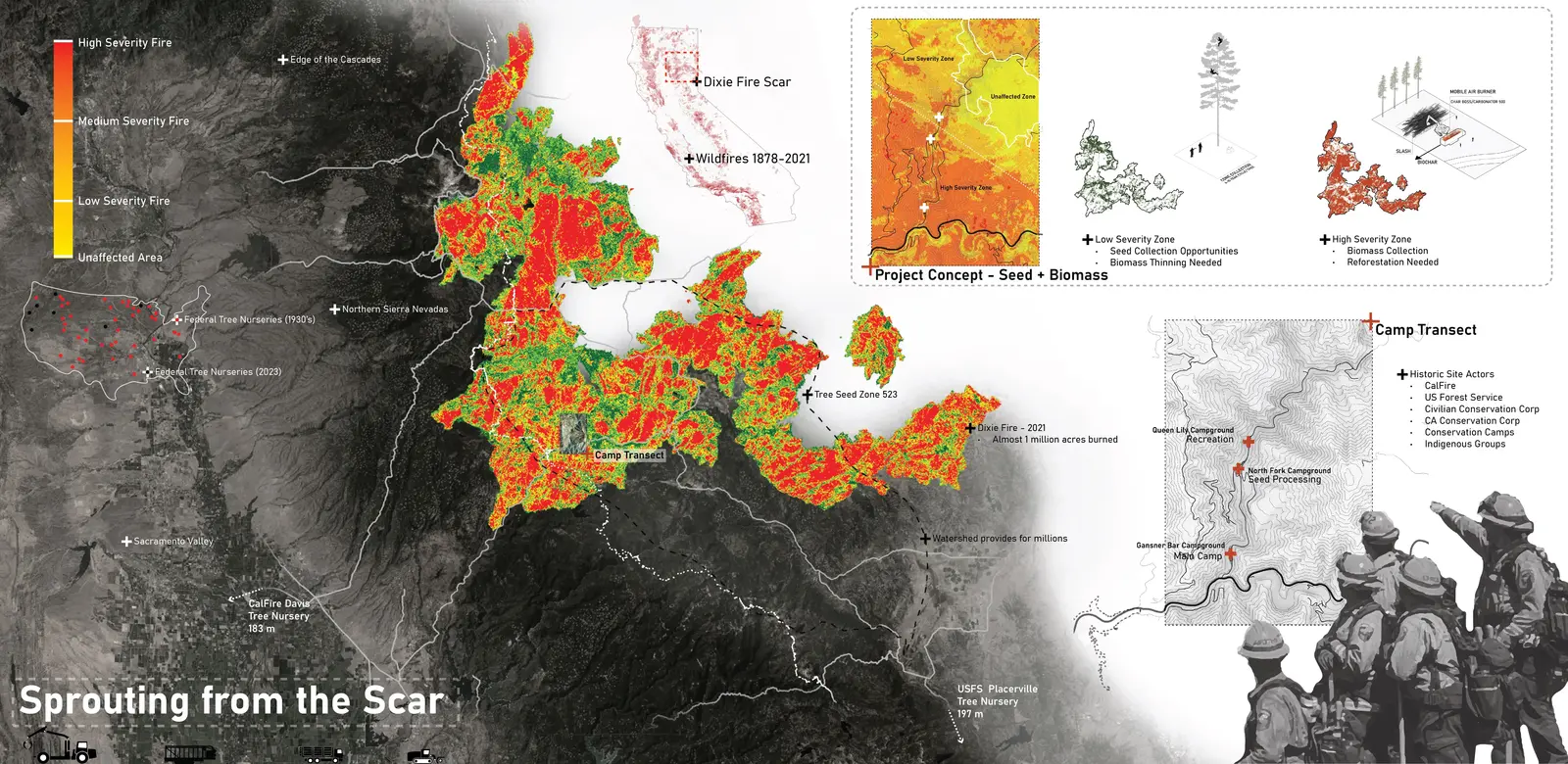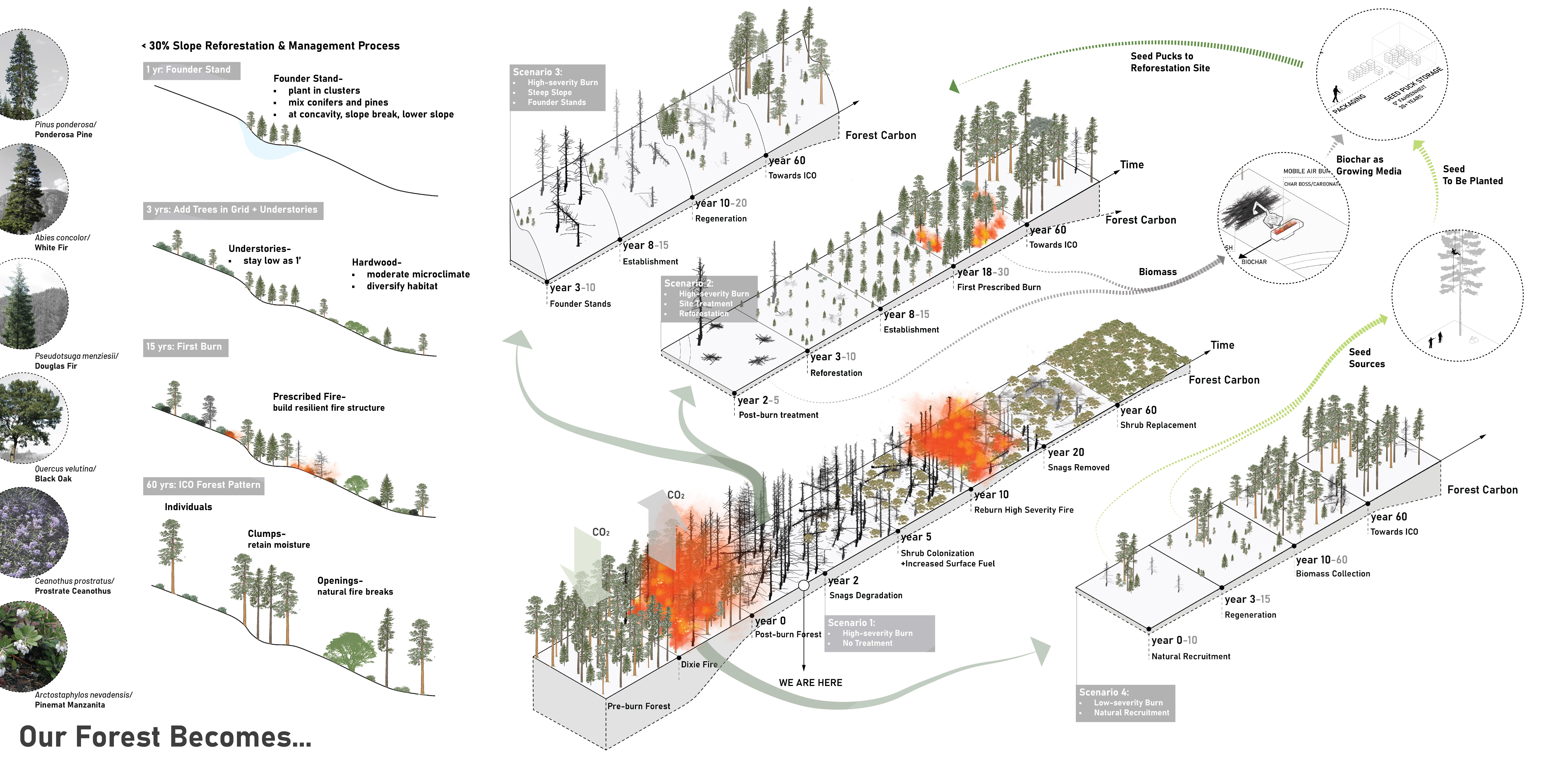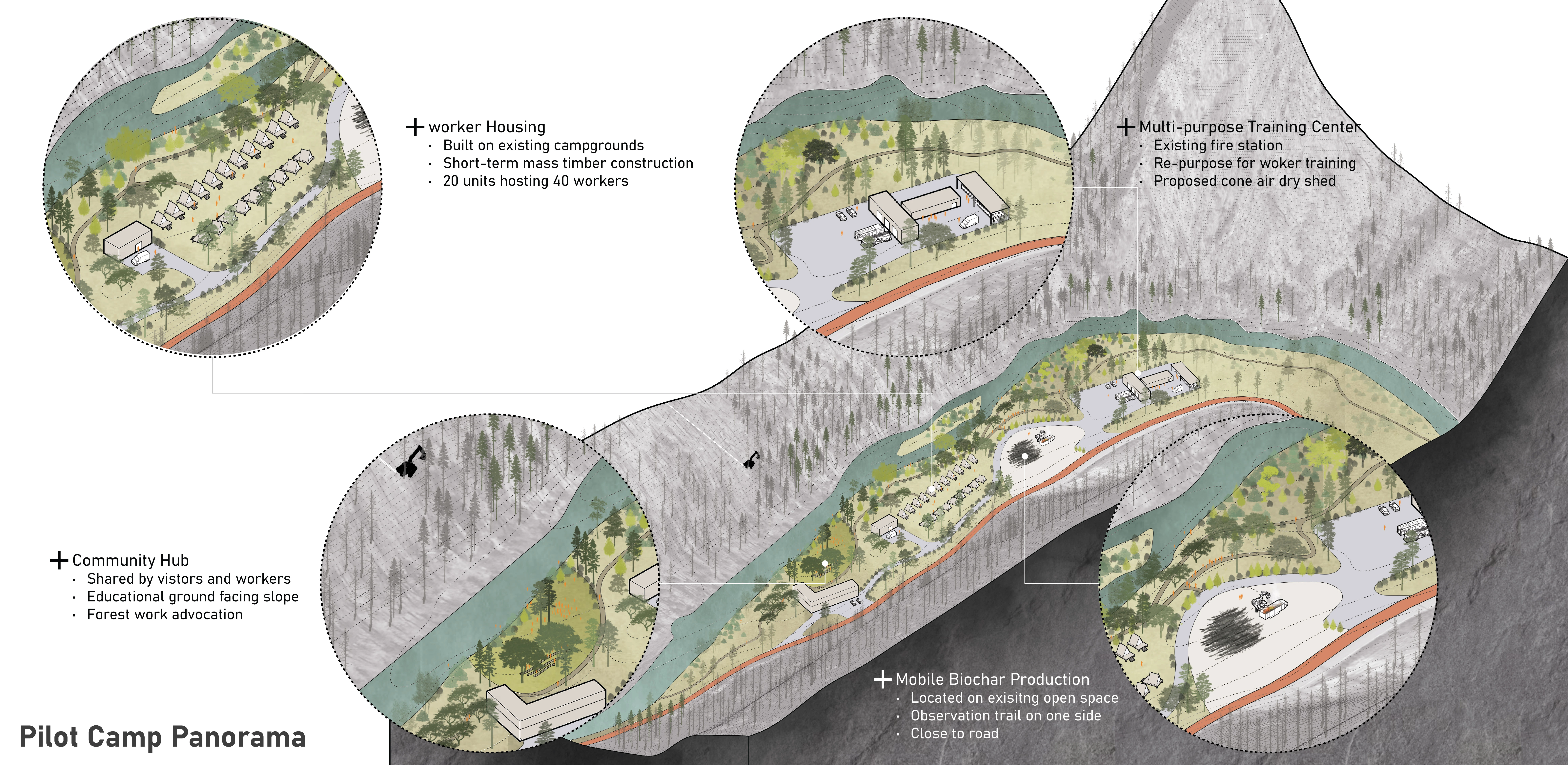 The forest is a living, breathing entity, so in order to address the issues, it was important for us to understand it from an insider’s point-of-view. Speaking to US Forest Service rangers, community members, and the local logging industry taught us how the existing systems are disconnected and often fall short. Issues, though, are interconnected and vary according to site conditions like elevation, fire severity, accessibility, and ecosystem. For example, there aren’t enough seedlings to keep up with reforestation depending on zone and scale of fire. Our site transect, a semi-permanent intervention, revolves around an existing camp that can address issues hyper-locally.