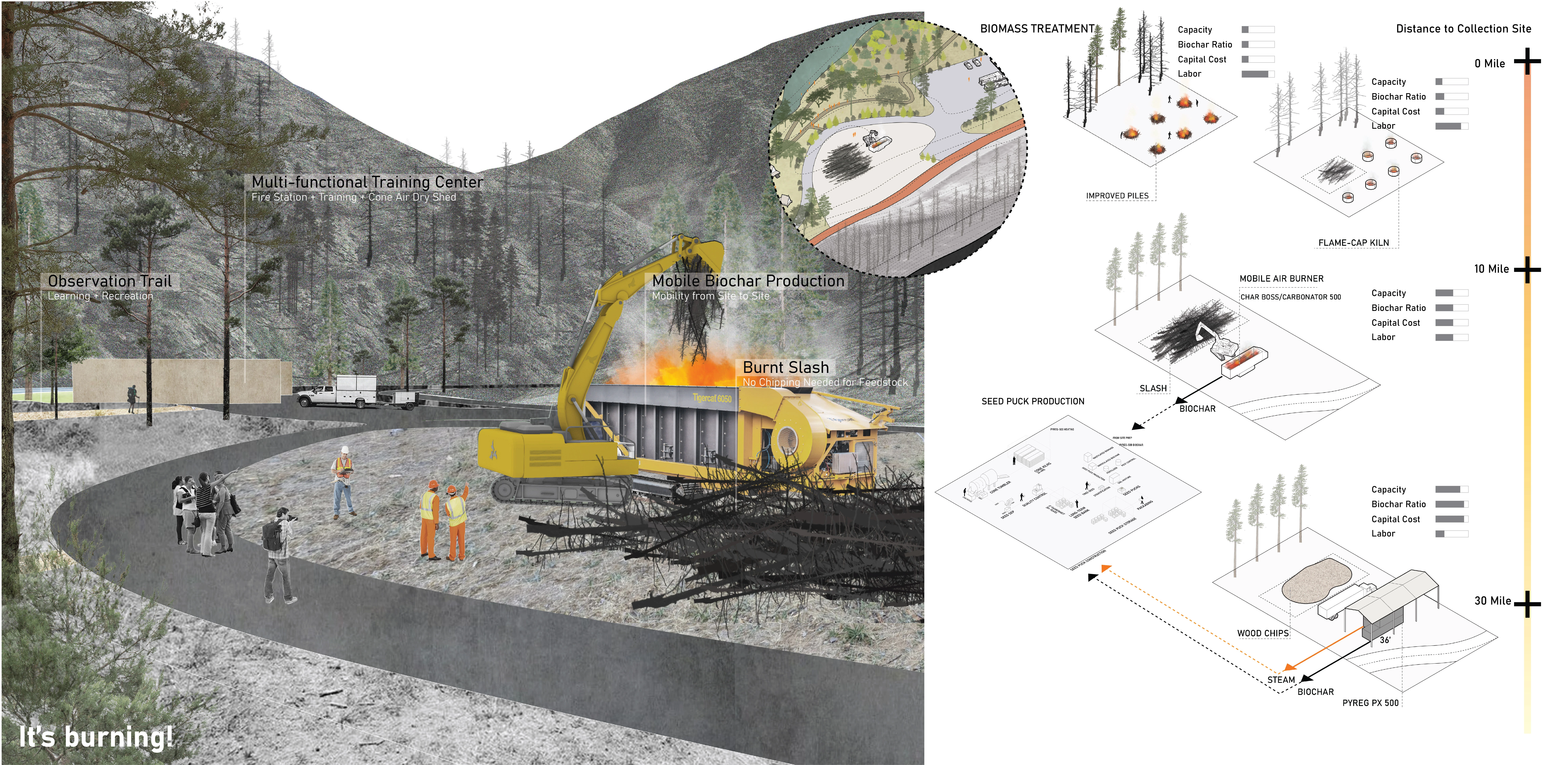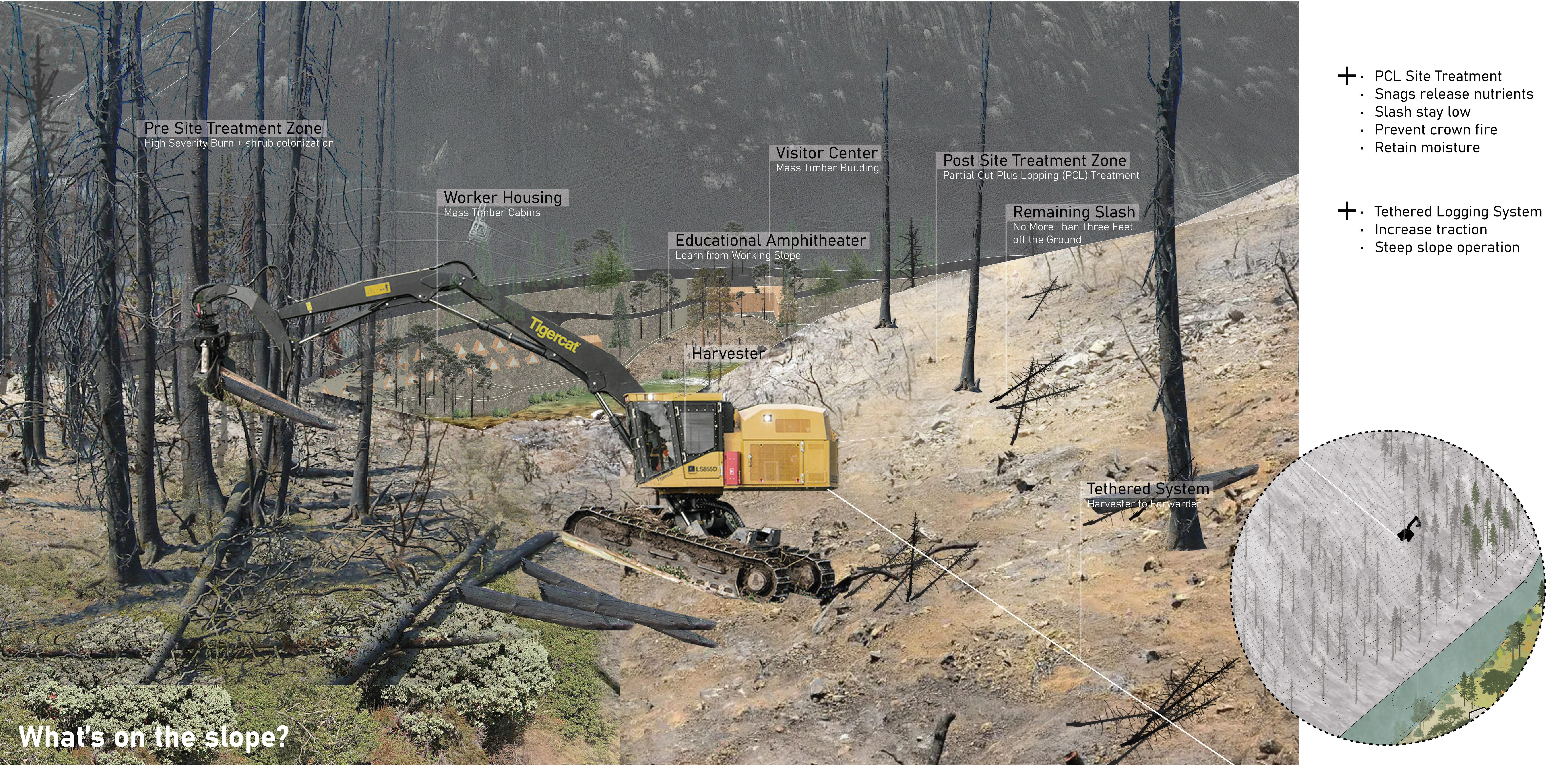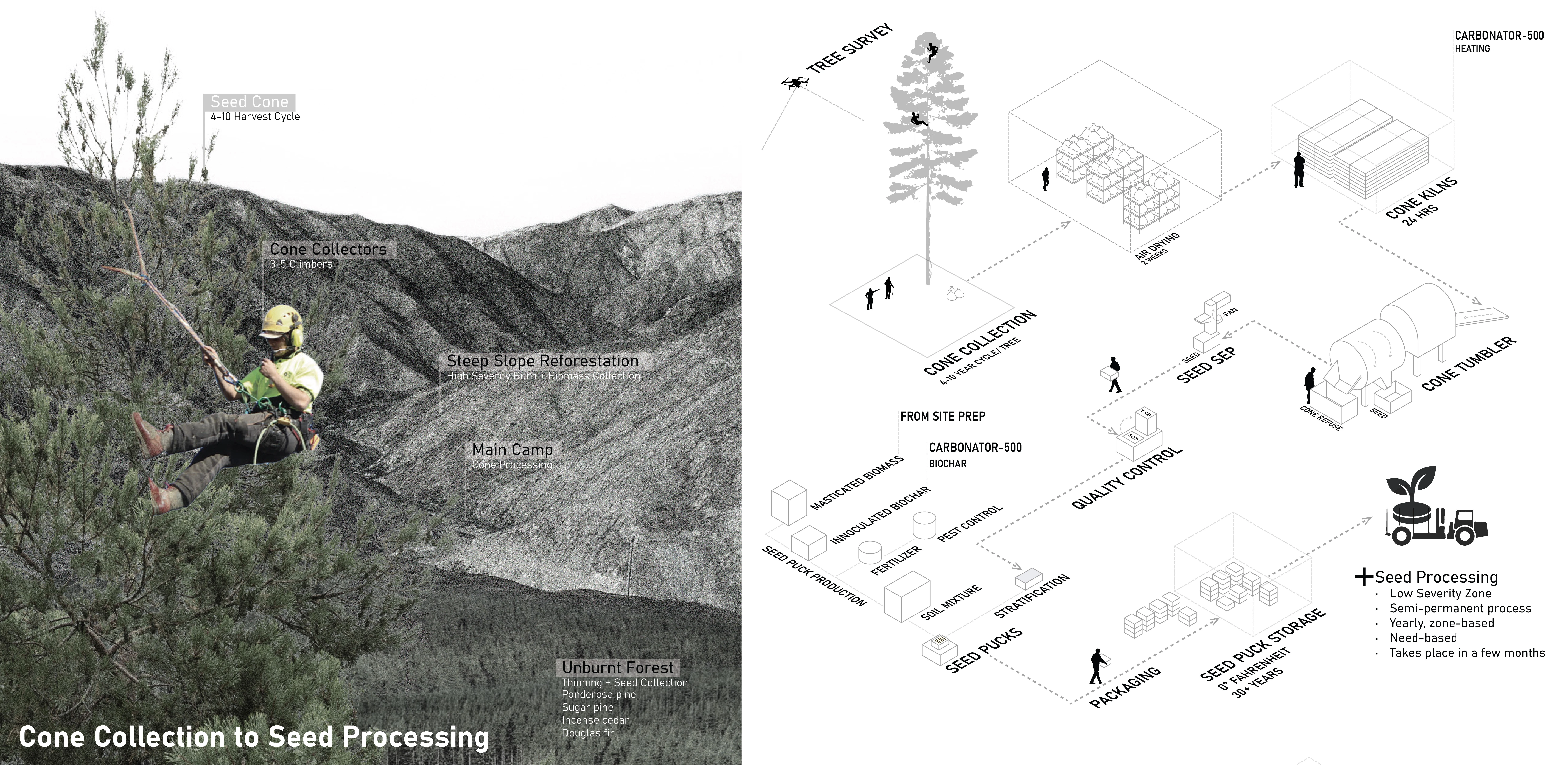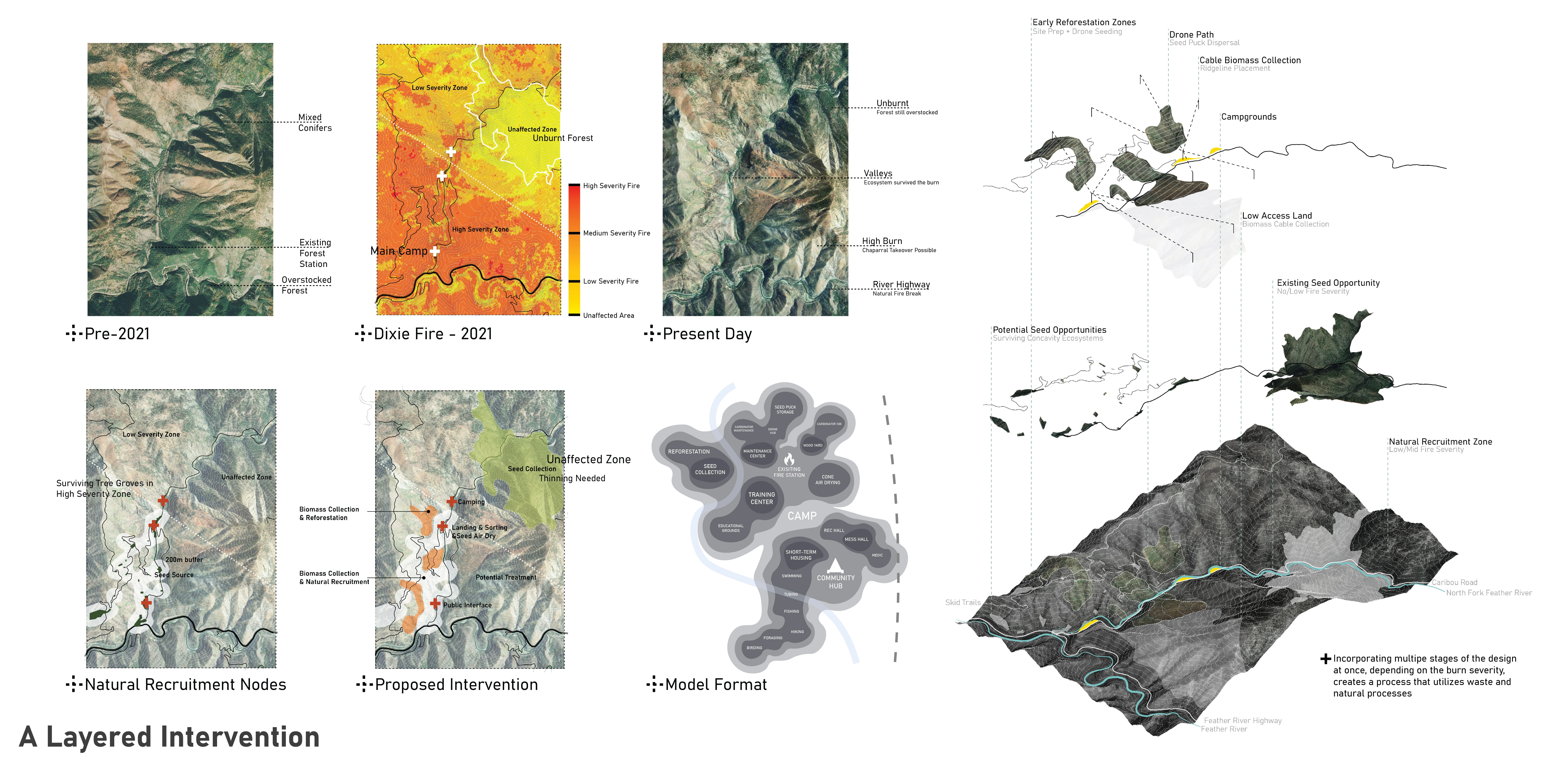 The forest is a living, breathing entity, so in order to address the issues, it was important for us to understand it from an insider’s point-of-view. Speaking to US Forest Service rangers, community members, and the local logging industry taught us how the existing systems are disconnected and often fall short. Issues, though, are interconnected and vary according to site conditions like elevation, fire severity, accessibility, and ecosystem. For example, there aren’t enough seedlings to keep up with reforestation depending on zone and scale of fire. Our site transect, a semi-permanent intervention, revolves around an existing camp that can address issues hyper-locally.