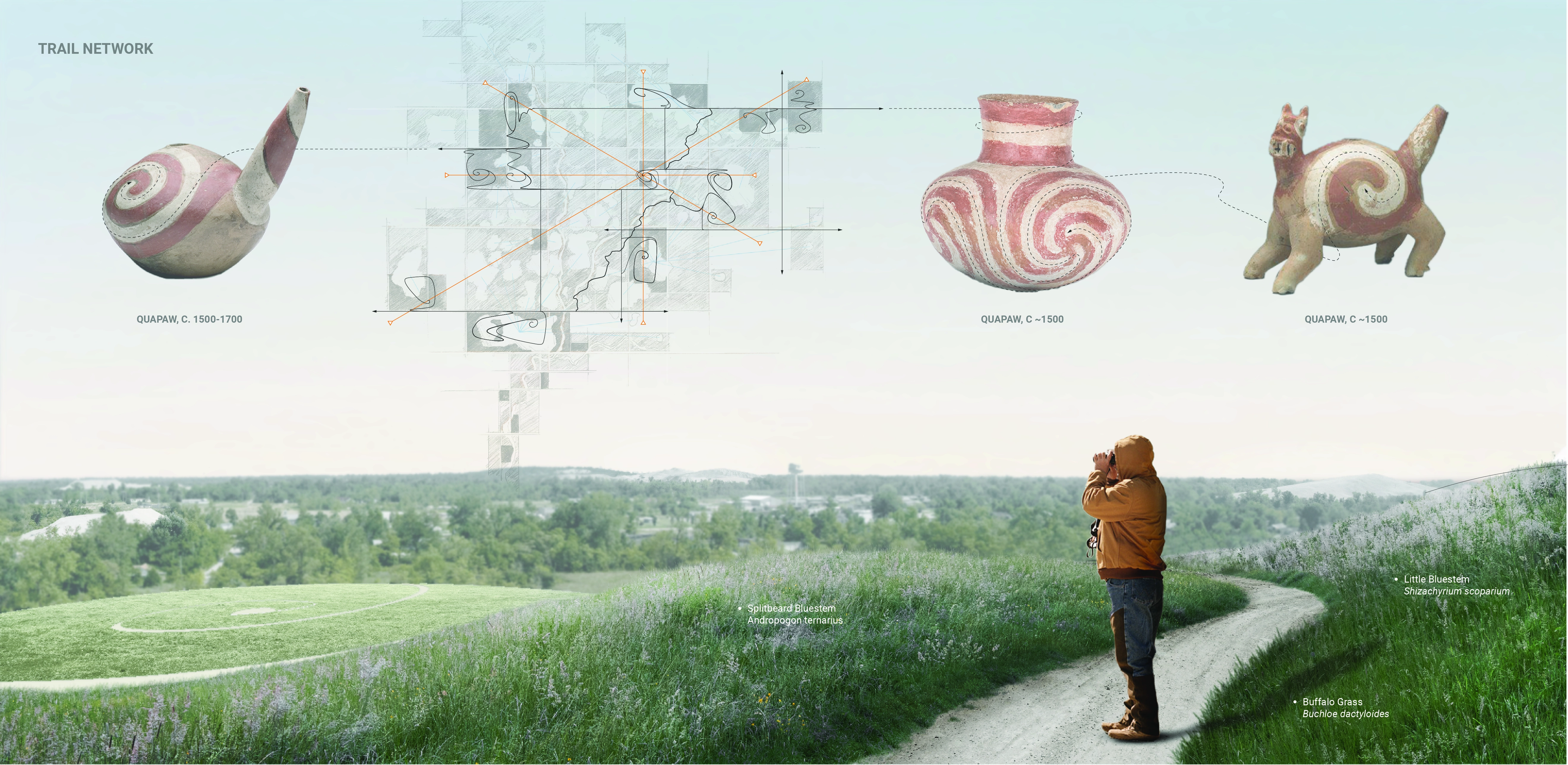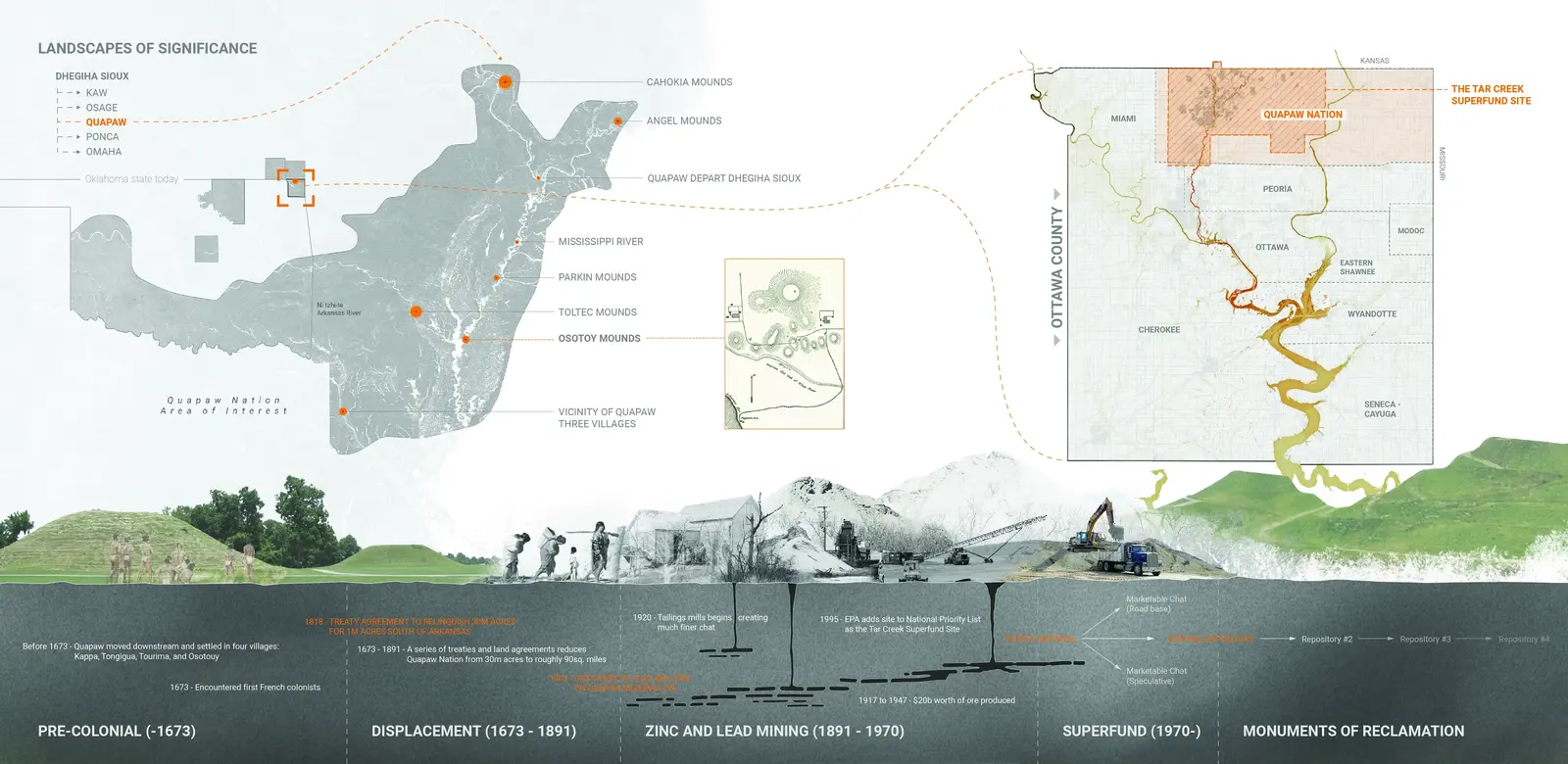Just Land adapts existing strategies outlined by Quapaw Nation and the EPA, reimagining chat remediation as a cornerstone of landscape design. Twelve proposed repositories will store the 30 million tons of chat, reshaping the Quapaw landscape. Aligning with Quapaw tradition, these repositories will be carefully oriented, reflecting celestial patterns significant to the tribe. By integrating trail access and commemorative elements, Just Land transforms otherwise banal landfilled repositories into cultural landmarks.