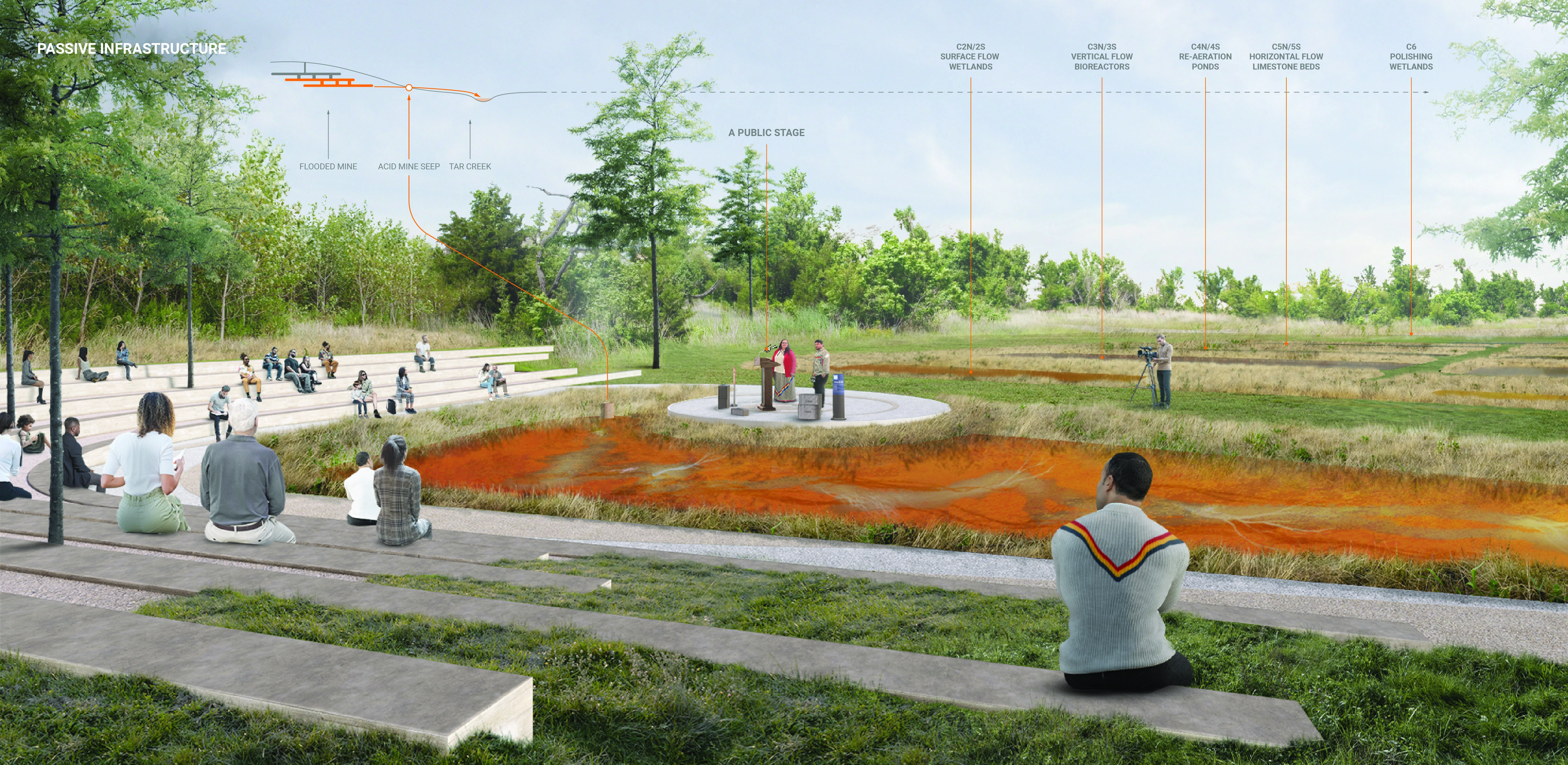 The Tar Creek Superfund Site is among the most polluted landscapes in the country. Just Land repositions ongoing efforts to remediate toxic mining waste into repositories as the foundation for a regional landscape gesture. Taking into consideration areas of cultural significance to Quapaw Nation, the design proposes a careful alignment of future repositories along a specific celestial orientation as well as the reintroduction of a managed native canebrake ecosystem tied together by a trail network. Just Land aims to consider environmental regeneration as a framework for the reclamation of both culture and land with respect to the 10 tribes that call Ottawa County home and provides a model for decolonialization through environmental justice.