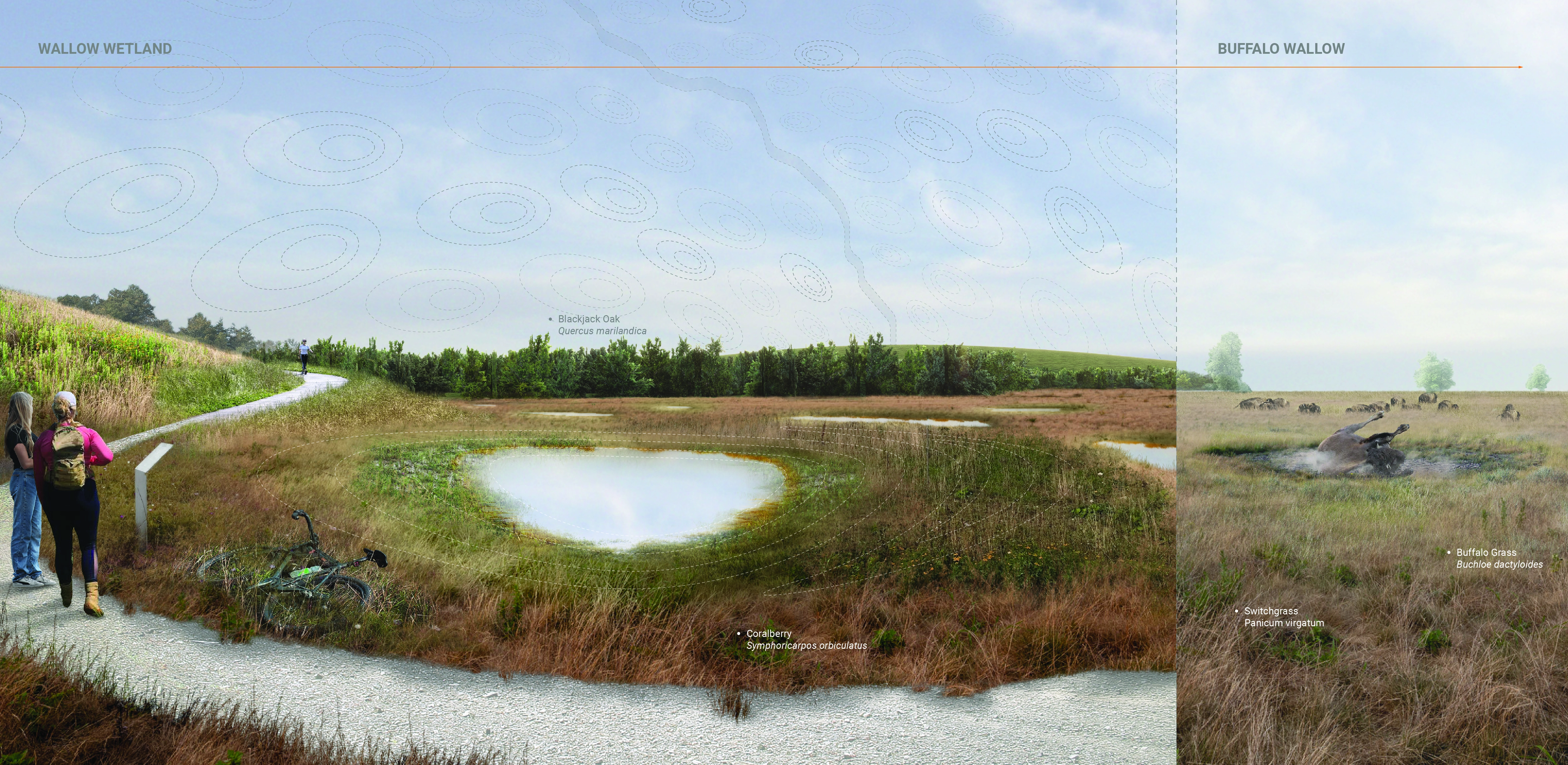 Tar Creek's contamination stems from acid mine drainage and chat runoff. Just Land proposes a two-pronged approach: passive mine drainage systems and wallow wetlands. Treatment ponds, based on the existing models of passive treatment on site today, intercept acid mine drainage. At a larger scale, wallow wetlands trap and hold floodwater, mimicking the natural water retention of buffalo wallows. By leveraging both natural processes and phenomena, Just Land begins to address water pollution in Tar Creek while enhancing ecological resilience in an age of increased storm and flooding events.