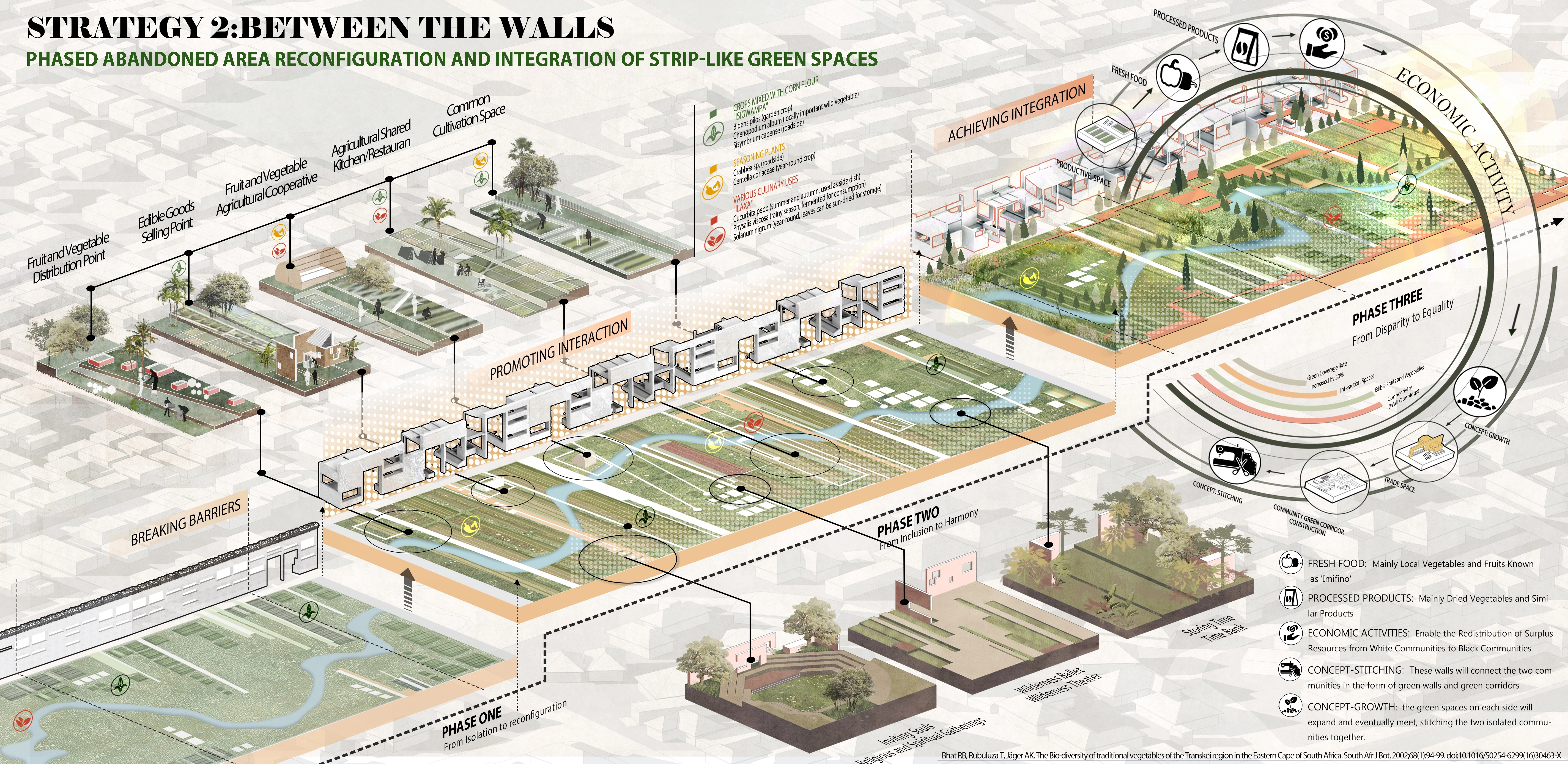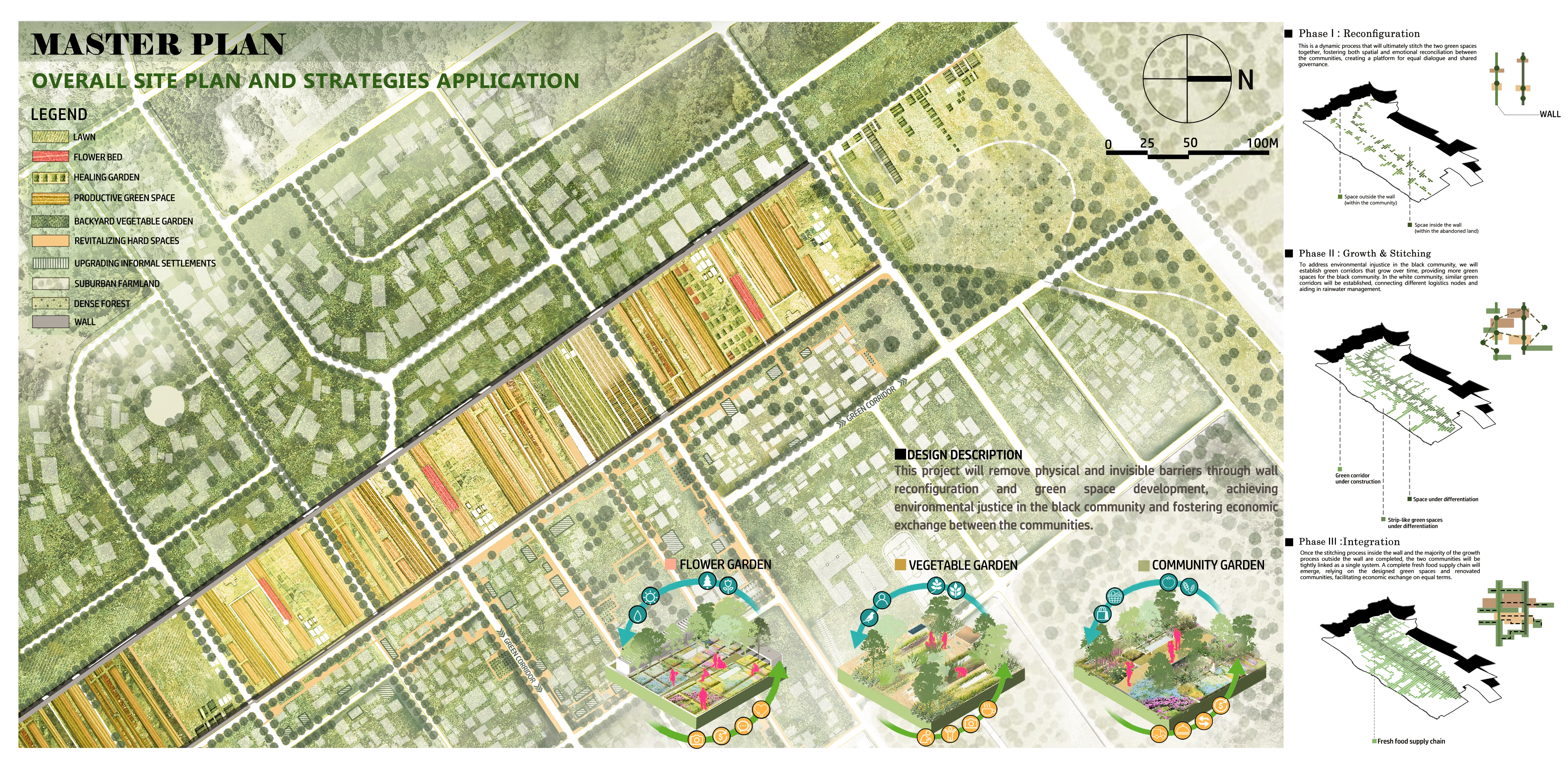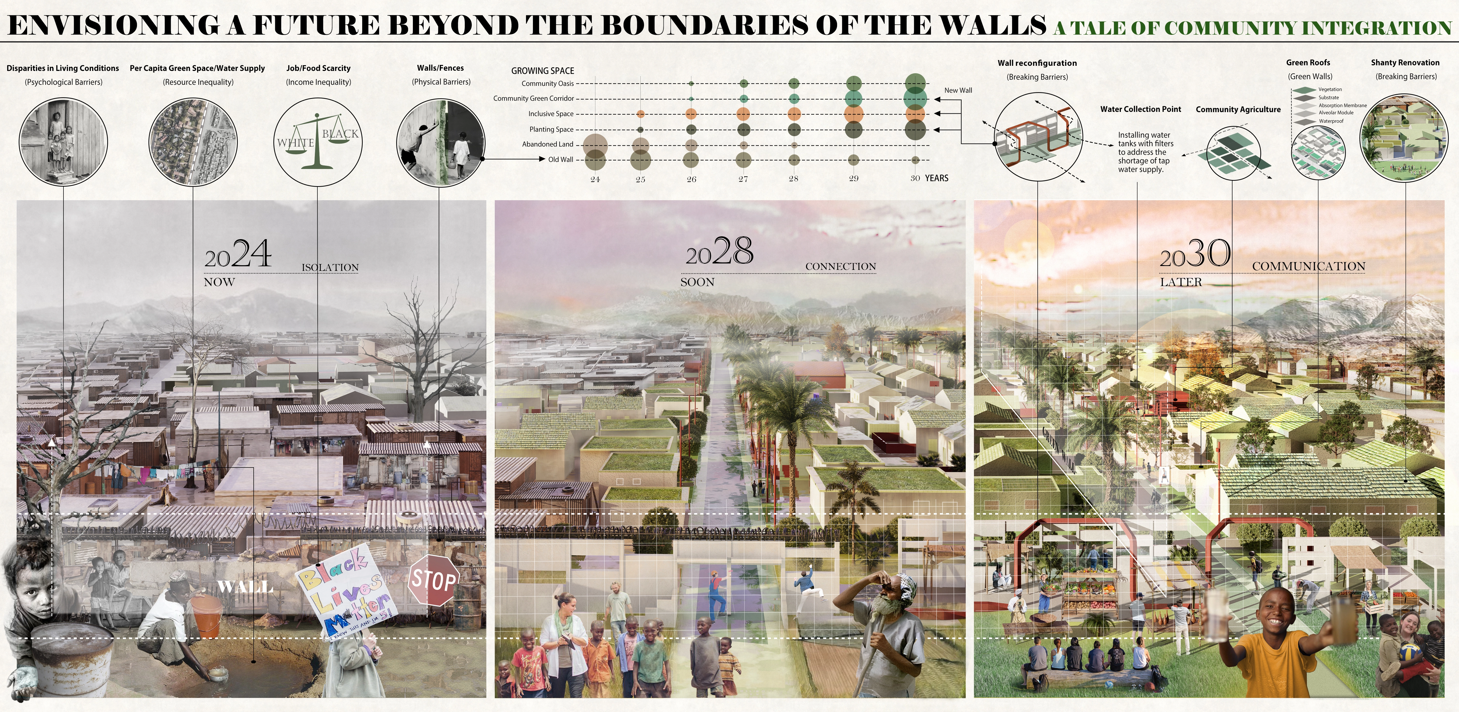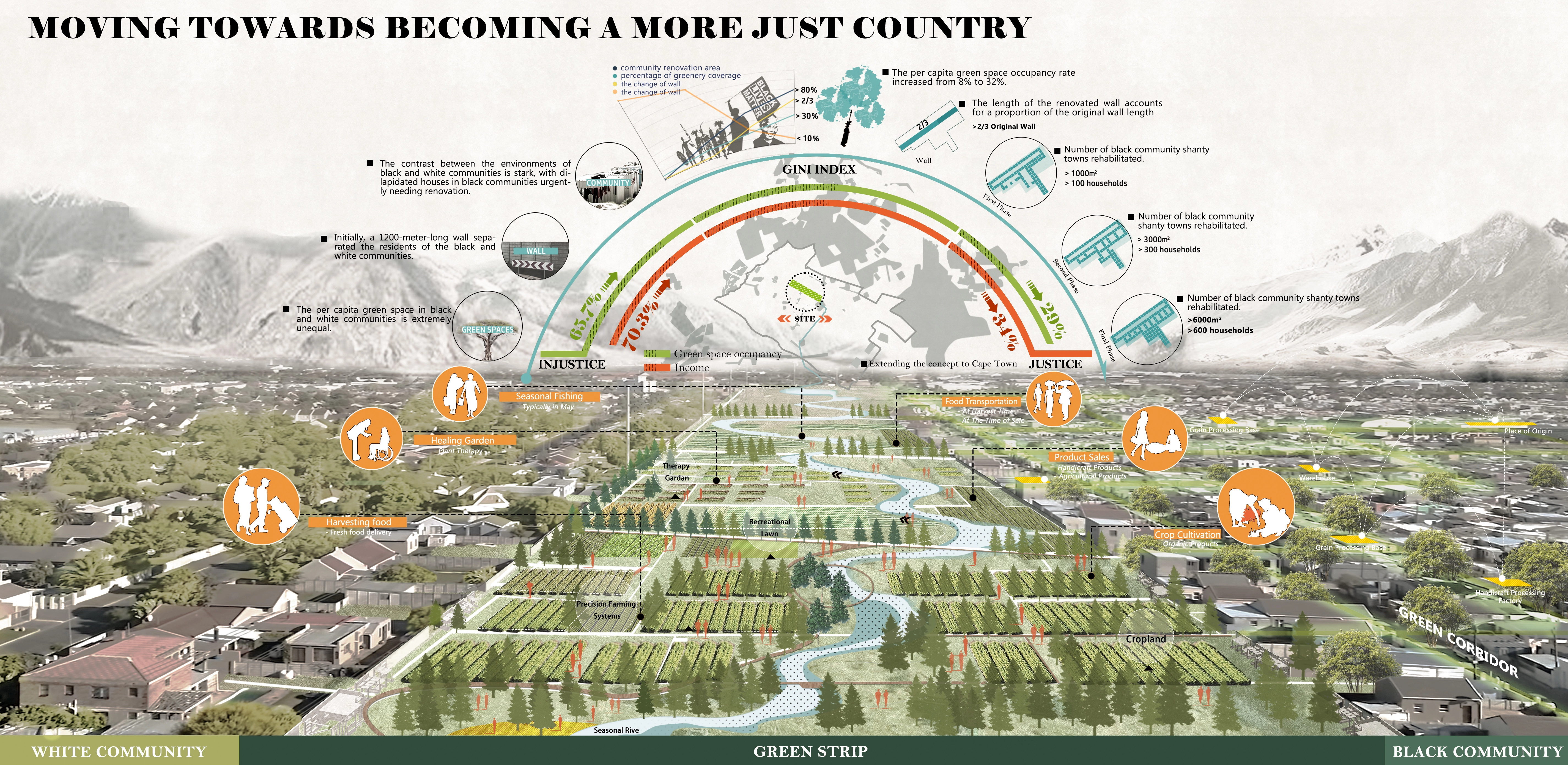 Racial inequality is a challenging global issue, especially pronounced in South Africa. In Cape Town's Asanda and Die Bos communities, two parallel walls and the abandoned land between them completely separate black and white communities. While the white community is affluent, over half of the black residents live below the poverty line, lacking water, fresh food, and etc. We propose a strategy to reconfigure these walls, promote exchange, and restore social equity, responding to ‘ASLA’s Racial Equity Plan of Action’. This project will remove physical and invisible barriers through wall reconfiguration and green space development, achieving environmental justice in the black community and fostering economic exchange between the communities.