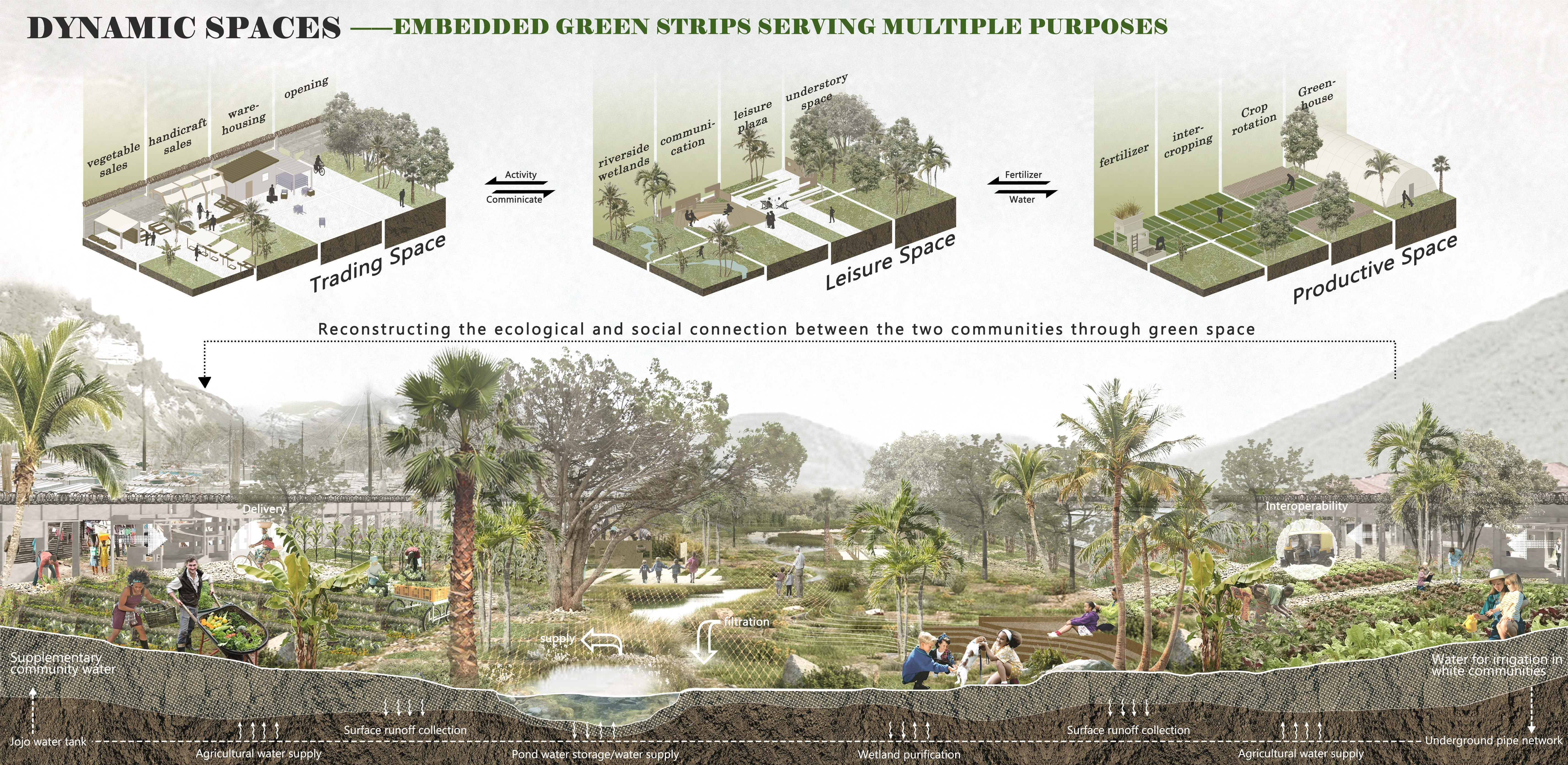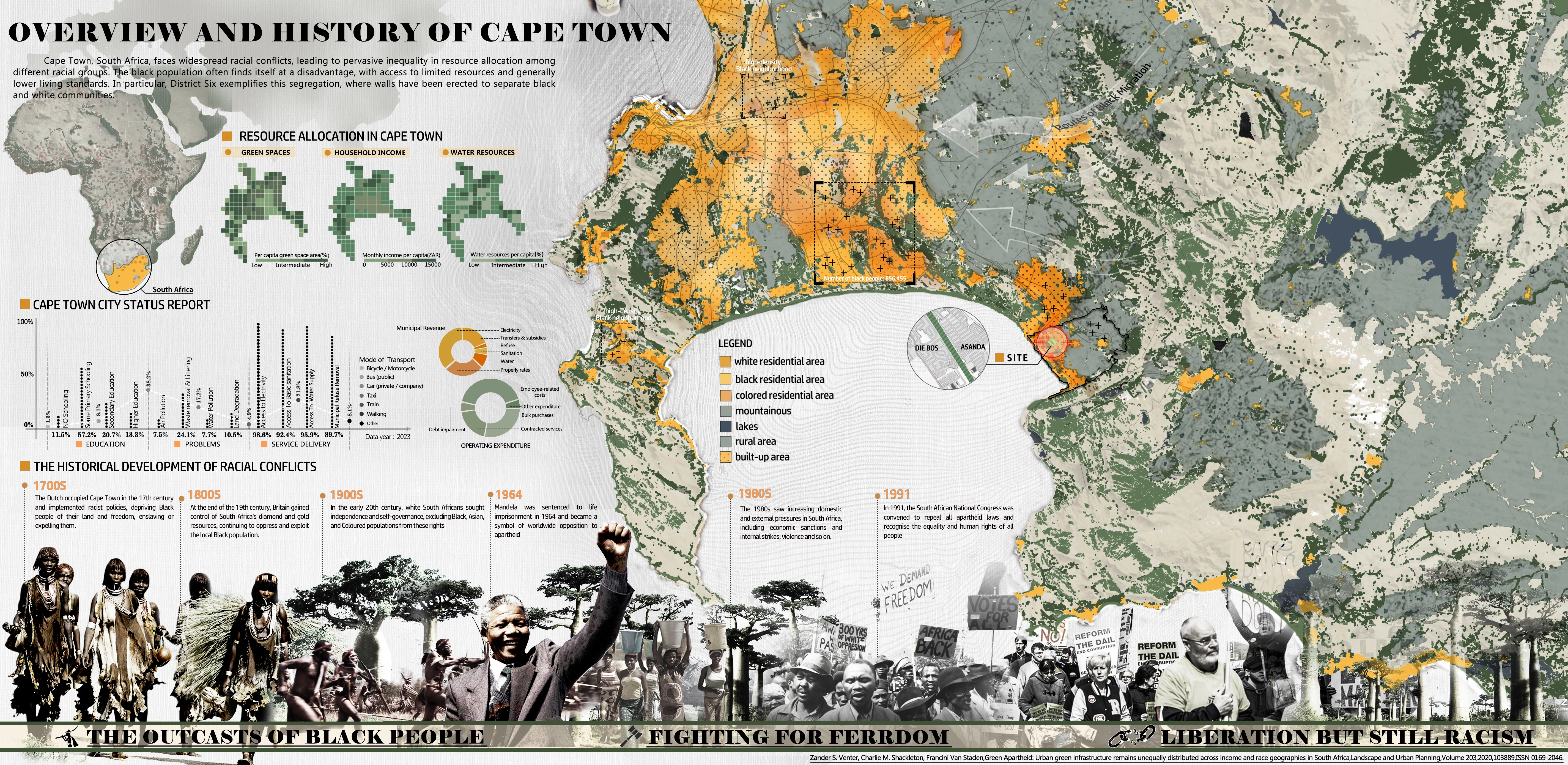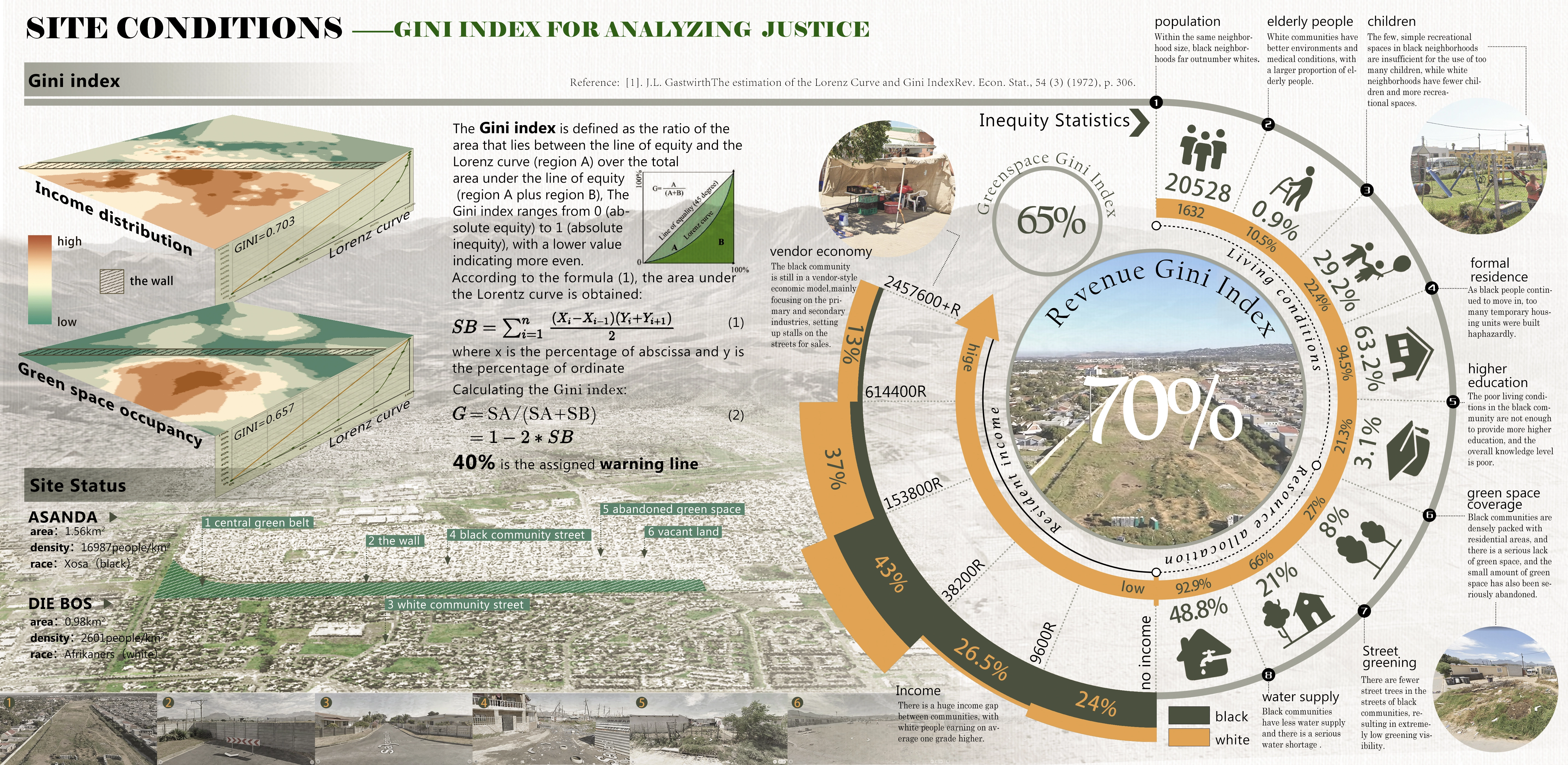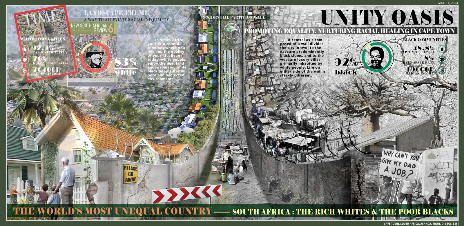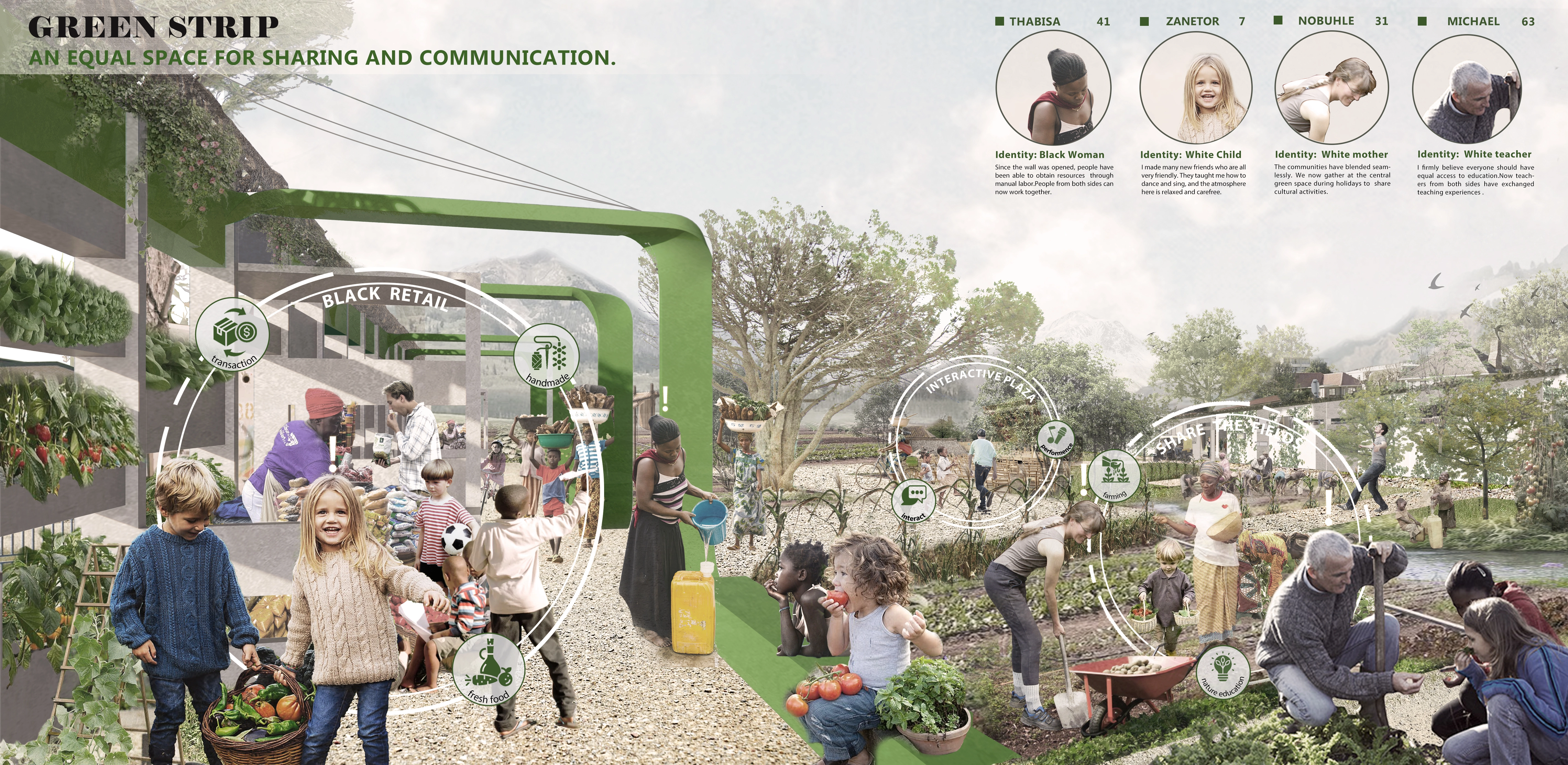 Racial inequality is a challenging global issue, especially pronounced in South Africa. In Cape Town's Asanda and Die Bos communities, two parallel walls and the abandoned land between them completely separate black and white communities. While the white community is affluent, over half of the black residents live below the poverty line, lacking water, fresh food, and etc. We propose a strategy to reconfigure these walls, promote exchange, and restore social equity, responding to ‘ASLA’s Racial Equity Plan of Action’. This project will remove physical and invisible barriers through wall reconfiguration and green space development, achieving environmental justice in the black community and fostering economic exchange between the communities.
