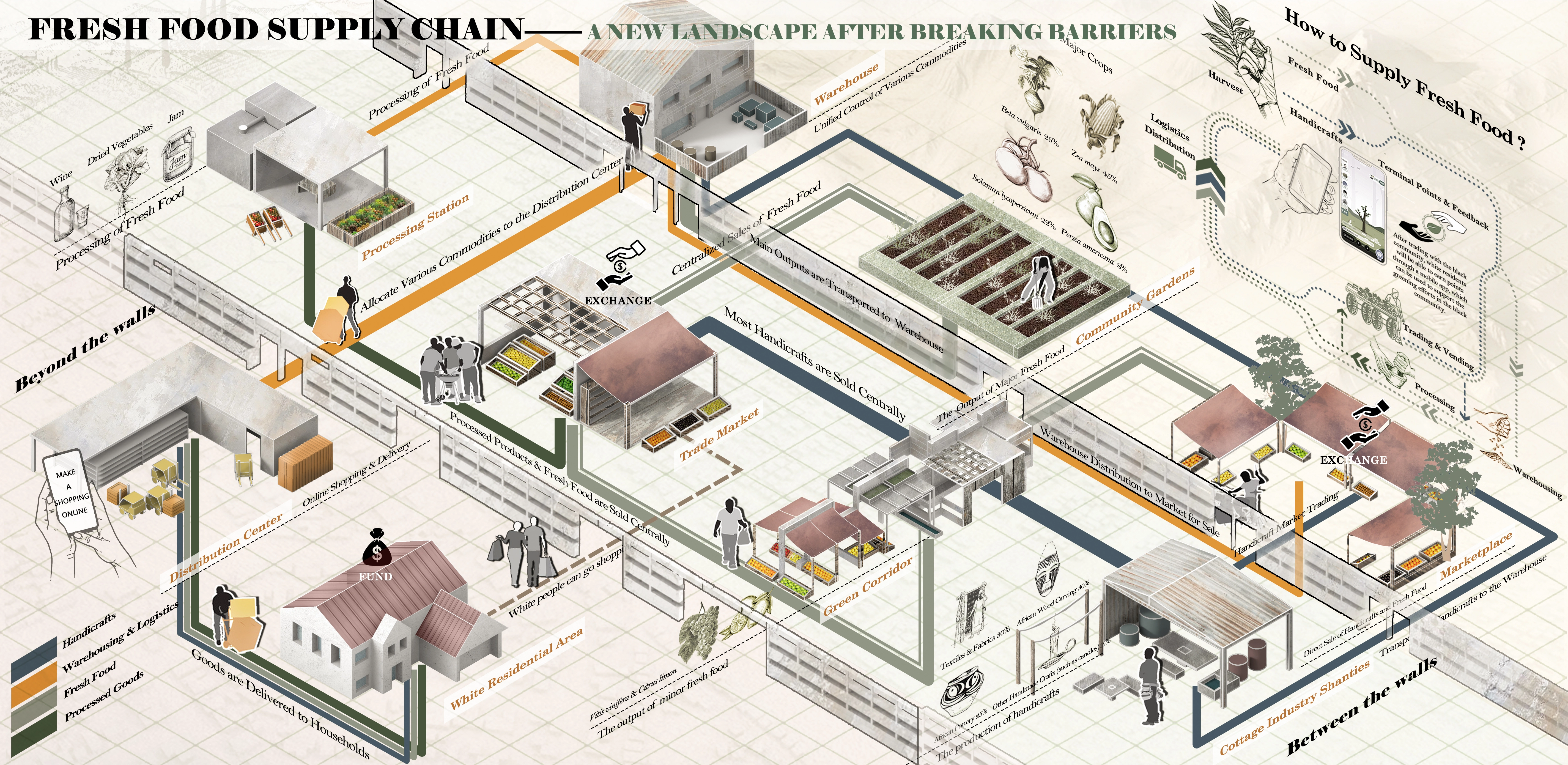 Once the stitching process inside the wall and the majority of the growth process outside the wall are completed, the two communities will be tightly linked as a single system. A complete fresh food supply chain will emerge, relying on the designed green spaces and renovated communities, facilitating economic exchange on equal terms. The black community will primarily serve as producers, leveraging their agricultural and handicraft industries through farmlands, processing stations, and trade points. The white community will serve as consumers, with distribution centers receiving online orders and black community members delivering products to their doors. The consumer spending from the white community will, in turn, support the development of green corridors in the black community. This system will alleviate poverty and unemployment in the black community and promote resource redistribution. The success of these measures can be directly reflected through the Gini index.