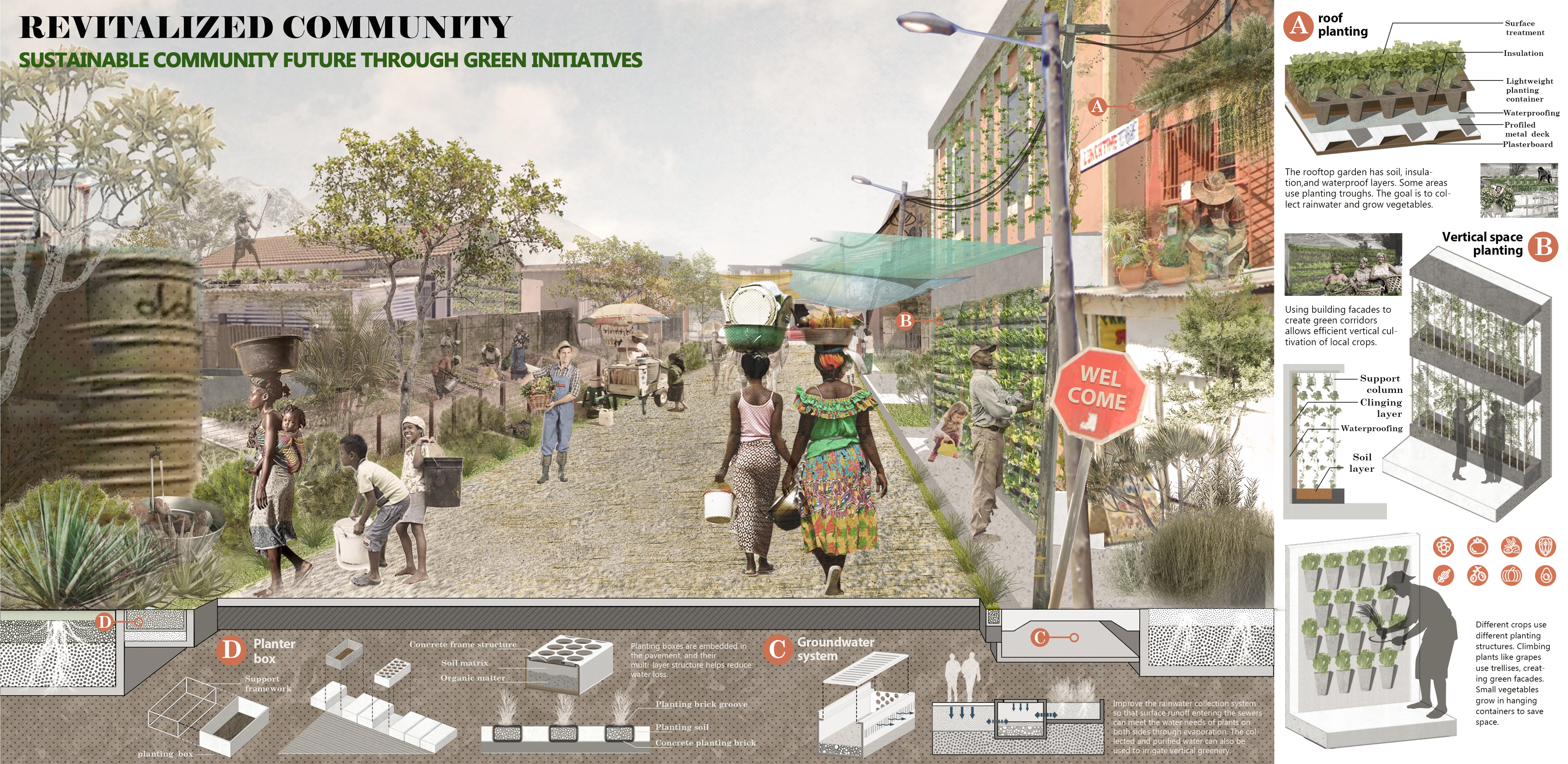 We will apply the concept of growth to the communities. To address environmental injustice in the black community, we will establish green corridors that grow over time, providing more green spaces for the black community. These corridors will link inclusive spaces along community streets and integrate with renovated shanties and green walls. Over a longer period (3-7 years), the collaborative efforts of community residents will extend these corridors to connect the entire community. These green corridors will help collect and purify rainwater, produce local fruits and vegetables (‘imifino’), and enhance water and food access. In the white community, similar green corridors will be established, connecting different logistics nodes and aiding in rainwater management.