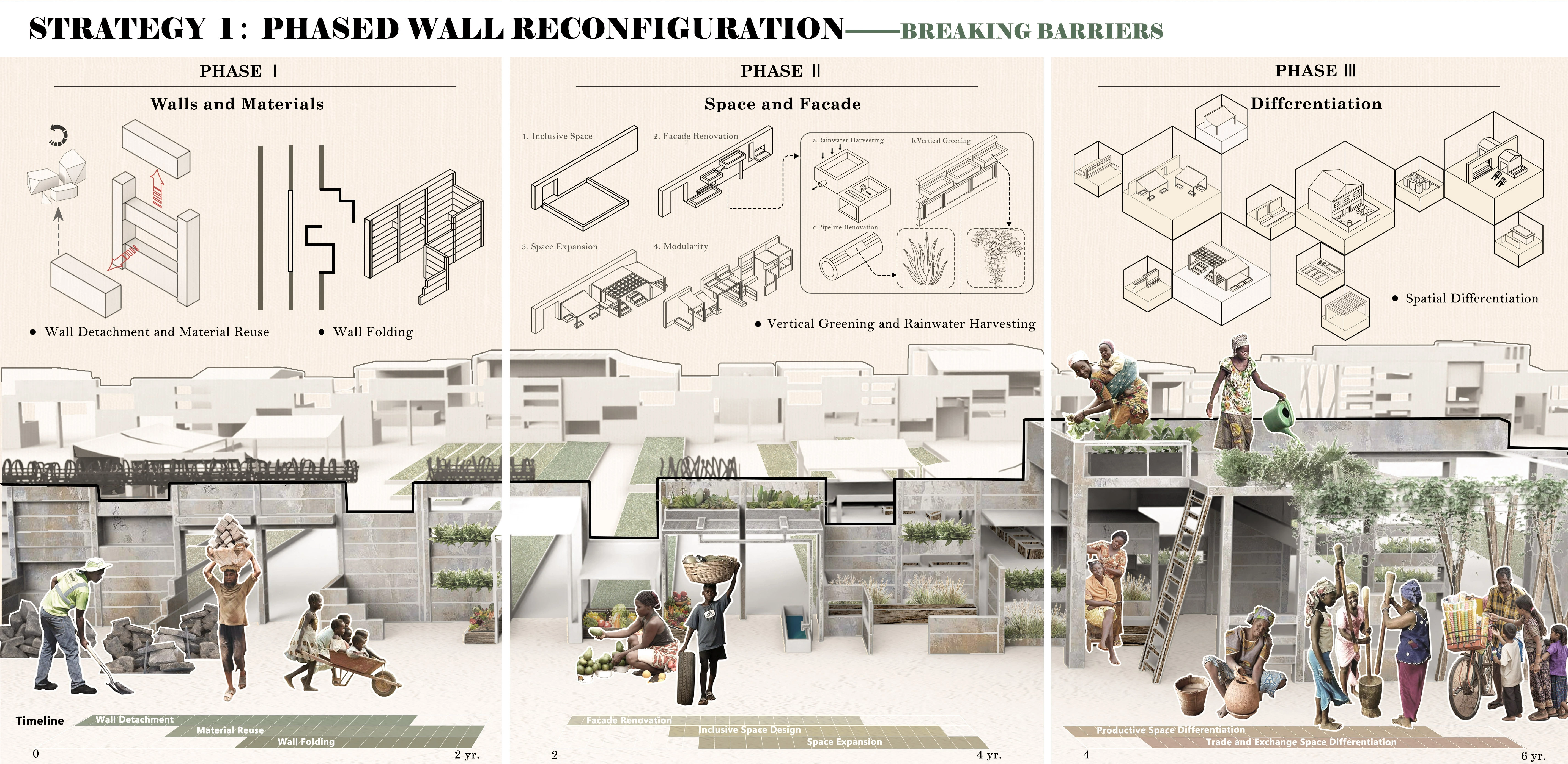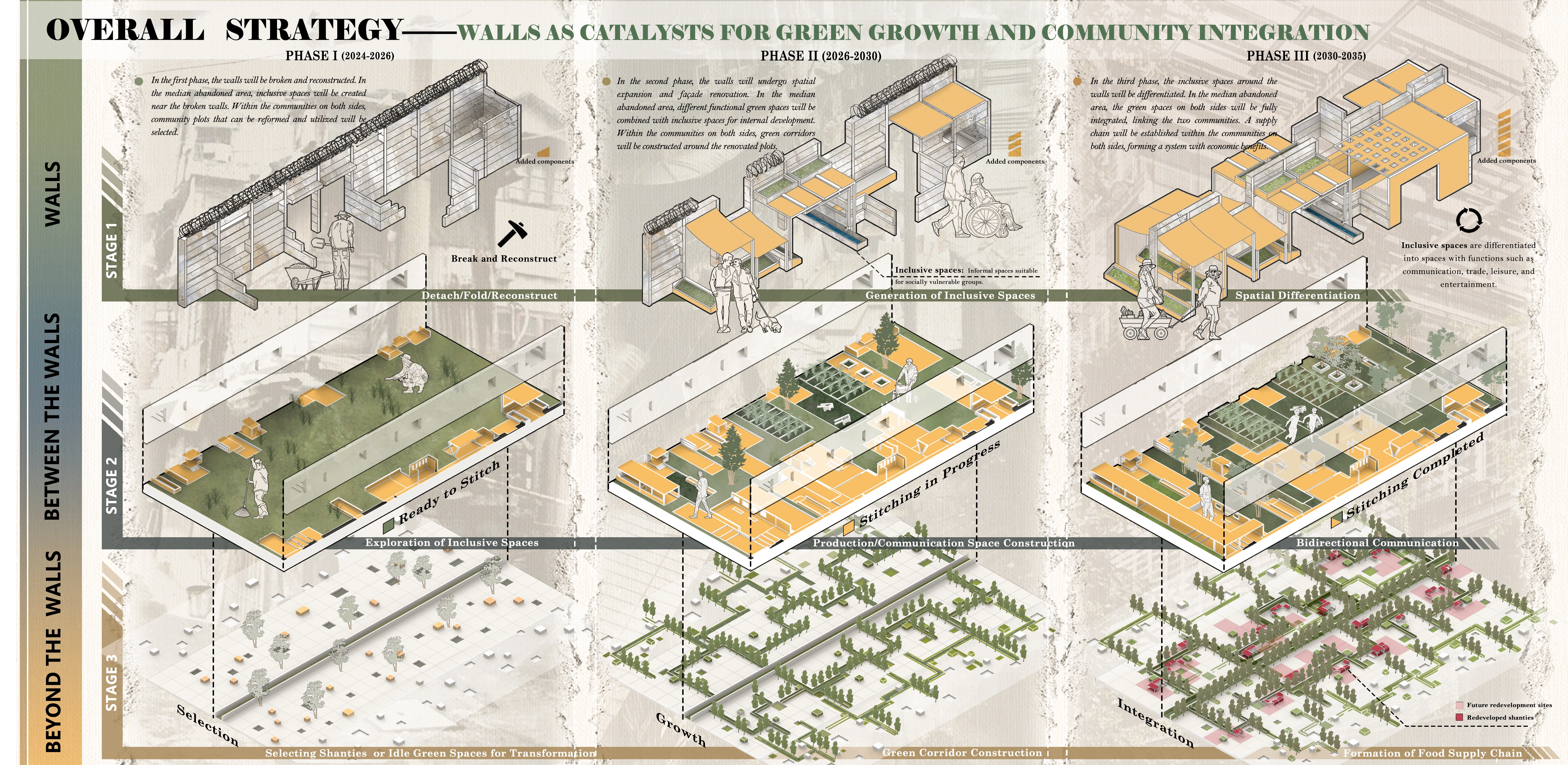 We will address the abandoned area within the walls through ‘stitching’. By dismantling and reorganizing components of the walls, we will break the complete separation and create inclusive spaces around the walls. These inclusive spaces will gradually differentiate into other functional areas such as farmland, trade, and art exhibitions. Green spaces will start growing from the inclusive spaces on both sides, and the joint governance of these green spaces by the two communities will facilitate the merging of functional strip-like green spaces. This is a dynamic process that will ultimately stitch the two green spaces together, fostering both spatial and emotional reconciliation between the communities, creating a platform for equal dialogue and shared governance.