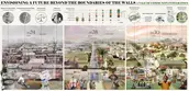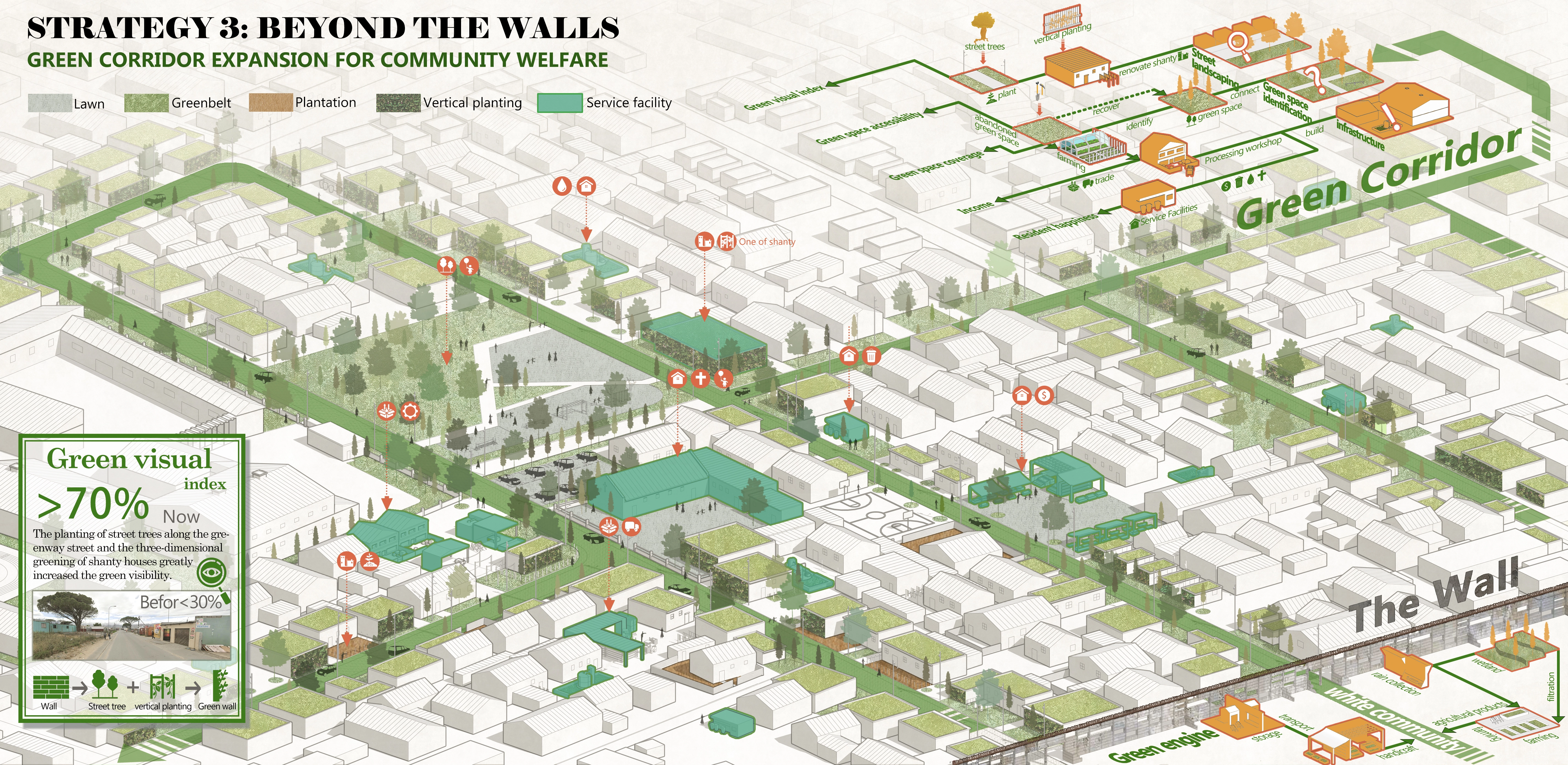 The concept of growth will be implemented on the walls and the communities beyond the walls. Static walls will transform over time, expanding into the communities on each side. These walls will no longer be limited to concrete structures; they will connect the two communities in the form of green walls and green corridors.