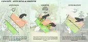 The concept of stitching will be applied to the area between the walls. Strip-like green spaces, acting as inclusive spaces, will grow from the base of each wall. Over time, the green spaces on each side will expand and eventually meet, stitching the two isolated communities together.