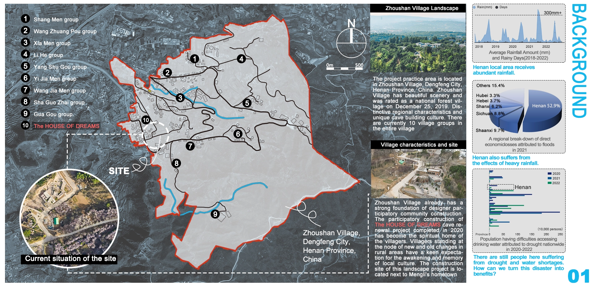 Global warming has increased carbon emissions and natural disasters. Rural areas, lacking drainage systems, face severe flooding and drought. Proper rainwater storage brings significant benefits. Strengthening rural water systems with low-carbon, sustainable solutions is essential. We chose Zhoushan Village, Dengfeng City, Henan Province, as a pilot site.