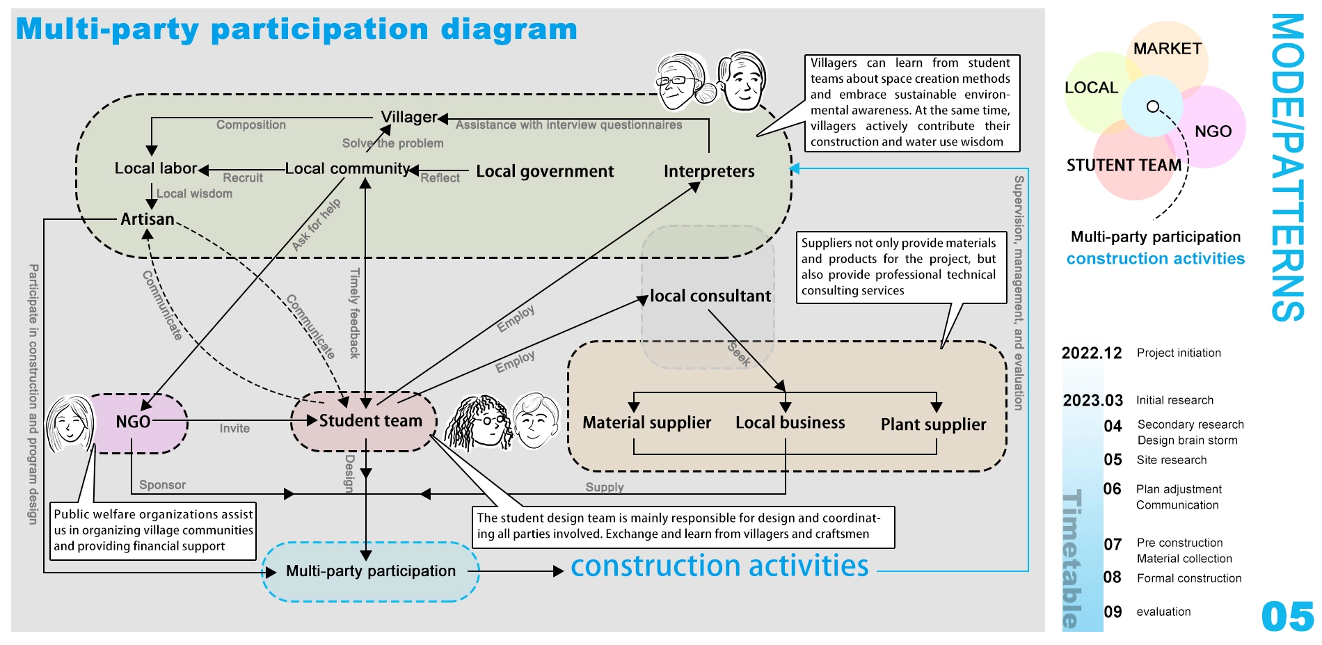 This project in Zhoushan Village, Henan, China, addresses water shortages and soil erosion through a low-carbon water circulating landscape. It uses local and recycled materials and employs permeable paving to protect the ecosystem and reduce costs. The muti-party participation model enhances villagers' skills and environmental awareness. The design team and suppliers improved cultural and technical knowledge, bringing economic benefits to elderly workers. Coordinated by NGOs, this collaboration not only tackled practical issues but also strengthened community ties and promoted rural revitalization.