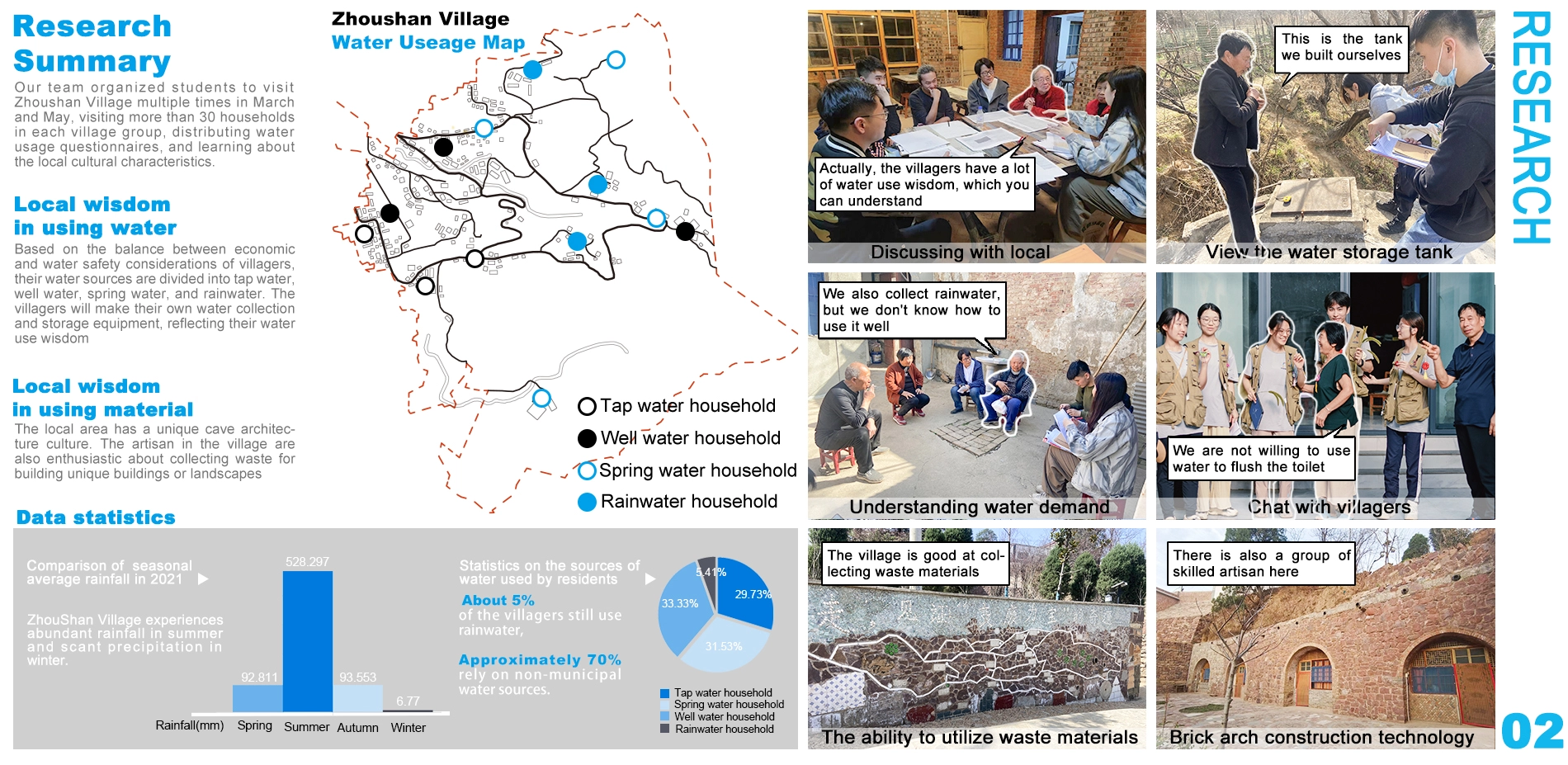 The project, conducted at the "House of Dreams" in Zhoushan Village, known for its unique cave architecture. On-site surveys assessed villagers' water needs. Average rainfall is 92.811 mm in spring and 528.297 mm in summer. Proper rainwater use can turn droughts and floods into benefits.