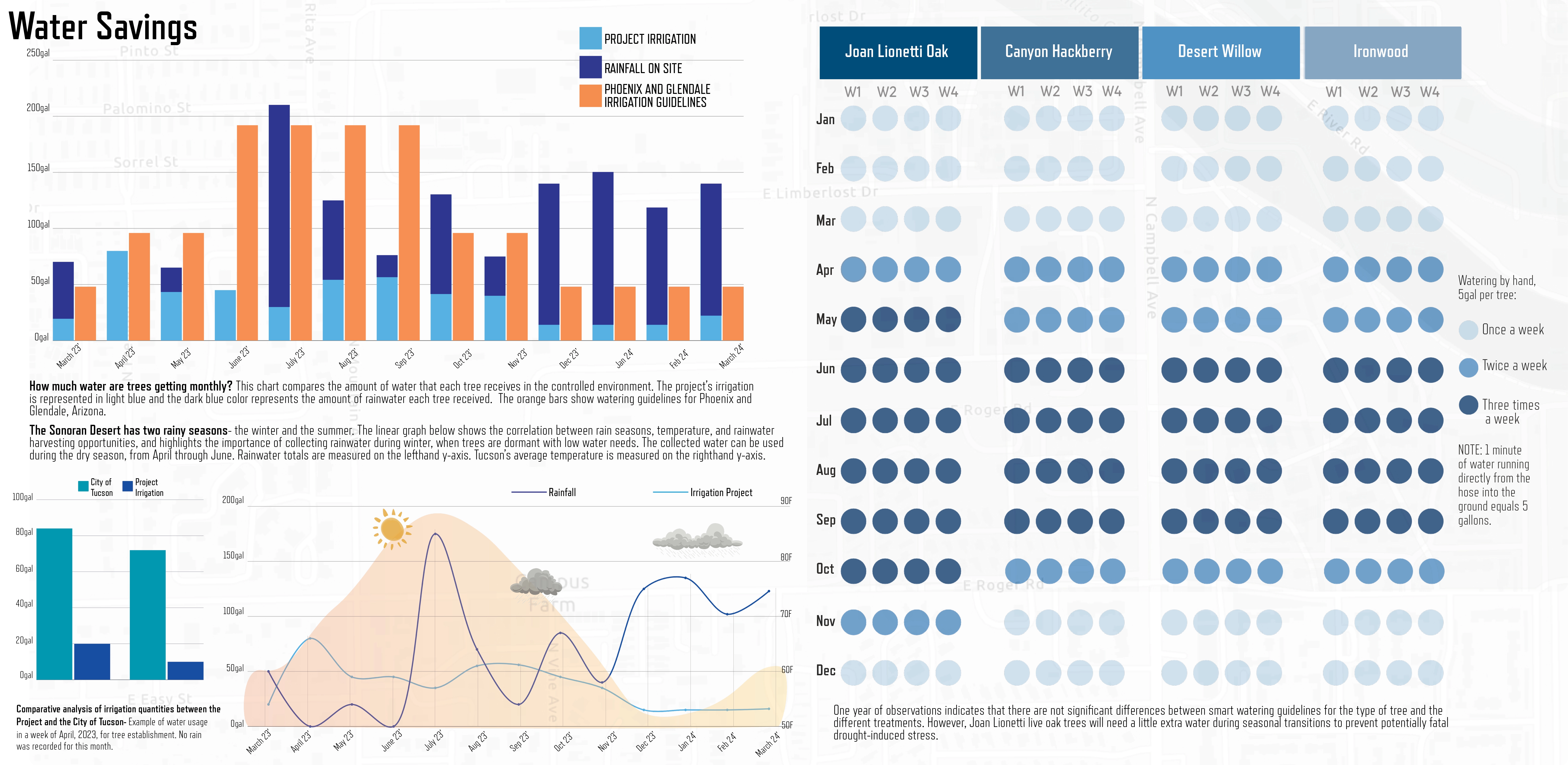Our project goals were two-fold. First, we identified drought-adapted tree species to test minimal water consumption during establishment. We found that water usage can be reduced by 30-50% during the first year of tree establishment while maintaining positive moderate growth in all species but the Joan Lionetti live oak. Actively working with stakeholders and horticulturalists increased the overall survival rate of trees and resulted in annual savings of 1,700 gallons of water per tree. In addition to correct plant selection for reduced water use, we tested slow water practices to quantify impacts on soil health and tree growth. Our observations show that experimental treatments maintained 22-37% higher soil moisture content compared to conventional drip irrigation planting. While Joan Lionetti live oak had the slowest growth during the 2023 summer growing season, the average growth of the canyon hackberry was 53 cm, which was the most significant change in height of all species. Our results empirically demonstrate that smart watering treatments provide water-saving benefits and mitigate heat within Southern Arizona’s urban environment.