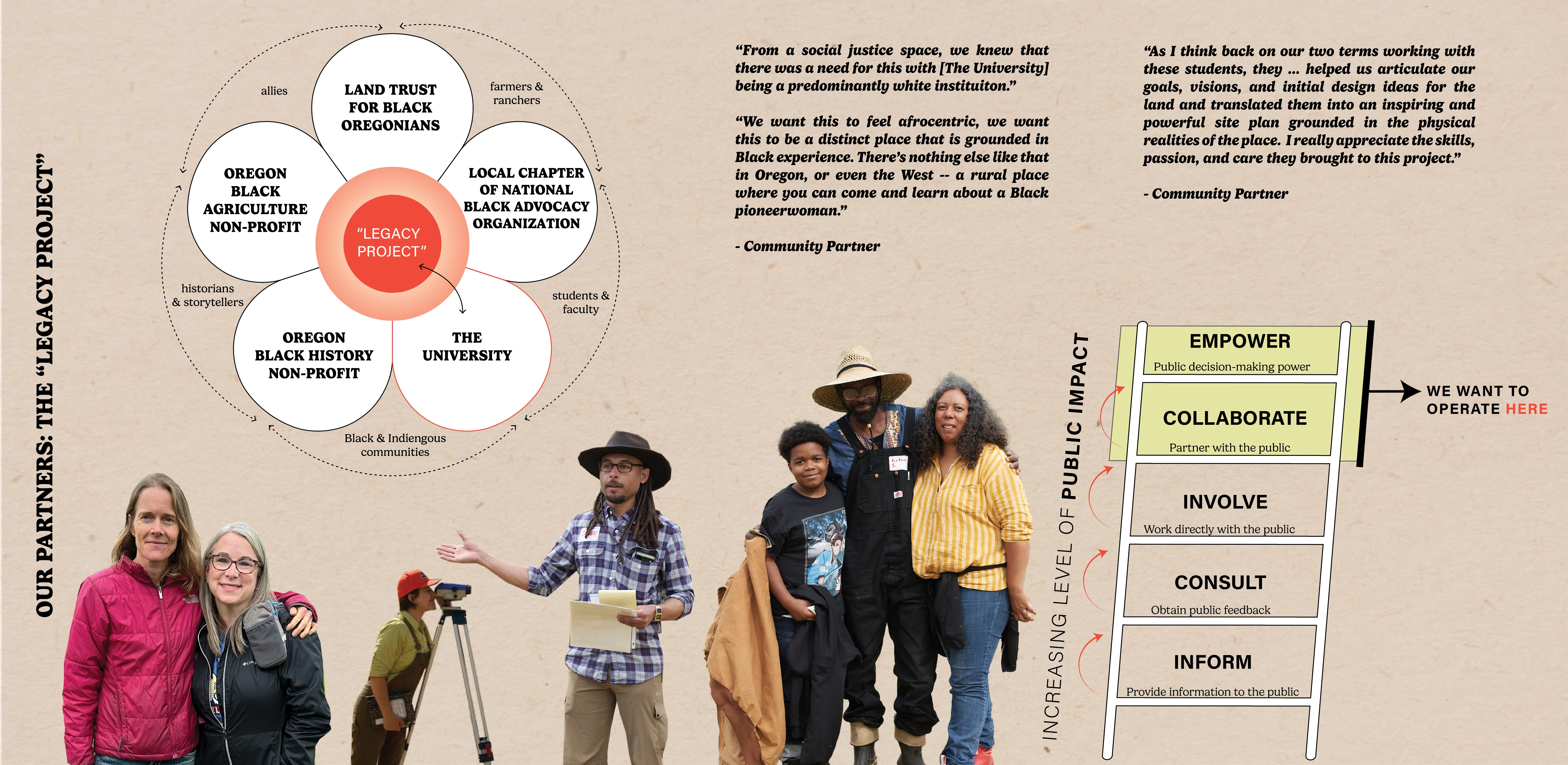 Working with the Legacy Project — a partnership between the land grant university, four Black-led community organizations, and an array of community stakeholders — this studio helped to examine the entangled past and present narratives of this site with an eye towards future programming. Our design process was guided by the goal of building authentic relationships, with active communication and extensive community engagement over 6 months. We approached this process with respect and curiosity, listening to our partners’ needs, desires, feelings, and experiences, and balancing the diverse perspectives of numerous stakeholders. Together we came up with project goals connected by an overarching theme of healing – healing ourselves, healing our community, and healing the land.