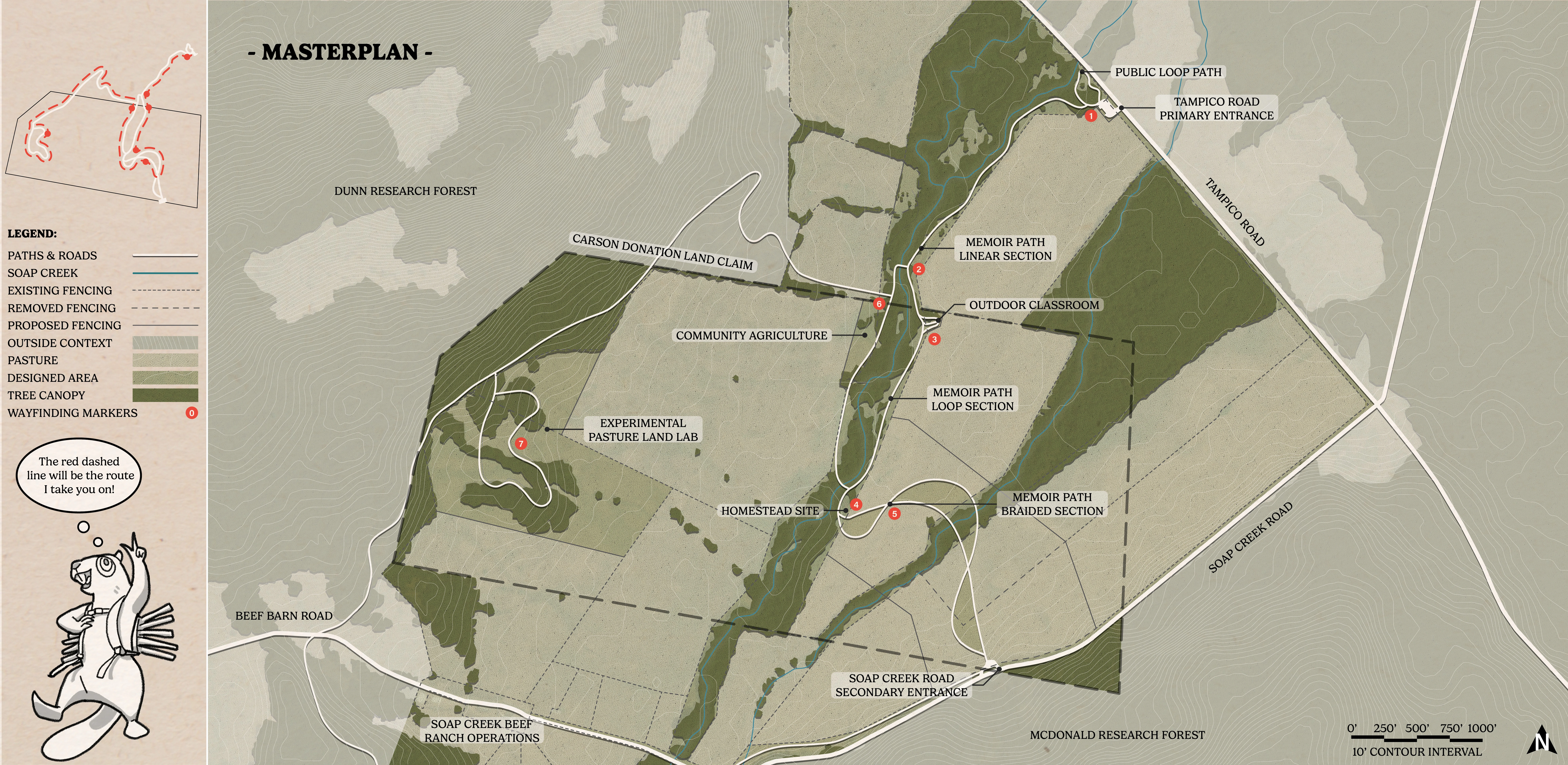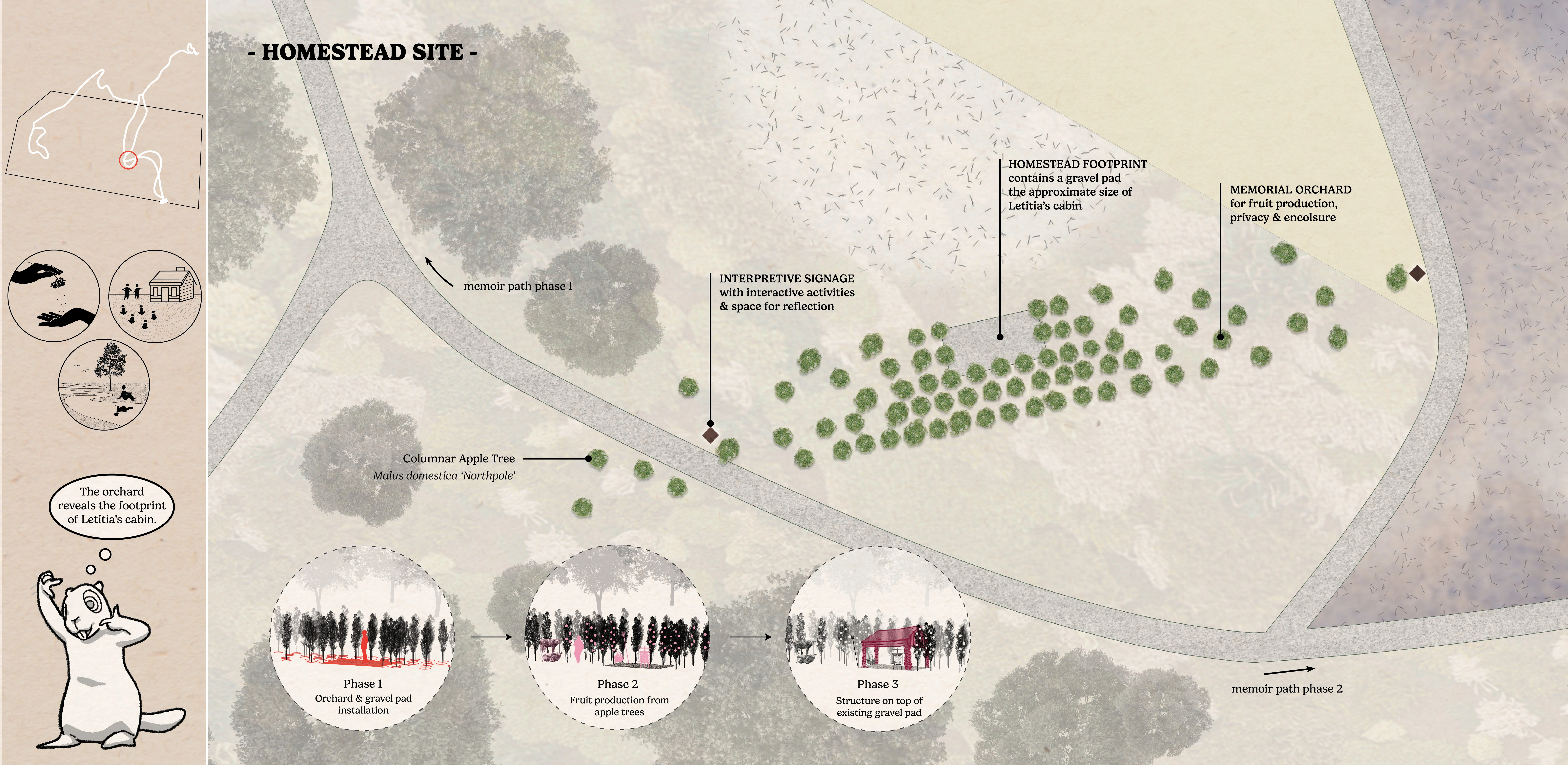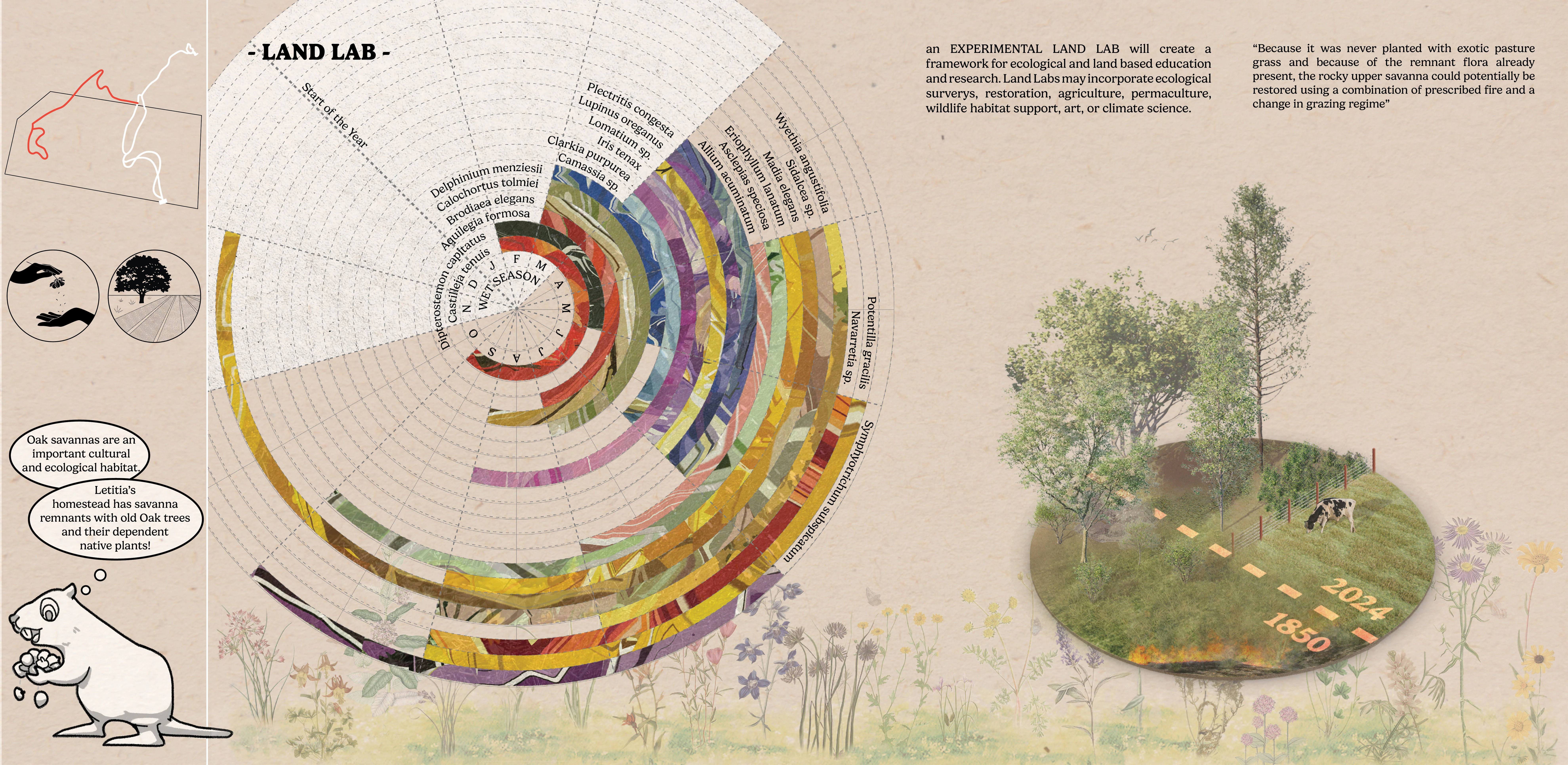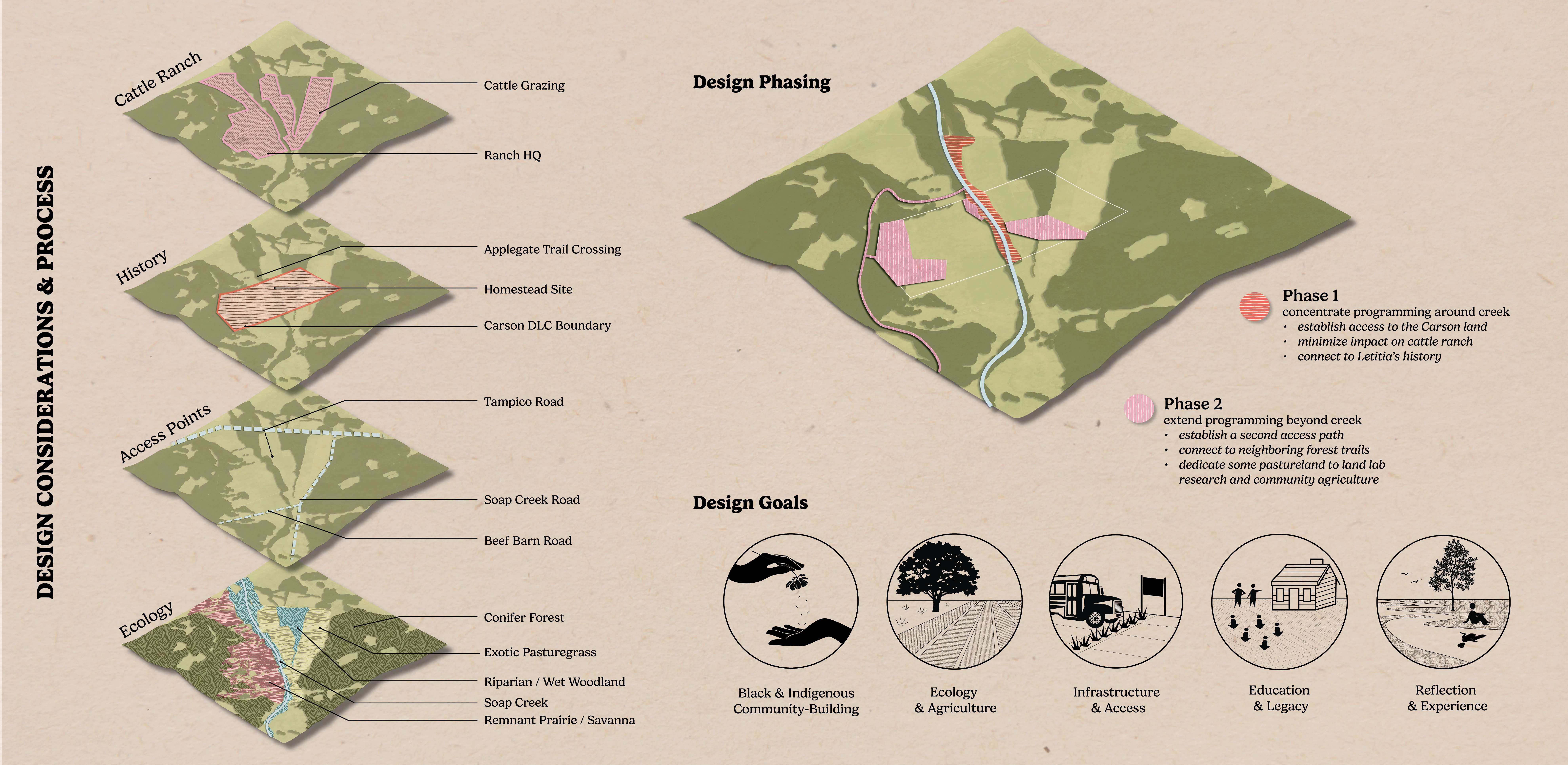 Letitia Carson’s Legacy utilizes the skills of landscape design to uplift several community organizations dedicated to honoring Letitia Carson, one of the first Black homesteaders in Oregon. This conceptual design made tangible the visions of our partners through the process of building authentic relationships and finding common ground through land stewardship. The final booklet has already been used to begin fundraising efforts, support grant applications, and gain approval to begin construction on Phase One. This studio addresses many challenging concepts, including the delicacy of telling a history embedded in narratives of race, gender, displacement, and colonialism, all while supporting current agricultural land use.