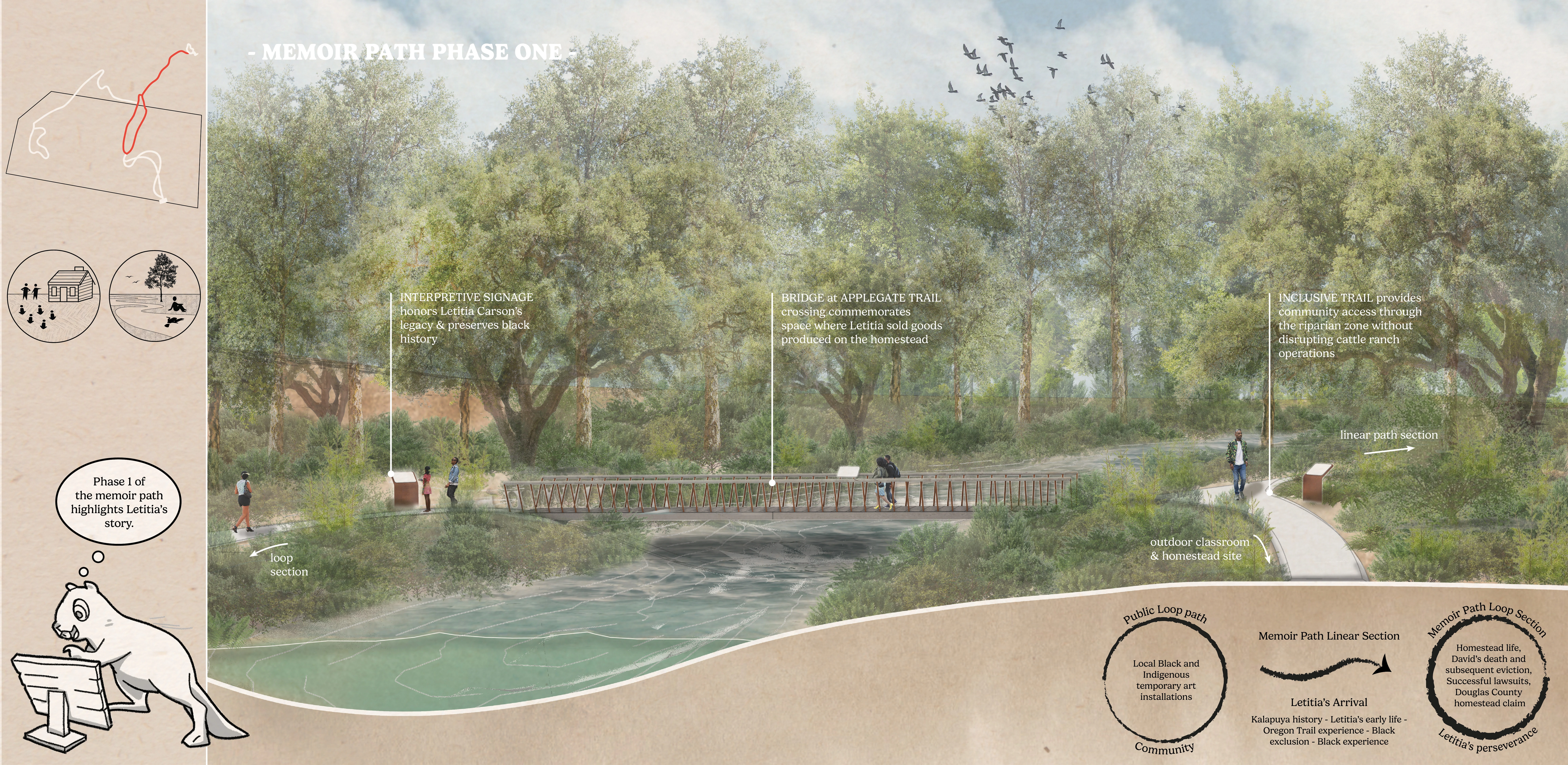 Letitia Carson’s Legacy works to highlight Letitia’s unsung story of resilience and bravery. Design elements reconnect Black and Indigenous communities to the land through education and stewardship and inspire reverence for Letitia’s story through Memoir Trails and an interpretive Homestead Site. The design works within the needs of the existing Beef Ranch, allowing for year-long rotational cattle grazing as currently scheduled. Instead of considering ranch operations as a limitation, this project celebrates current land-use by highlighting Letitia’s identity as a cattle rancher and linking past with present.