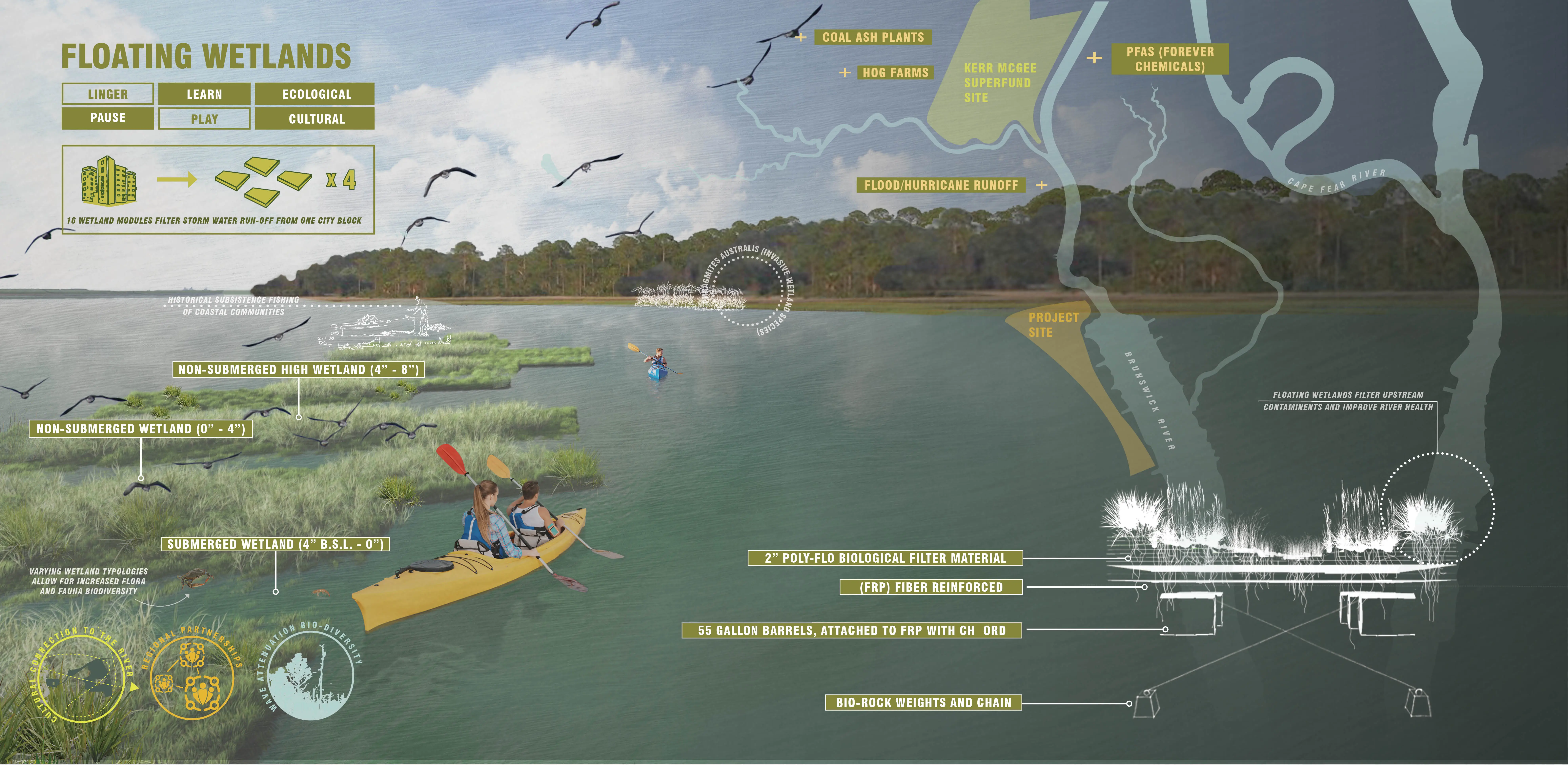 Floating Wetland Modules provide on-site research opportunities via partnerships with other regional restoration and preservation organizations such as Eagles Island Restoration Project, Kerr Mcgee Superfund Site, and UNCW. The modules are positioned along the historic edge of the river to attenuate wave energy, mitigate erosion, and improve water quality. The form of the wetland module establishes varied microhabitats, generating robust wetland habitats with increased biodiversity.