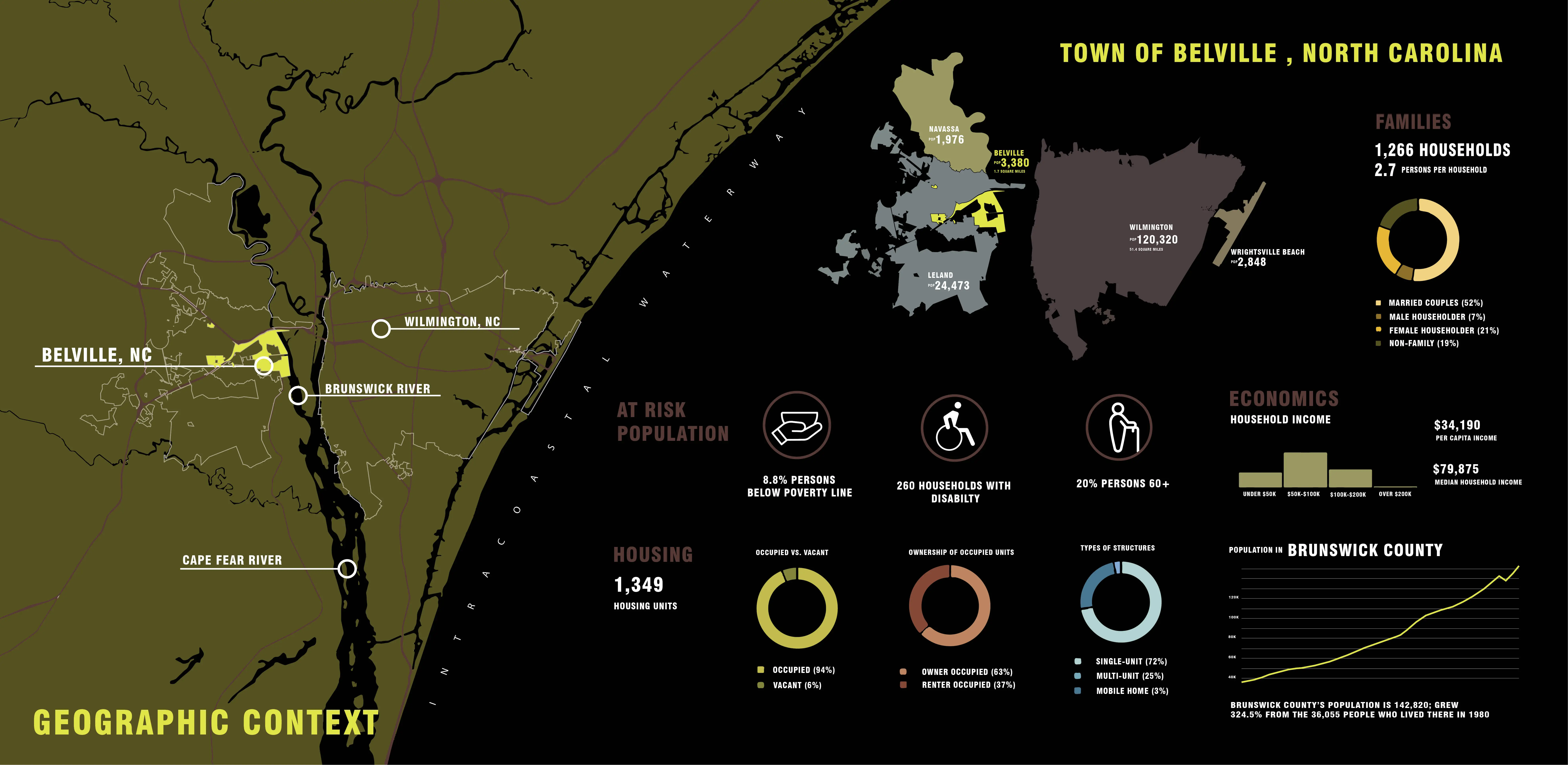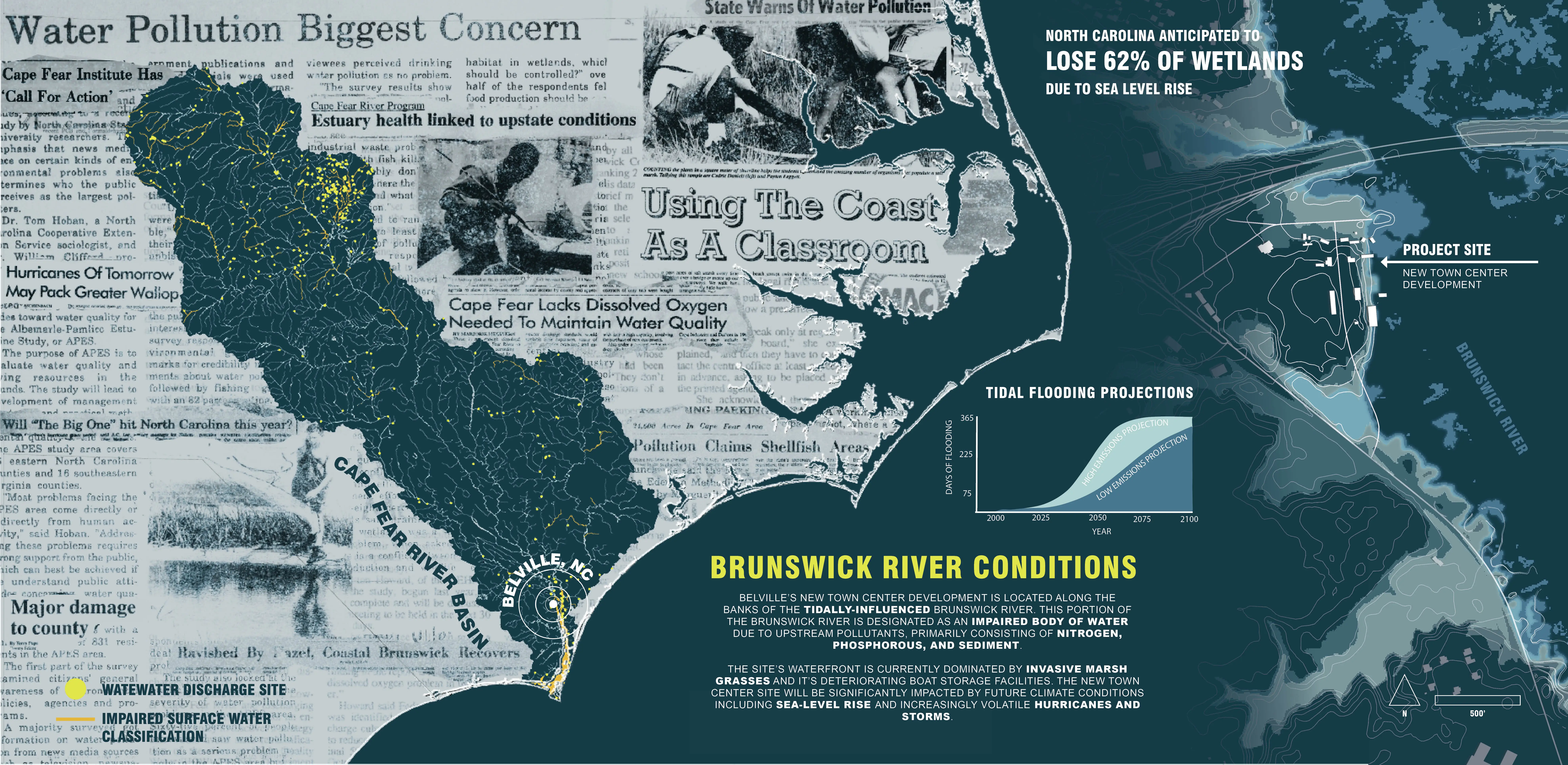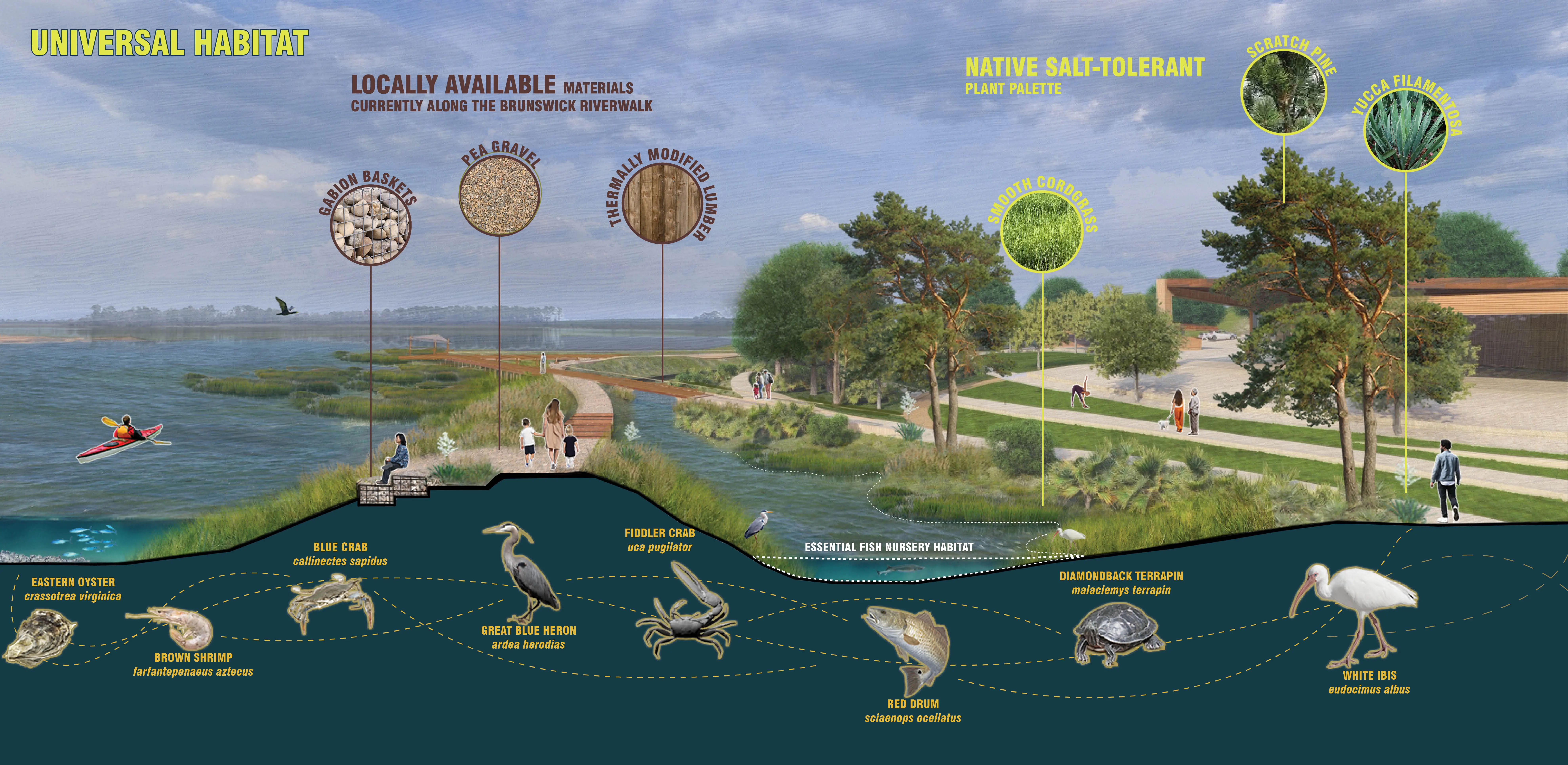 The Long Marsh Forward leverages climate-responsive design and local ecology to regenerate Belville’s connection to the Brunswick River. This project reimagines the community’s relationship to the tidally-influenced Brunswick River through aquatic and terrestrial recreational spaces, providing new economic drivers. An adaptive riverfront park ties Belville into a larger blueway system, restoring the region’s historic relationship to the water and enhancing the town’s identity. The design fosters a deeper connection to the river, promoting the well-being of residents, visitors, and local ecosystems, while creating regional networks and partnerships amongst the development pressures of residing in the fastest-growing county of North Carolina.