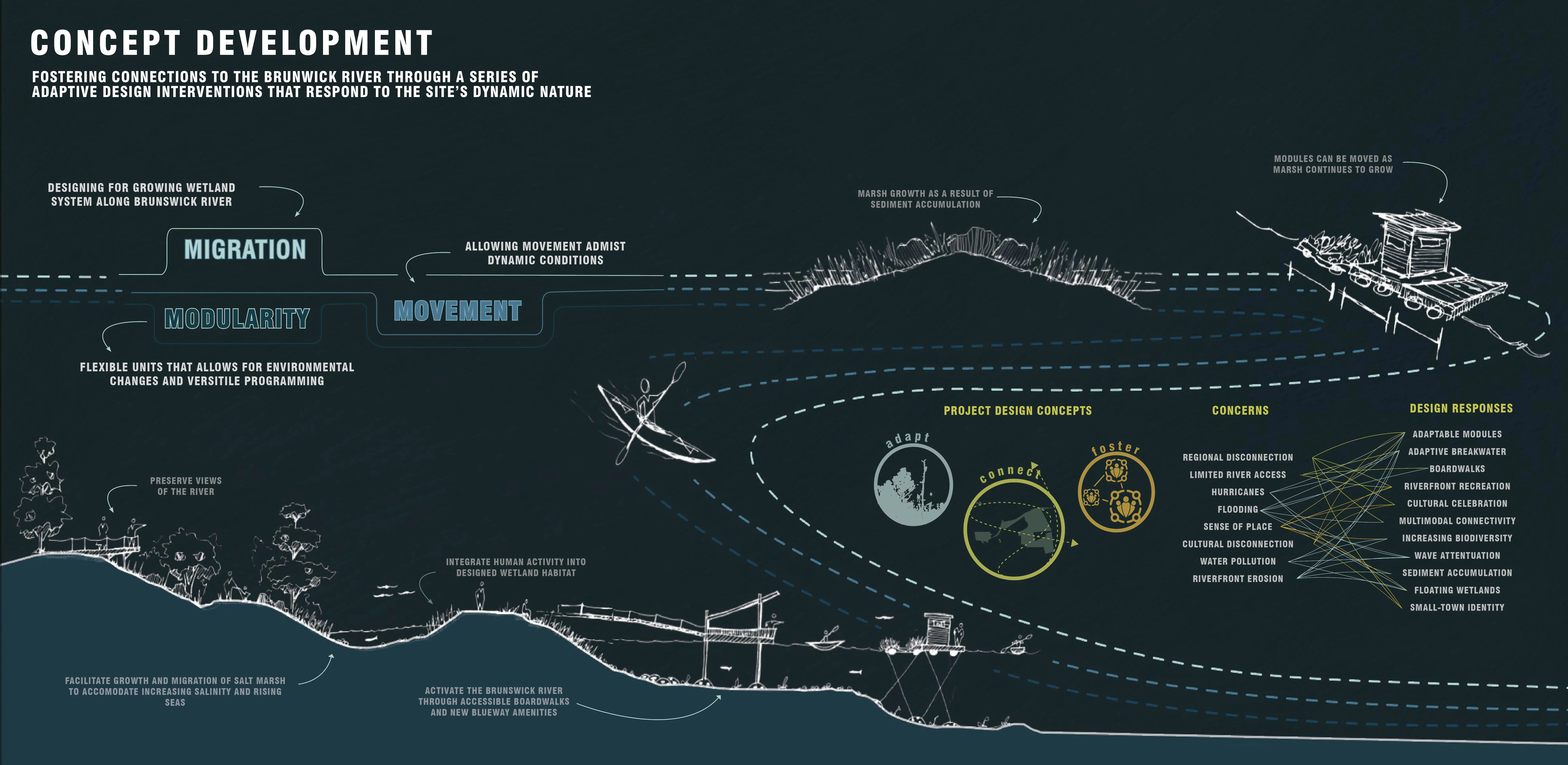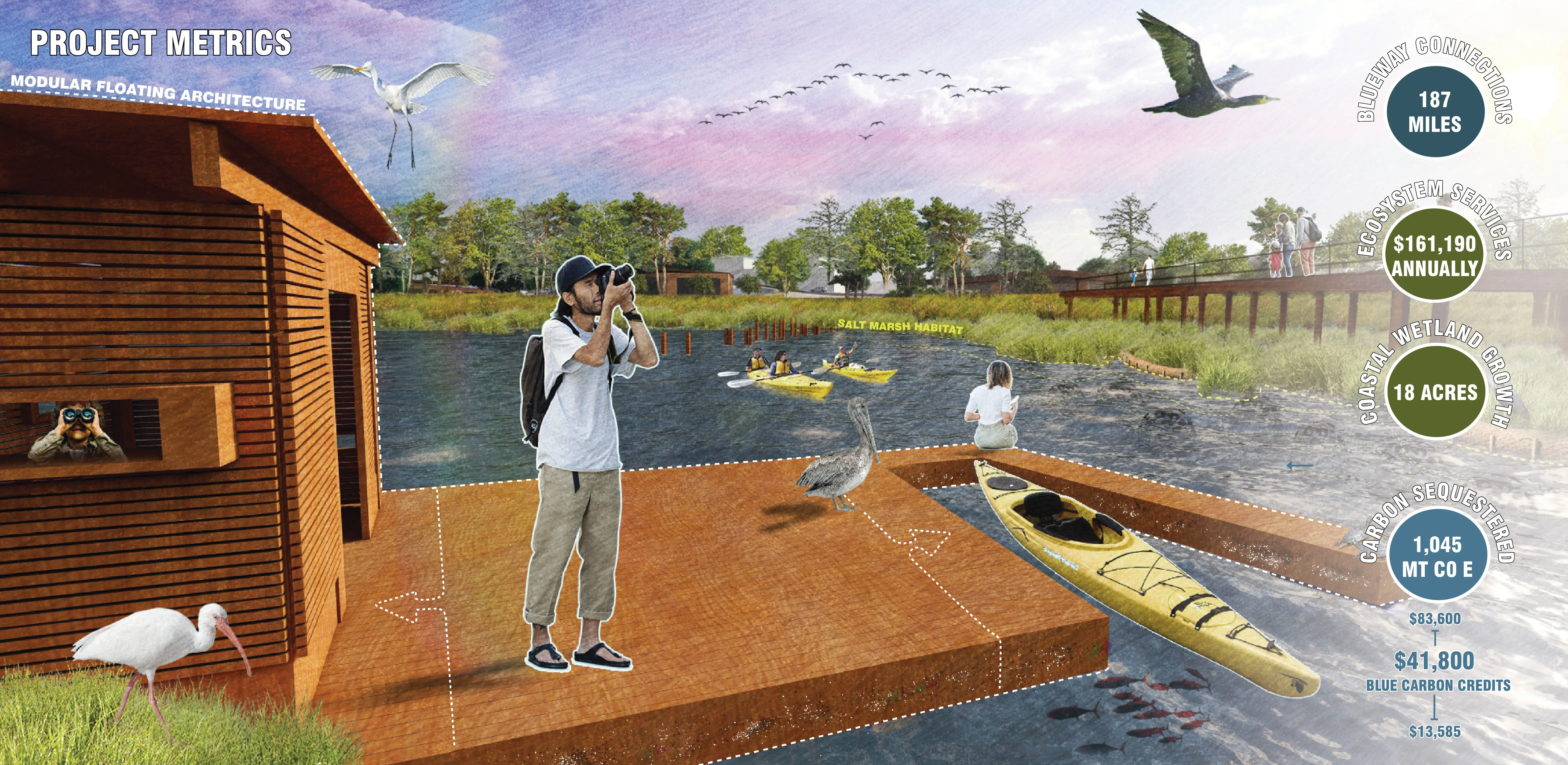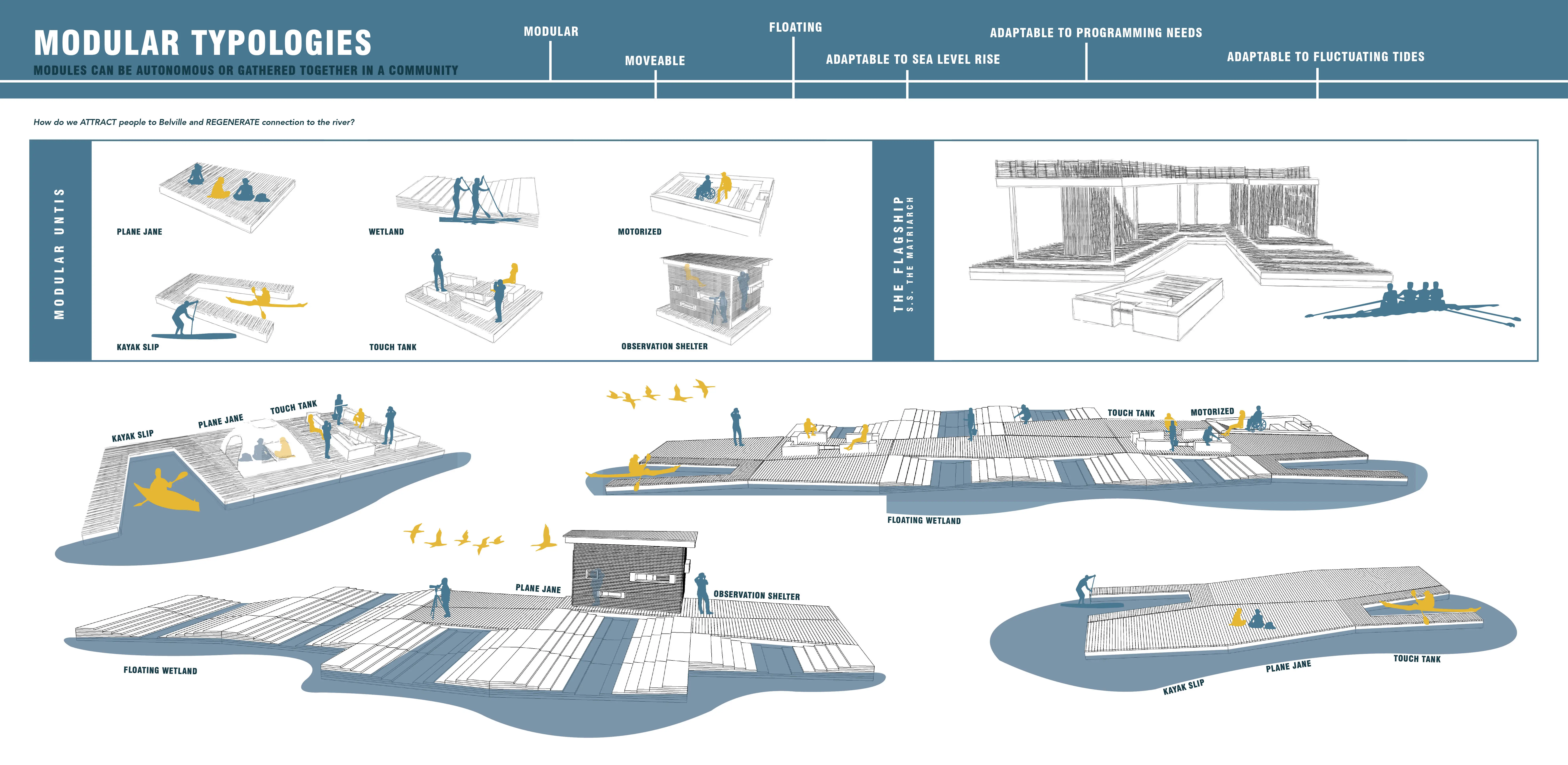 Inspired by the migration of the marshlands, fluctuating tides, and sea-level rise, our design introduces floating, moveable, and low-impact modules that regenerate a connection to the river. The six module types can function autonomously or be combined to create adaptable spaces suitable for varied programming. The low-impact design of the modules preserves Belville’s shoreline, allowing the land to heal from its industrial past while still acknowledging its history. The use of Bio-Rock weight/chain anchors and screw piles ensures minimal impacts on the aquatic ecosystem.