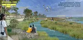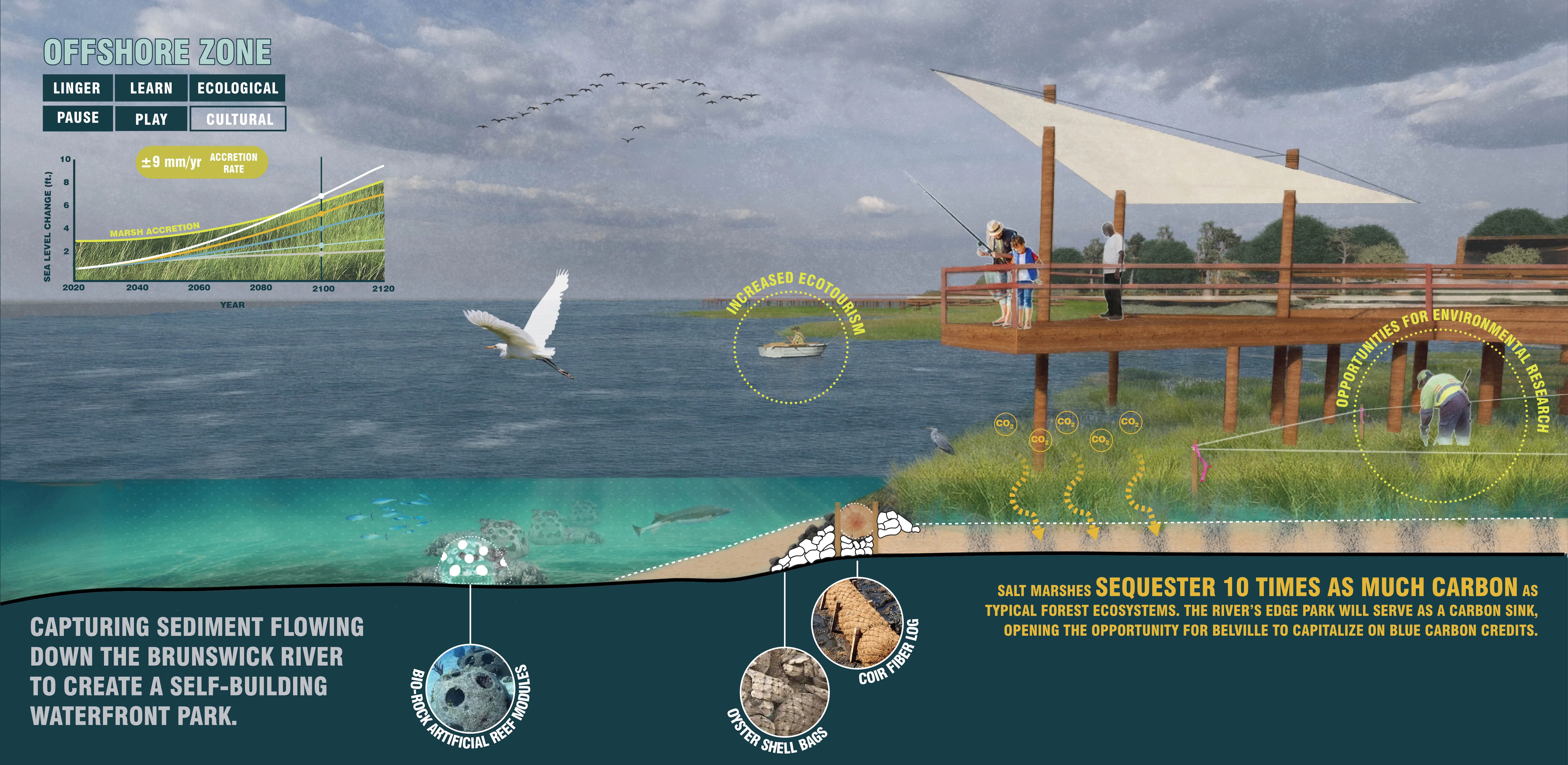 A series of artificial reefs and living shoreline structures along the edge of the historic river’s edge will accrue sediment flowing downstream. These offshore interventions will generate new marshland habitat, sequestering carbon and mitigating storm damage. Blue carbon credits from the growing salt marsh offer a new regional opportunity for economic growth. The profits from these blue carbon credits can support park maintenance and development.