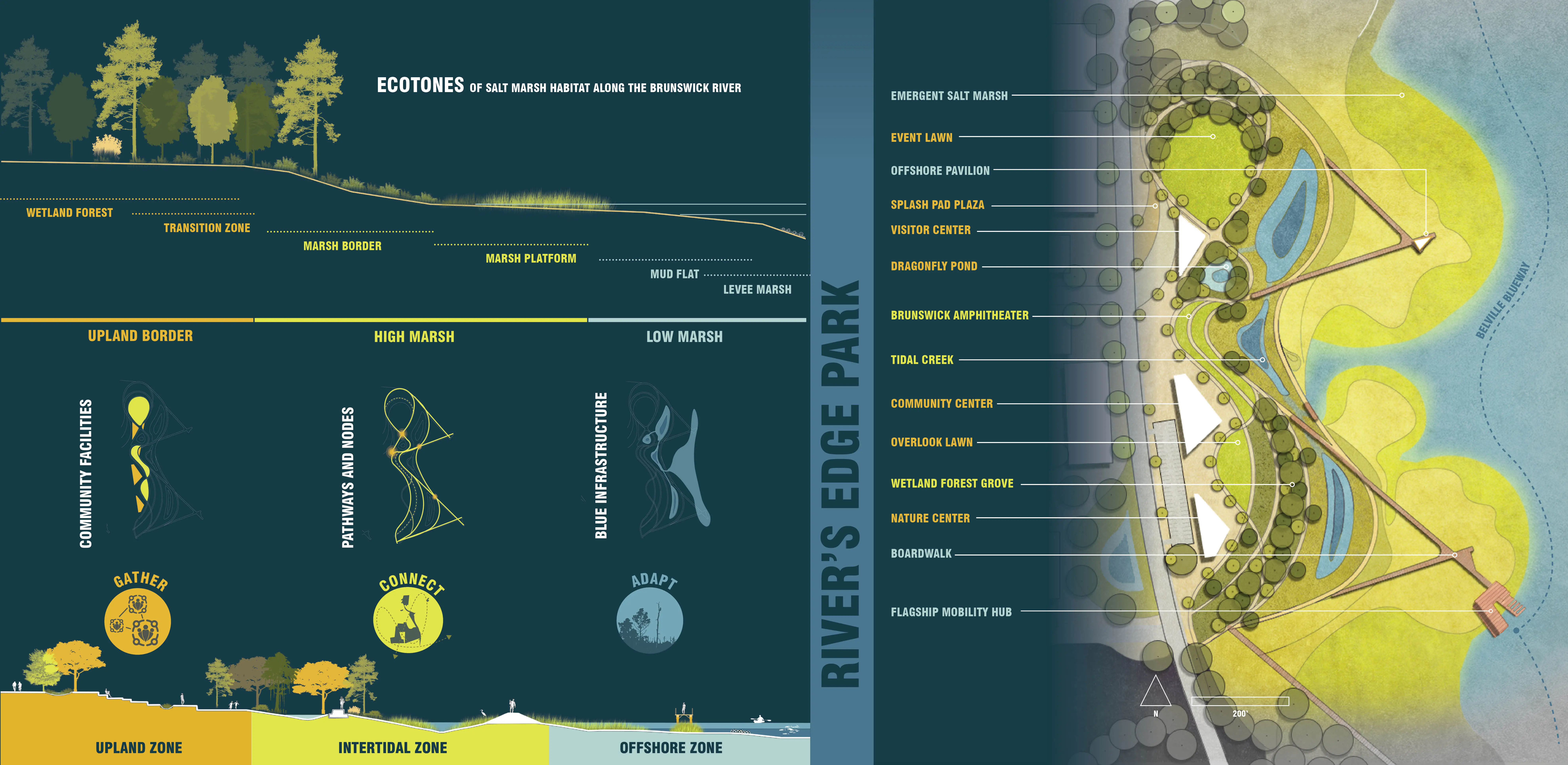 Inspired by the local salt marsh morphology, the River’s Edge Park is divided into three sections: Upland, Intertidal, and Offshore Zones. The Upland Zone offers gathering spaces with scenic river views. Meandering pathways lead to the Intertidal Zone, providing opportunities to explore the wetland forest and transitional salt marsh. The site’s Adaptive Breakwater doubles as a recreational trail until rising seas cause the marsh to envelop the trail. The breakwater will then serve as a key piece of resilient green infrastructure.
