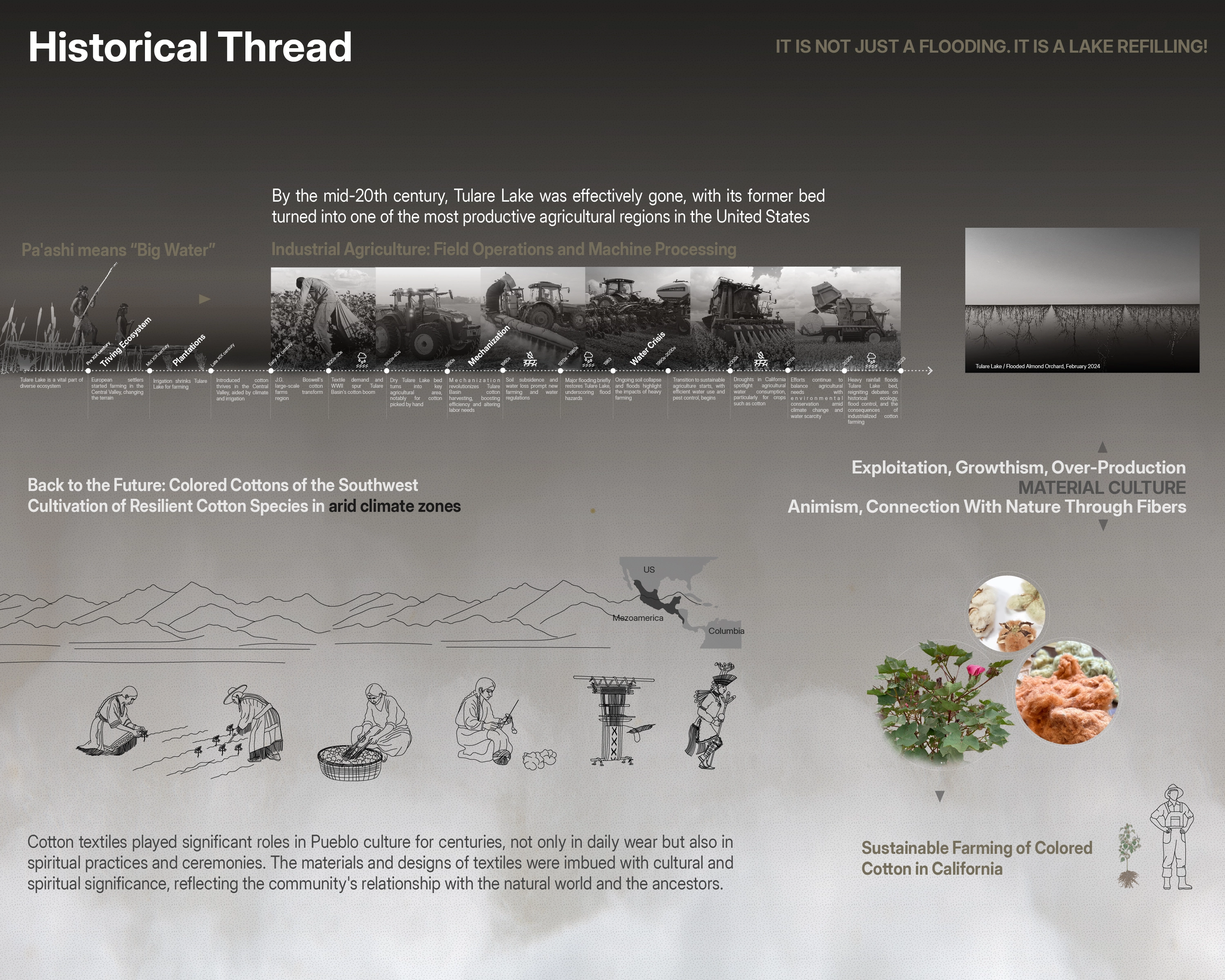 The project investigates the material characteristics of cotton, a key non-food crop with historical significance in the Tulare Lake basin. It addresses environmental imbalances caused by conventional farming and unsustainable water management and seeks sustainable approaches to restore the lake's ecosystem by focusing on material considerations and advocating for a material ecology approach.