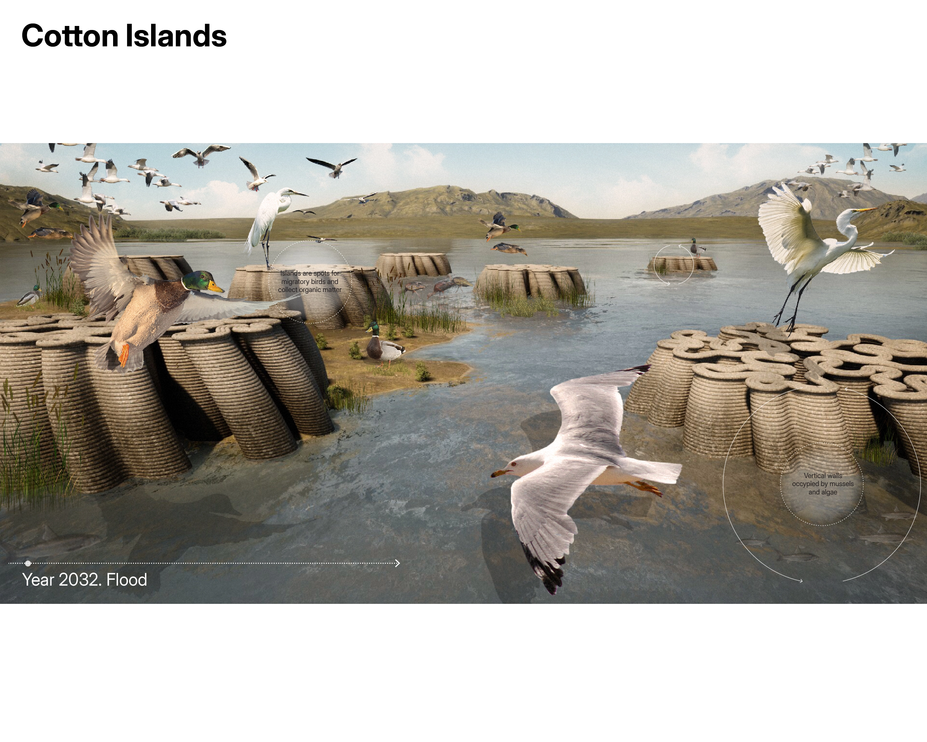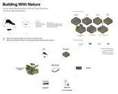 Proposed future scenarios for the lakebed envision a coexistence of water, humans, and other species, viewed from a material design perspective. On the right scale, biocomposites can recombine elements of this complex system.