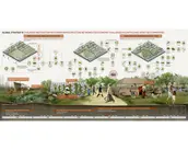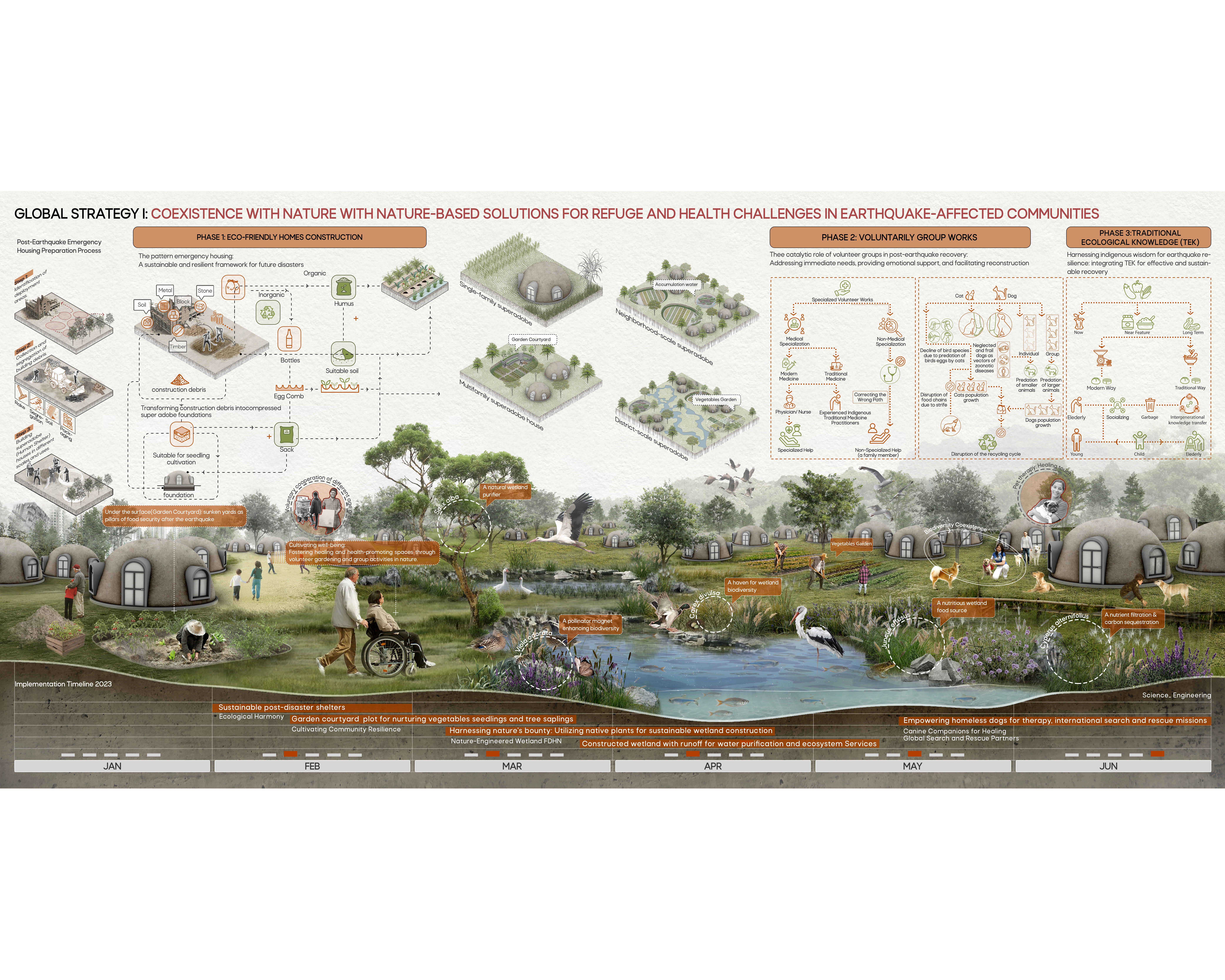 Global Strategy I: Coexistence with natureUsing low-tech superadobe structures and local materials compatible with nature, our design engages all volunteers: elders share wisdom, youth contribute effort, and experts offer proficiency. This fosters a sense of identity. We've turned limitations into potentials: animal shelters protect pets and prevent strays from disturbing waste management, while waste creates nurseries that provide food.