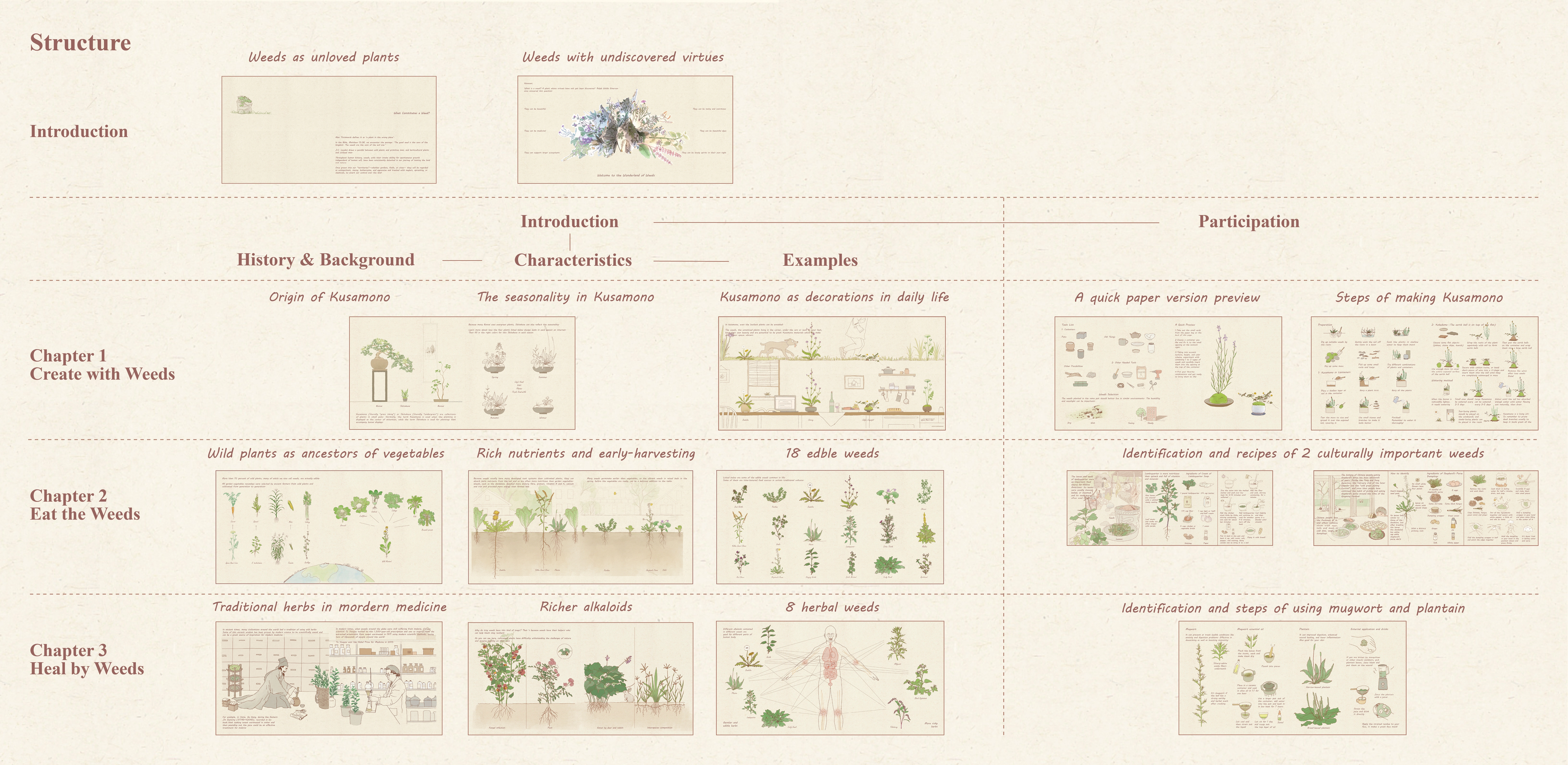 Consequently, Wonderland of Weeds serves as an experiment and a response. Wonderland of Weeds is an interactive picture book of Boston's spontaneous plants with a toolkit included, targeting teenagers from 12-18 years old. By attracting teenagers to interact with these unloved plants and get their hands dirty, the content aims to help them learn more about weeds and their unique values, encouraging each domestic garden to become more eco-friendly.