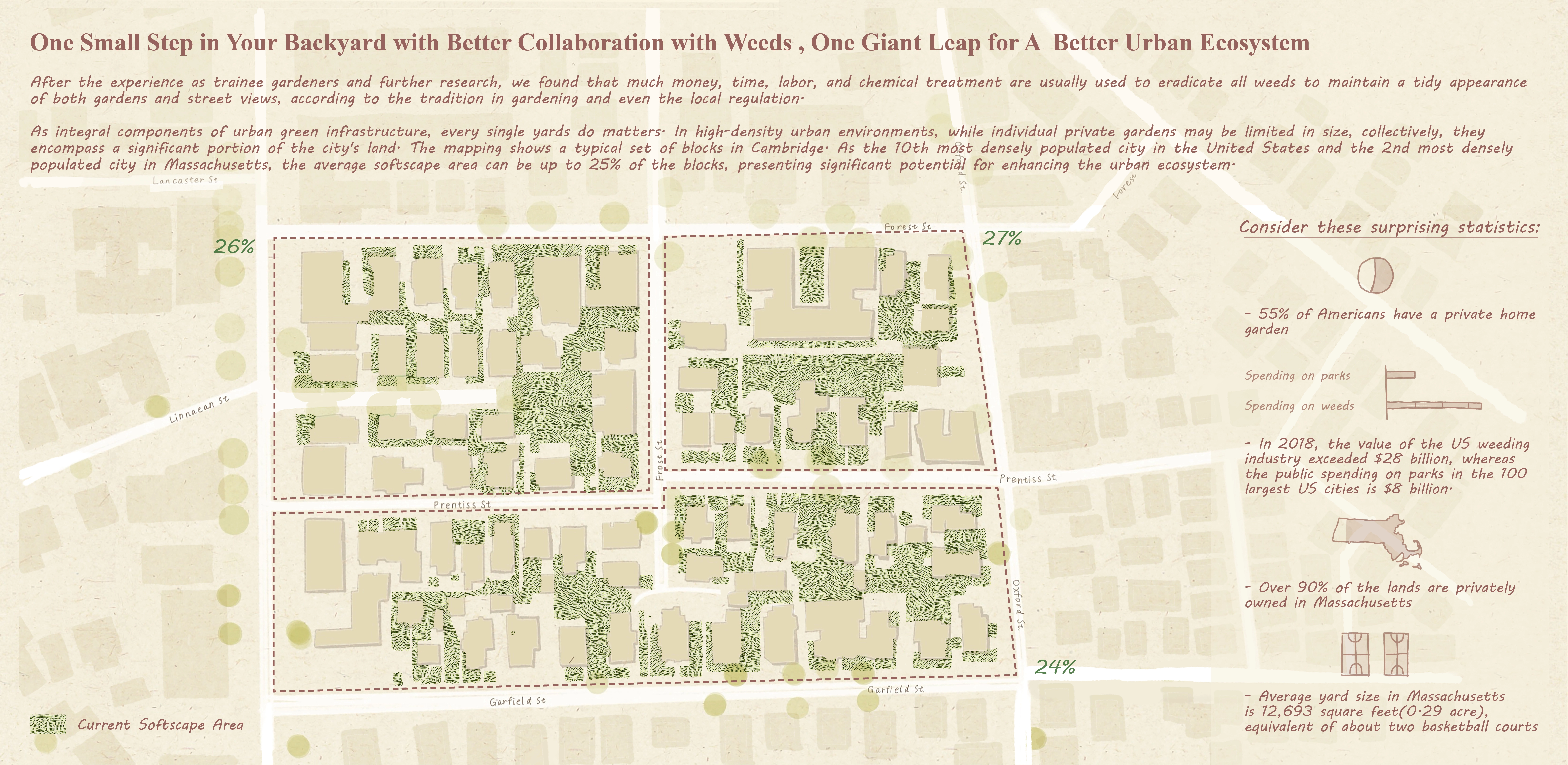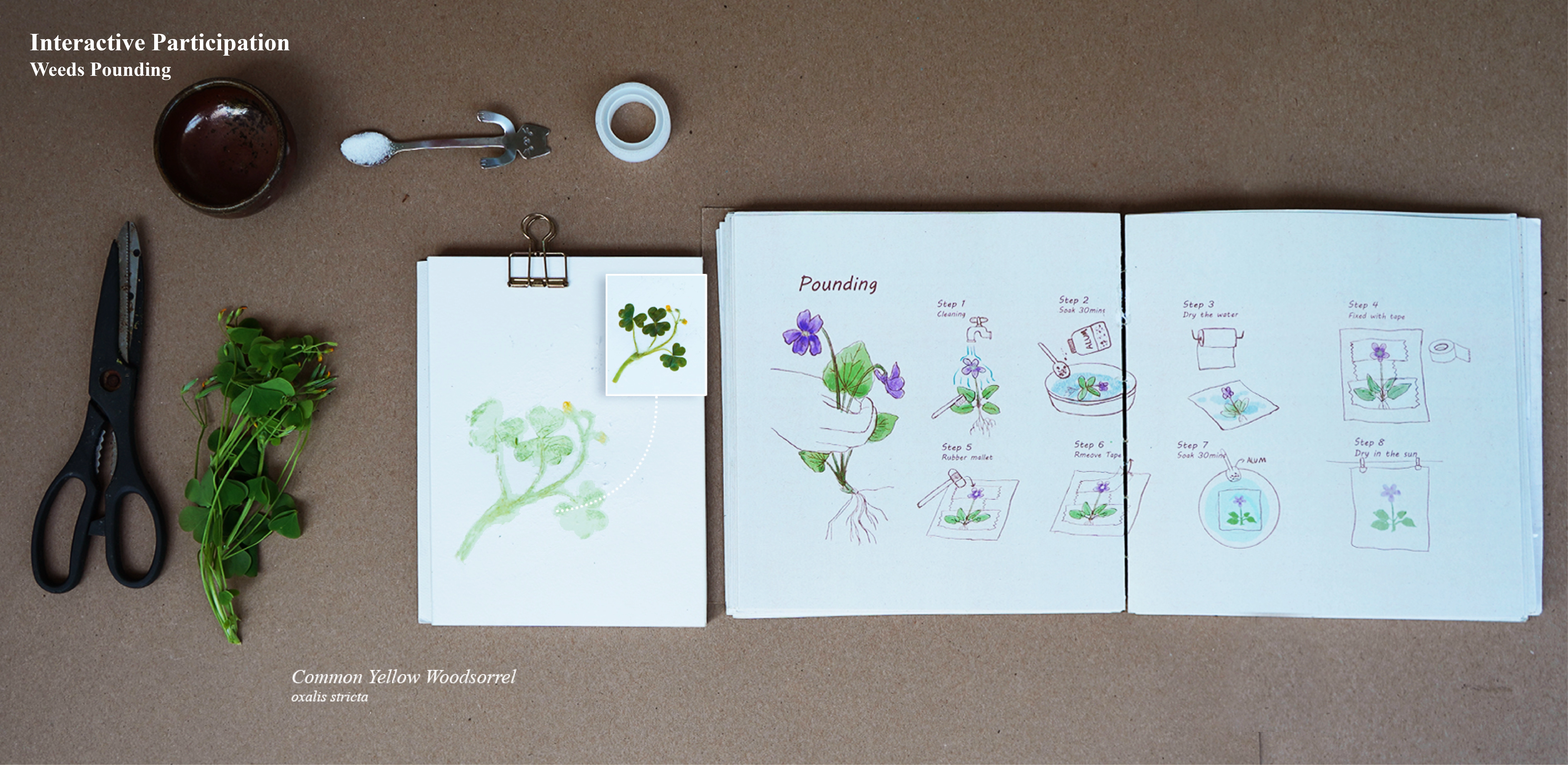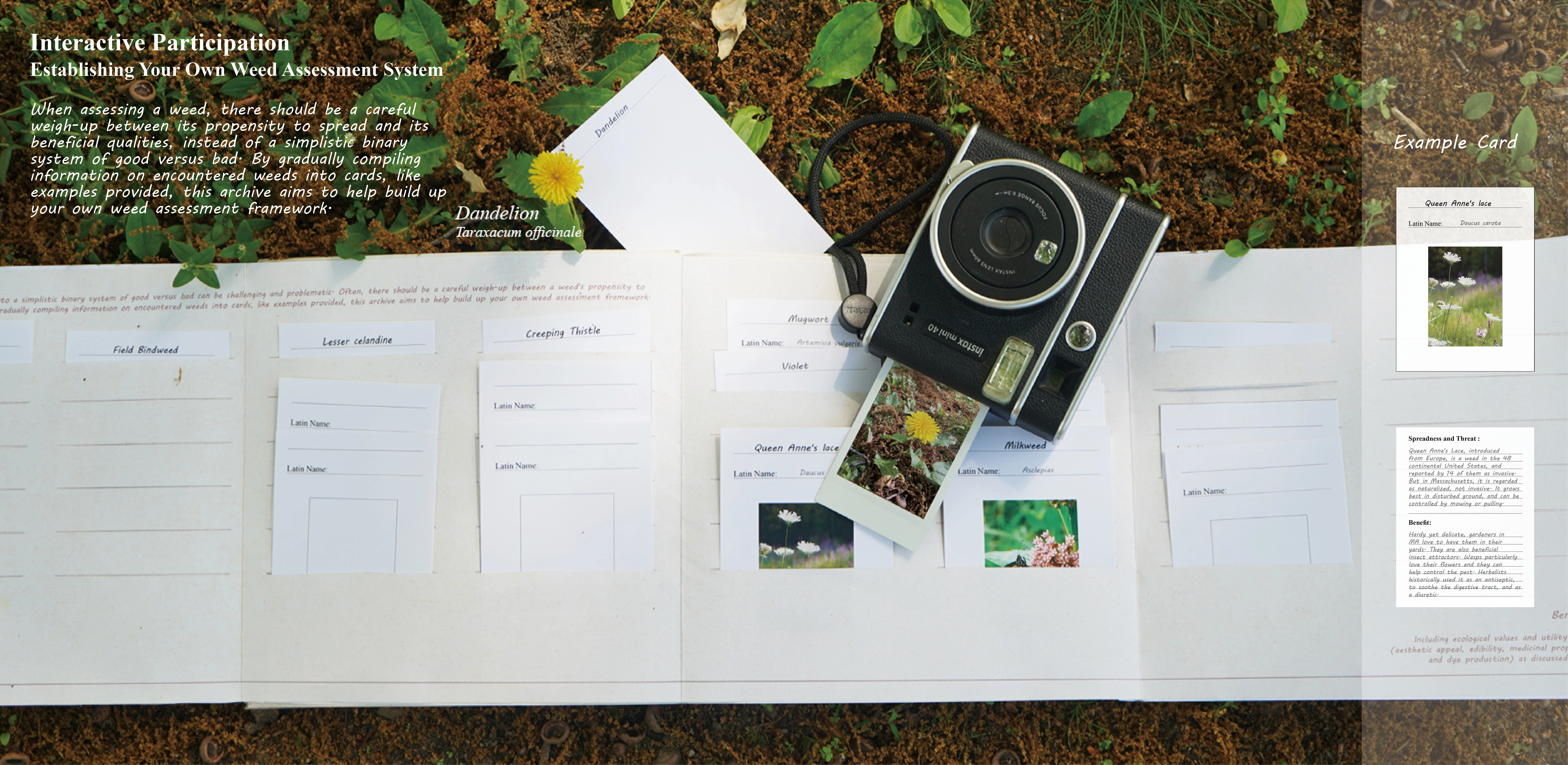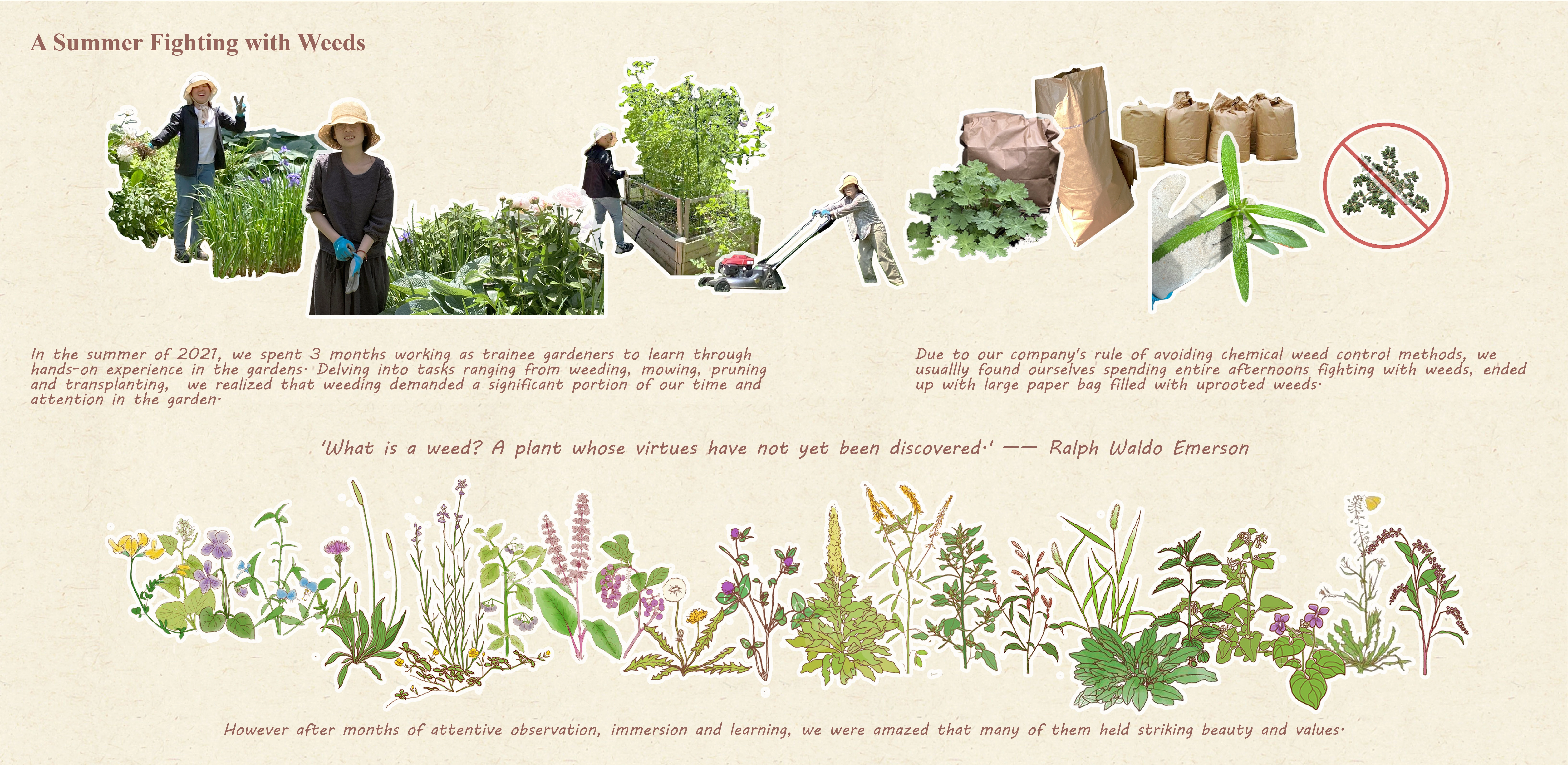 Spontaneous plants, better known as weeds, can be defined as resilient plants that grow anywhere without humans' help. According to the tradition in gardening and even the local regulation, much money, time, labor, and chemical treatment are used to eradicate all weeds to maintain a tidy appearance of both gardens and street views, which is highly resource-intensive, unhelpful, or even harmful to our urban ecosystem. Received recent attention from ecological and landscape academia but still deemed as aggressive and dominant by the general public, the weeds have surprising ecological values and aesthetic potential, in fact, which requires careful selective management. They can help make the gardens filled with delicate cultivated plants more vibrant and resilient in front of different threats. Thus, how can designers help alter the public consciousness of spontaneous plants, which can contribute to a more resilient and healthy urban ecosystem in a bottom-up manner?