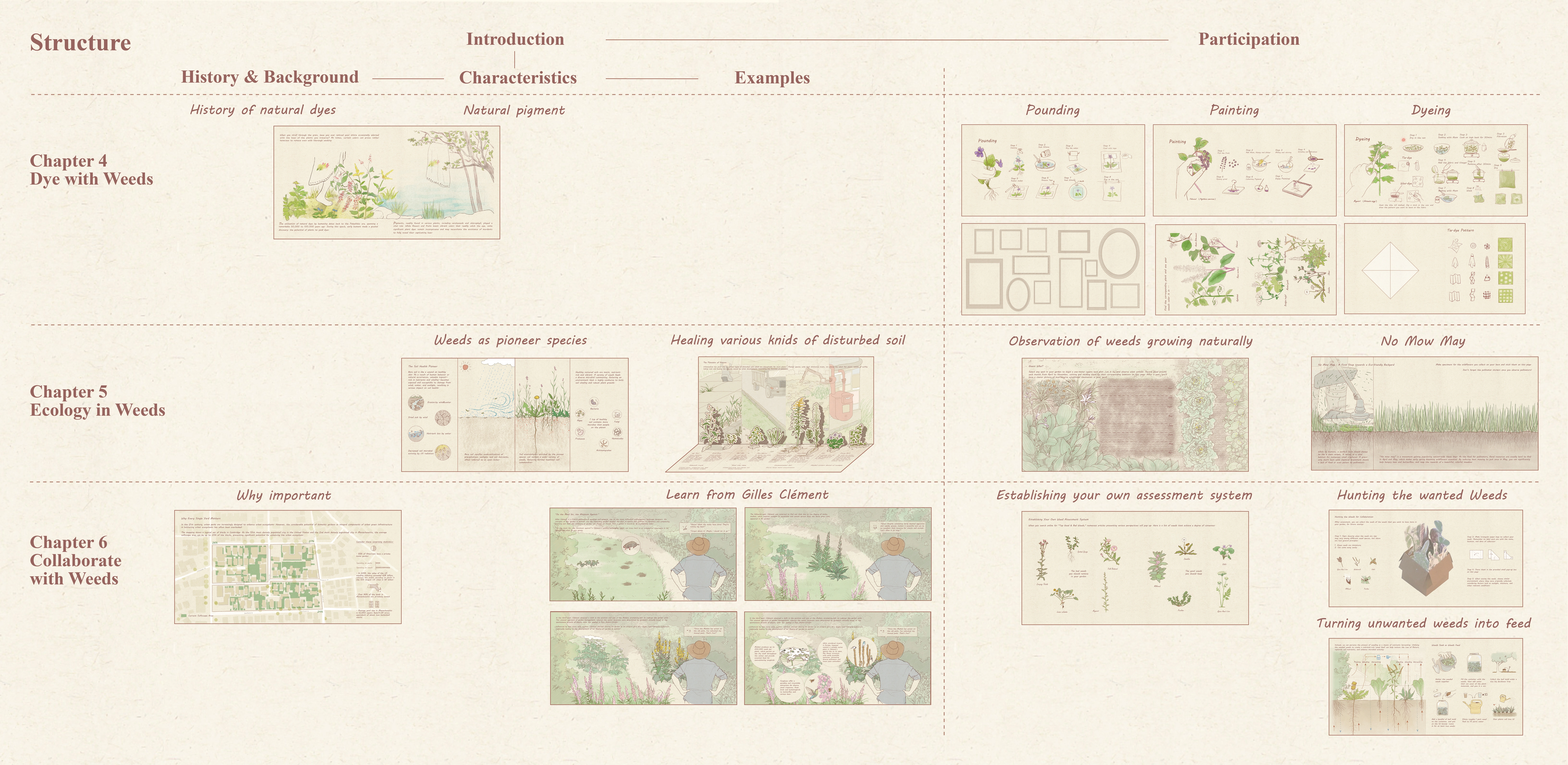 As important components of urban green infrastructure, the ecological potential in domestic gardens is not taken seriously by the landscape architecture academia nowadays. The widely used methods of weed control are highly resource-intensive, unhelpful, or even harmful to our urban ecosystem. By targeting teenagers who are more open to new perspectives and will become future garden owners, our picture book Wonderland of Weeds is an exploration of the participatory medium to help the public equipped with enough interest, awareness, knowledge, and skills to start managing weeds in a better way so that individual gardens can contribute to the overall urban ecosystem.