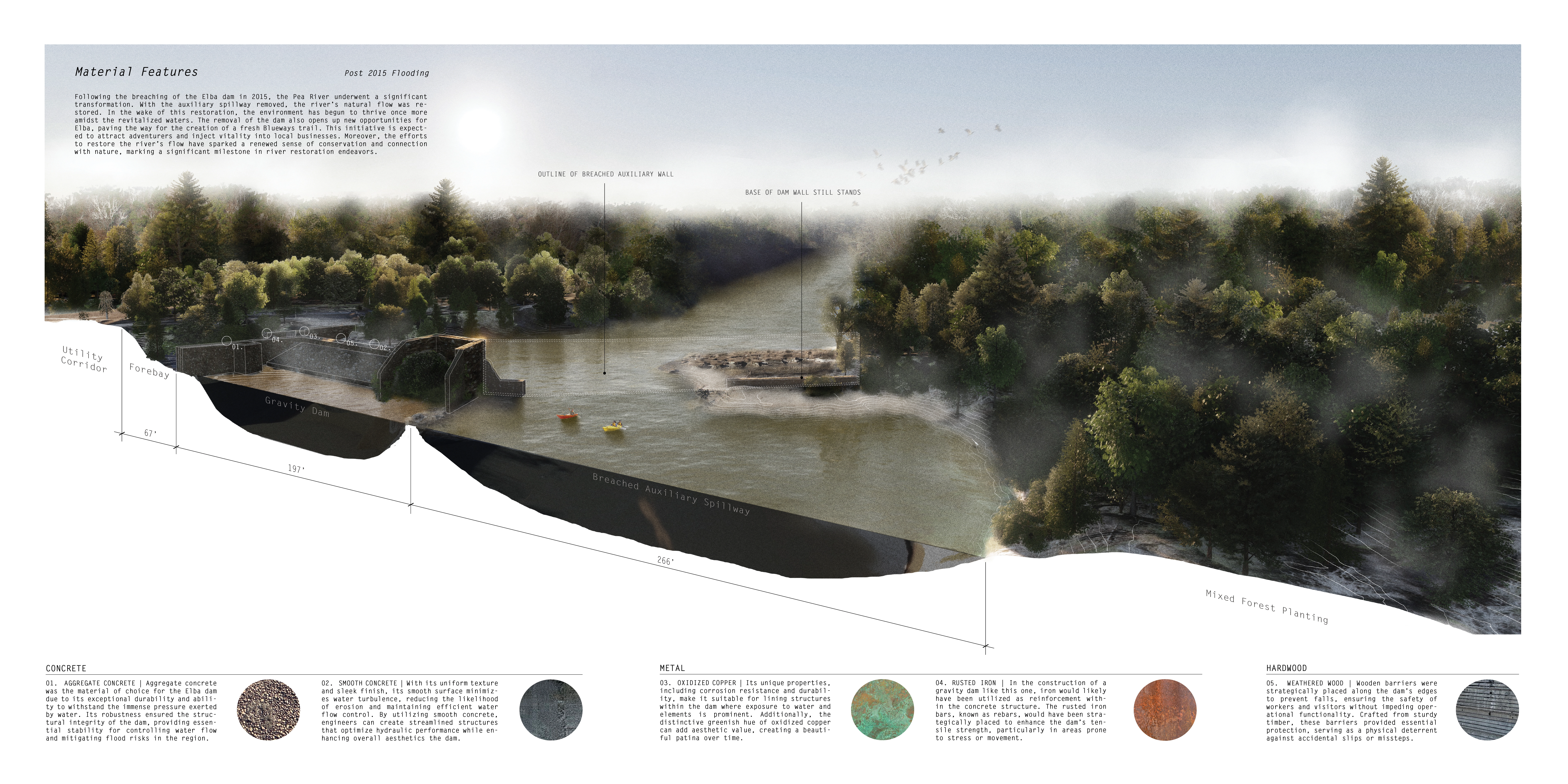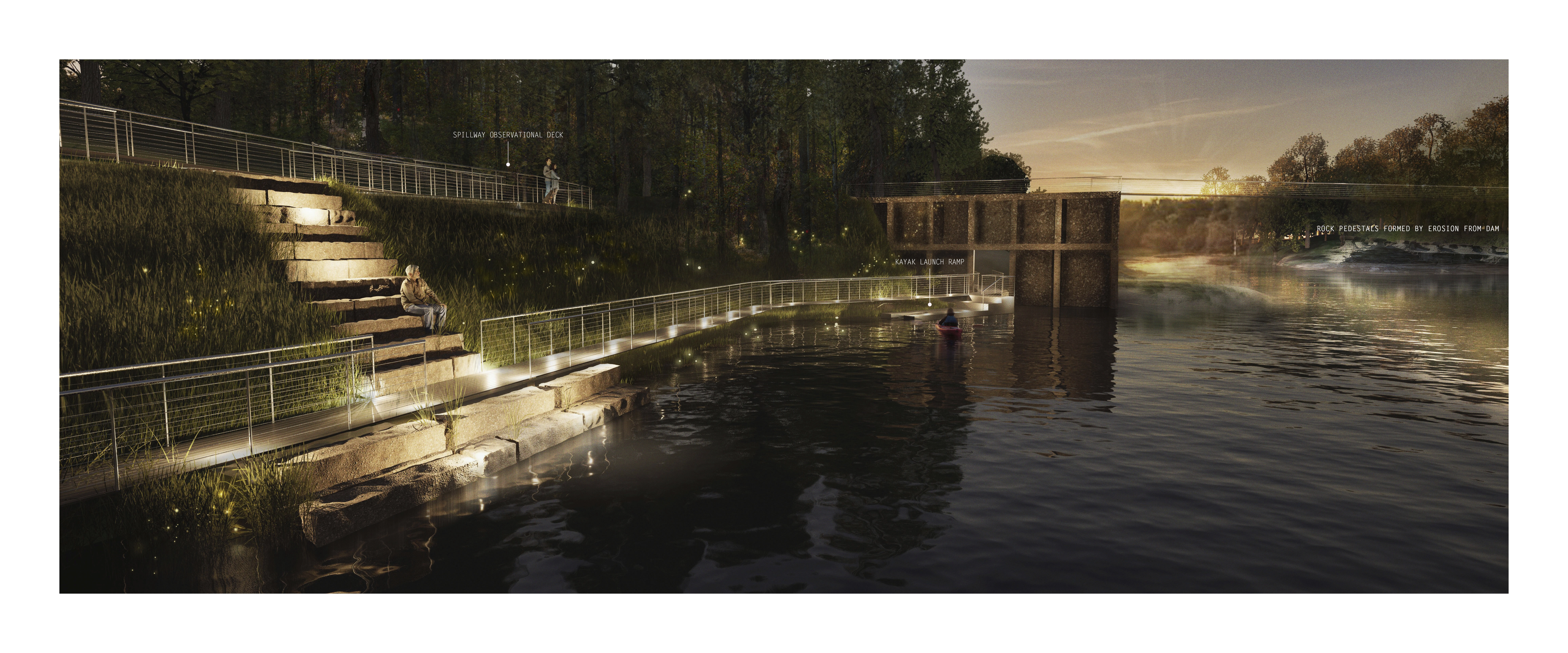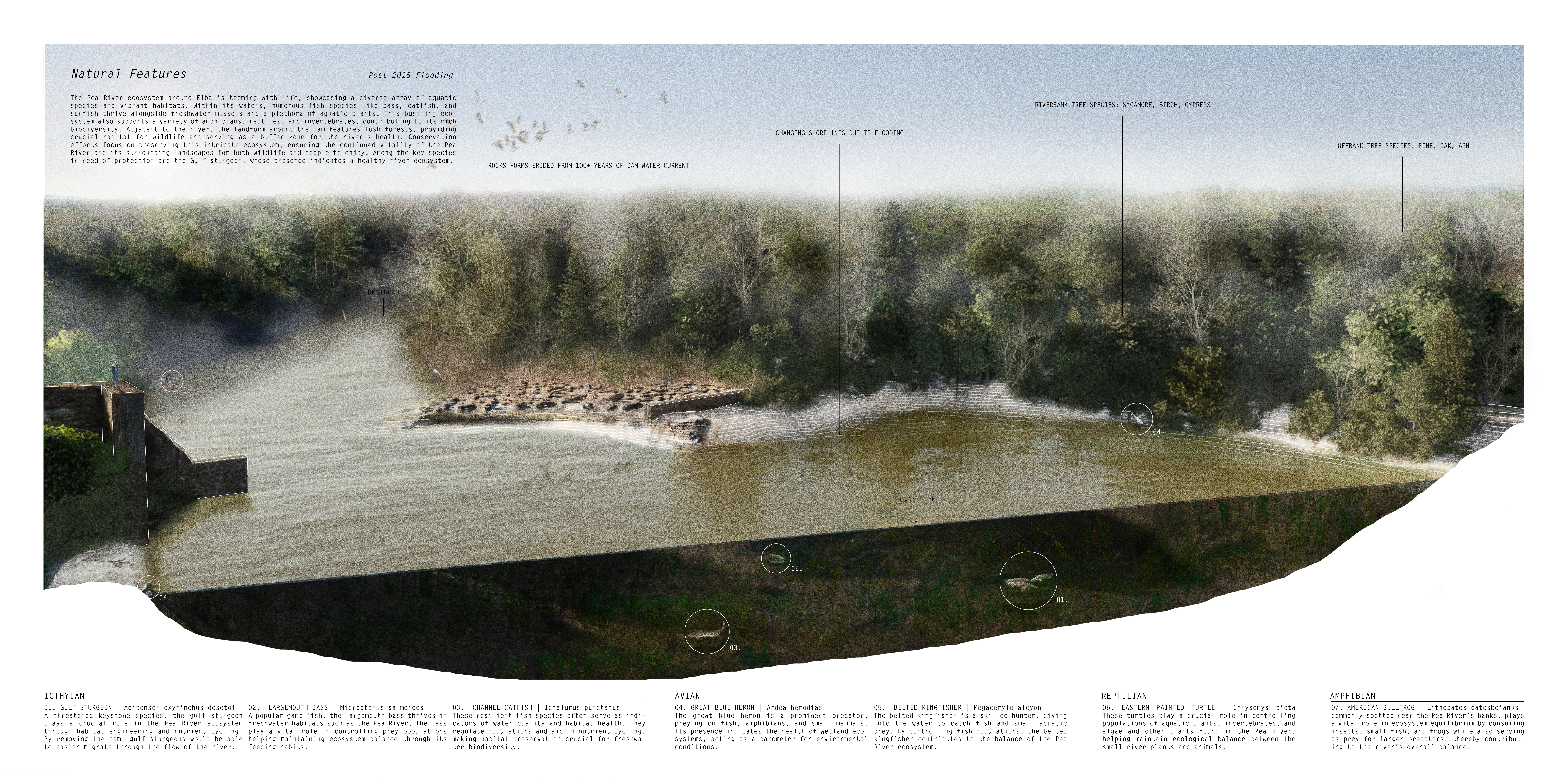 The revitalization of the Elba Dam honors the site’s historic structures, preserving them as living reminders of the role they played in powering the local communities of Elba, Troy, and Dothan until the dam’s decommissioning in 2015.This project seeks to transform the overgrown inaccessible hydroelectric dam into an engaging, accessible space that immerses viewers in a landscape reminiscent of past technological achievements. The design proposes for the removal of the dam to enhance environmental protection and bolster community resilience. Removing the spillway projects a 29% increase in access to critical habitat types utilized by threatened and endangered fish and mussel species, while also mitigating future flood risks in Elba.